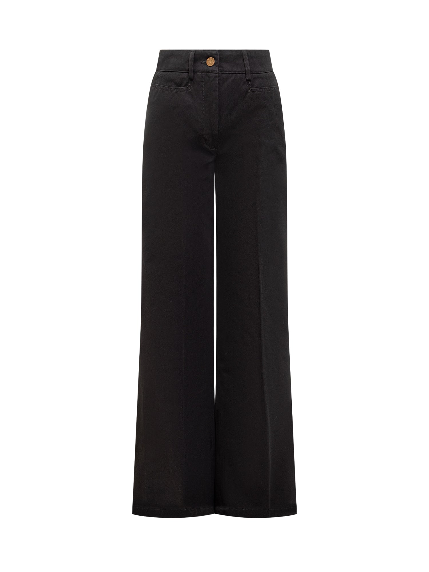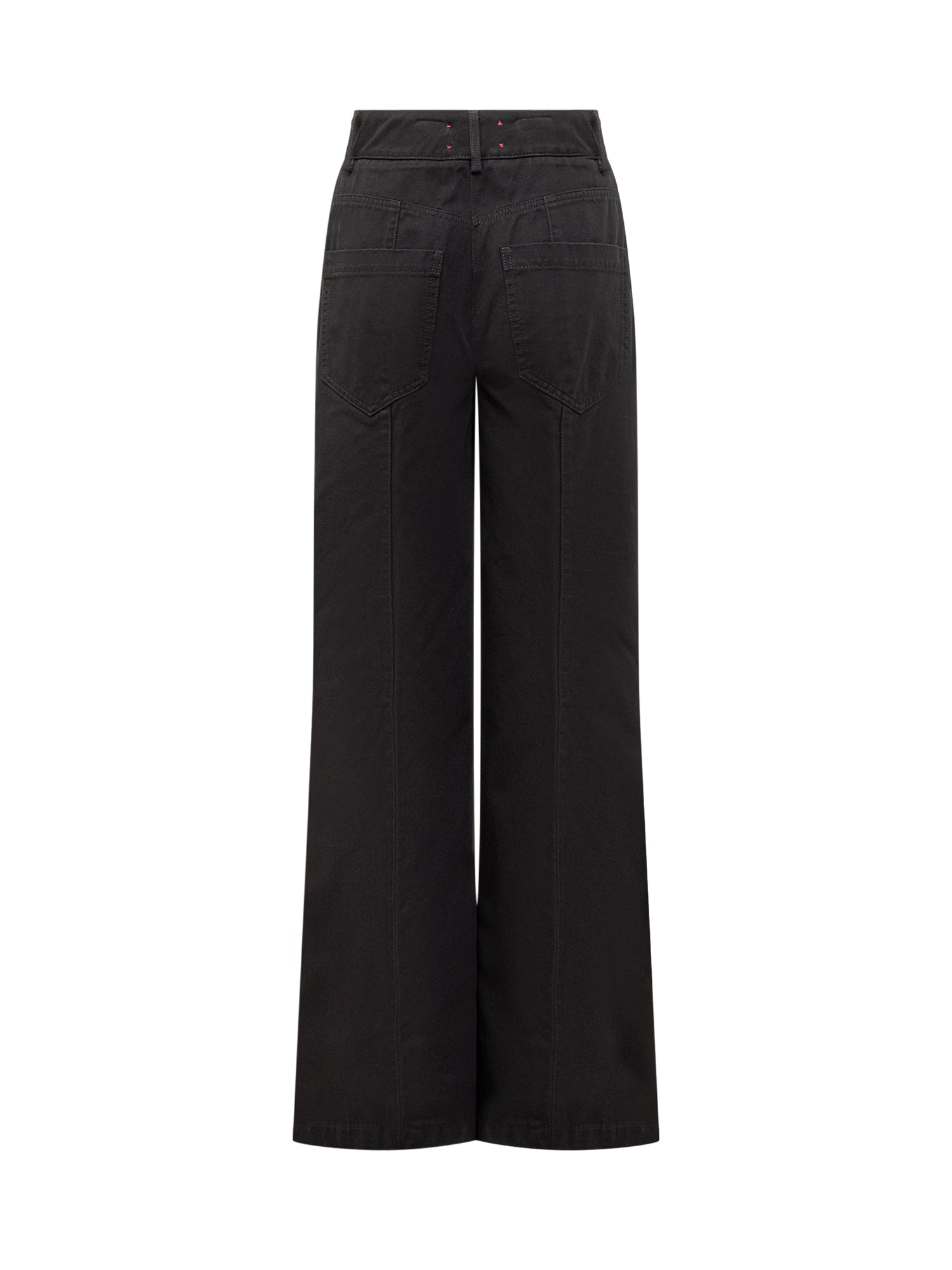 Long flared pants. Button and zipper closure. Belt loops. Four pockets.