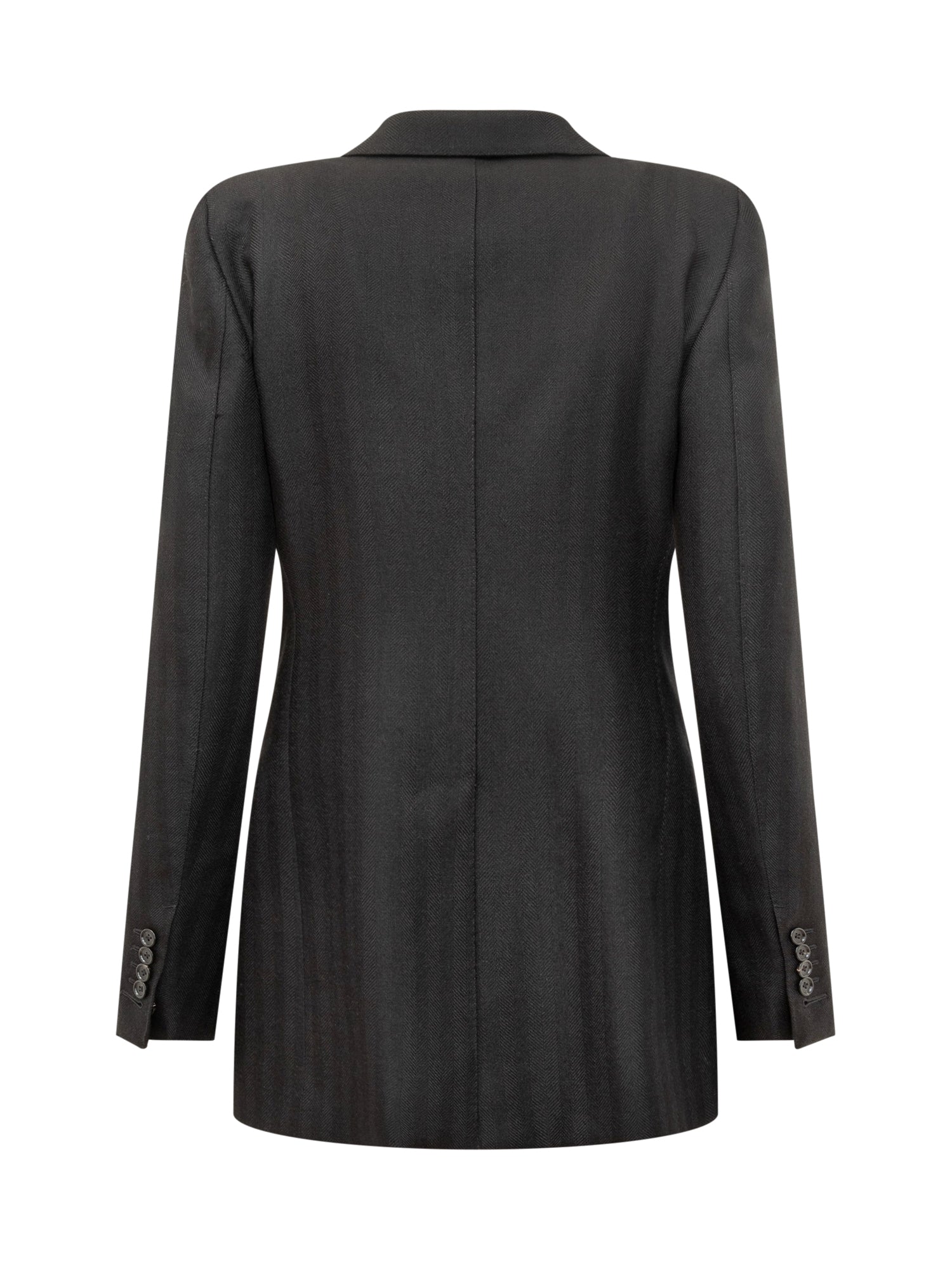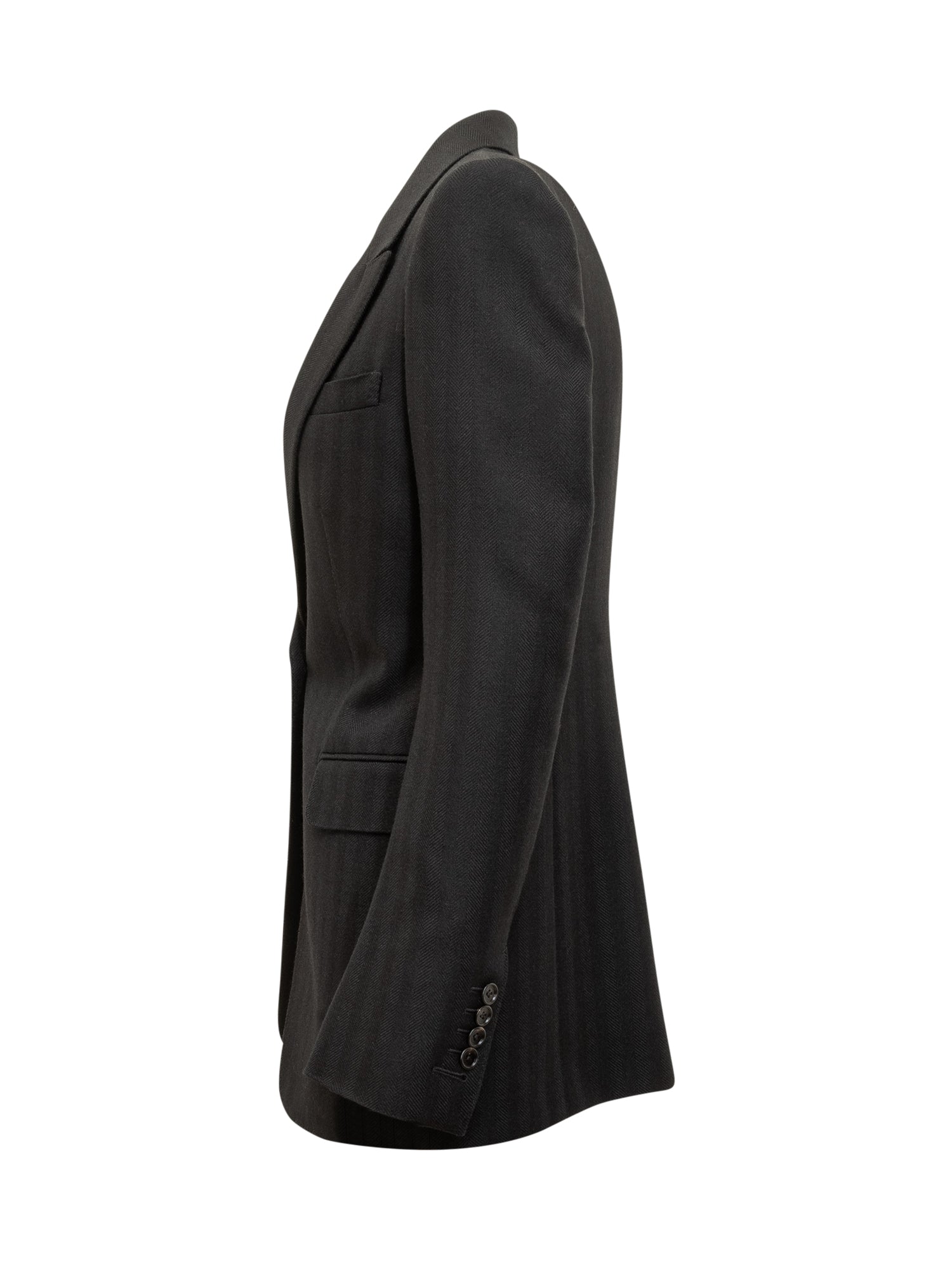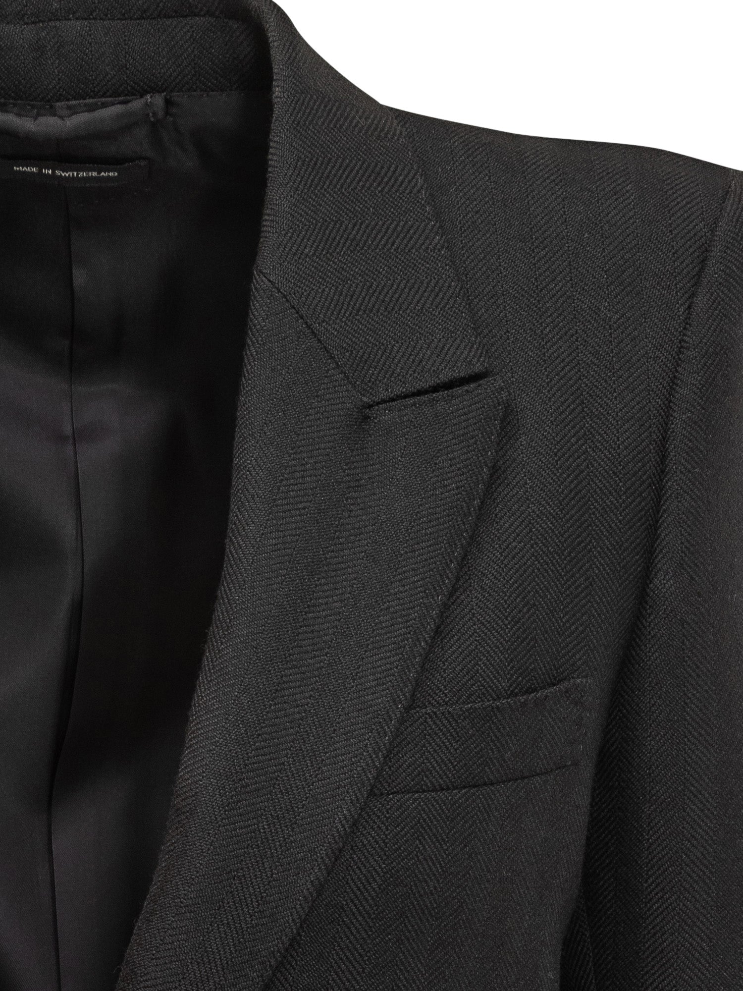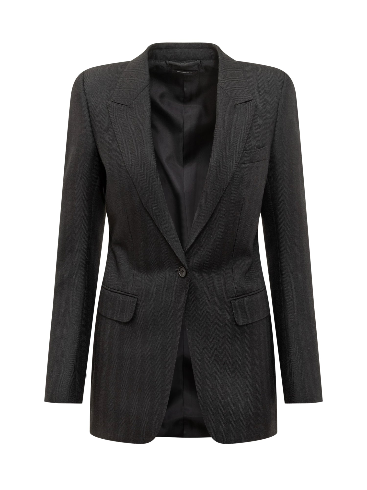 Tom Ford black wool blazer featuring a single button closure and tailored fit. Classic lapels and sleek silhouette deliver timeless elegance.