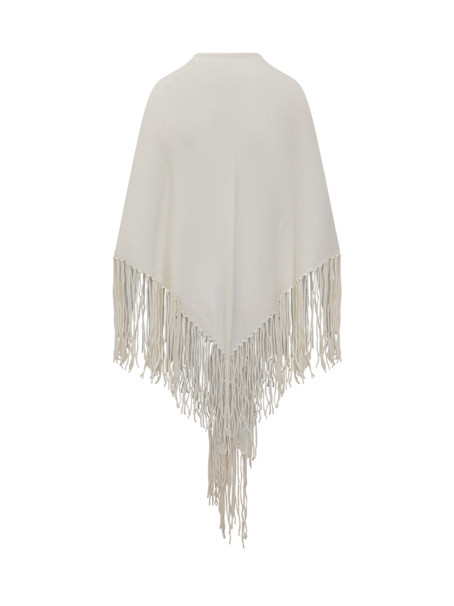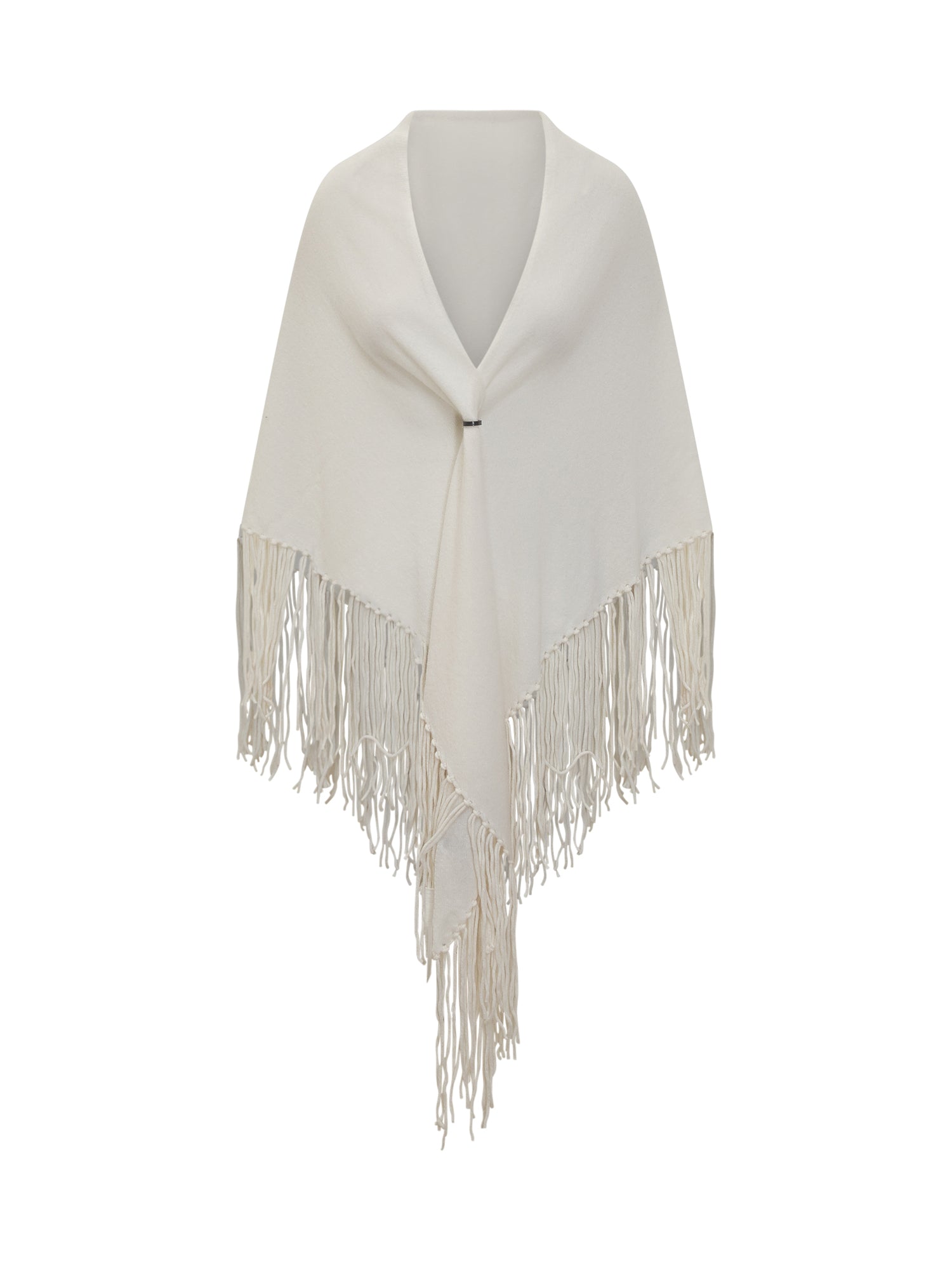 Vanise ivory cashmere poncho with long fringes and subtle front closure.