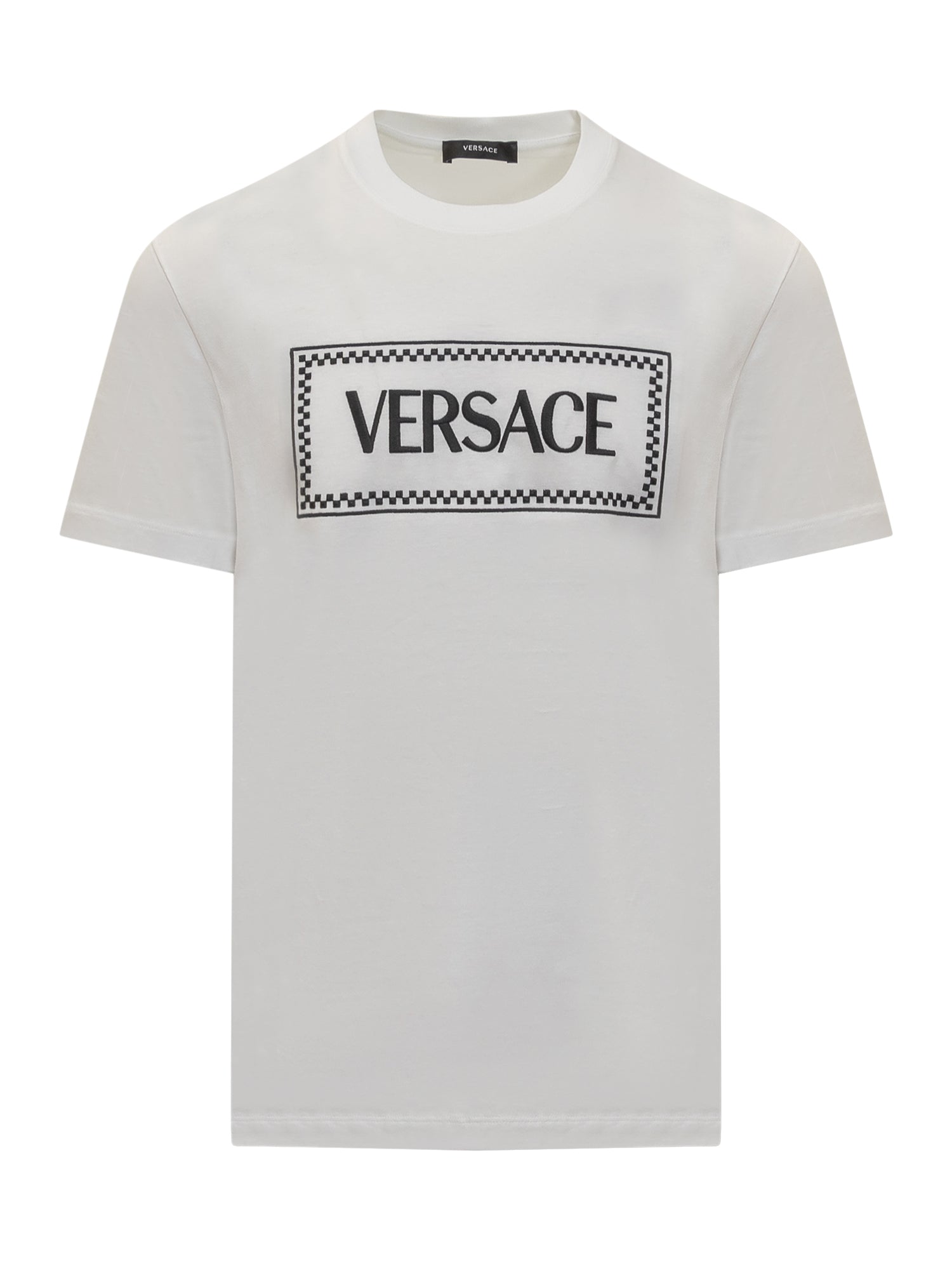 Short-sleeved T-shirt. Crew neck. Ribbed hems. Versace logo printed on the front.