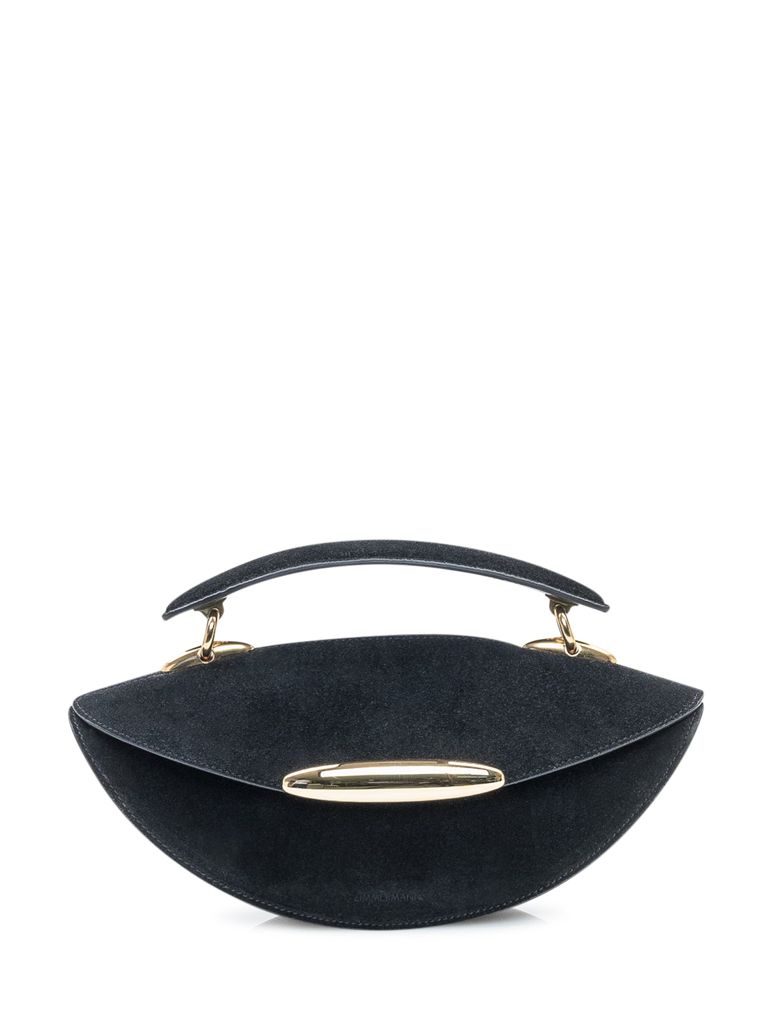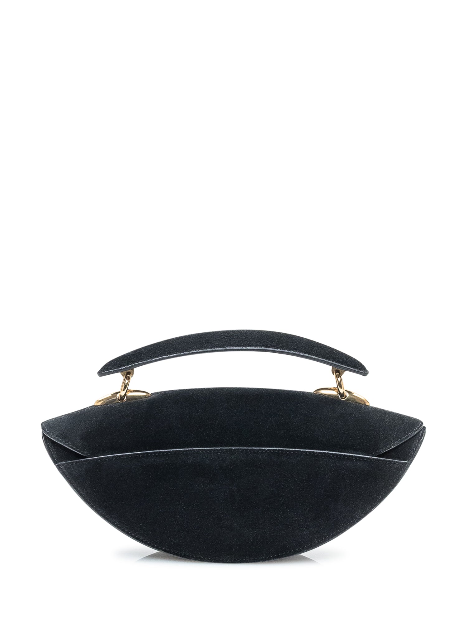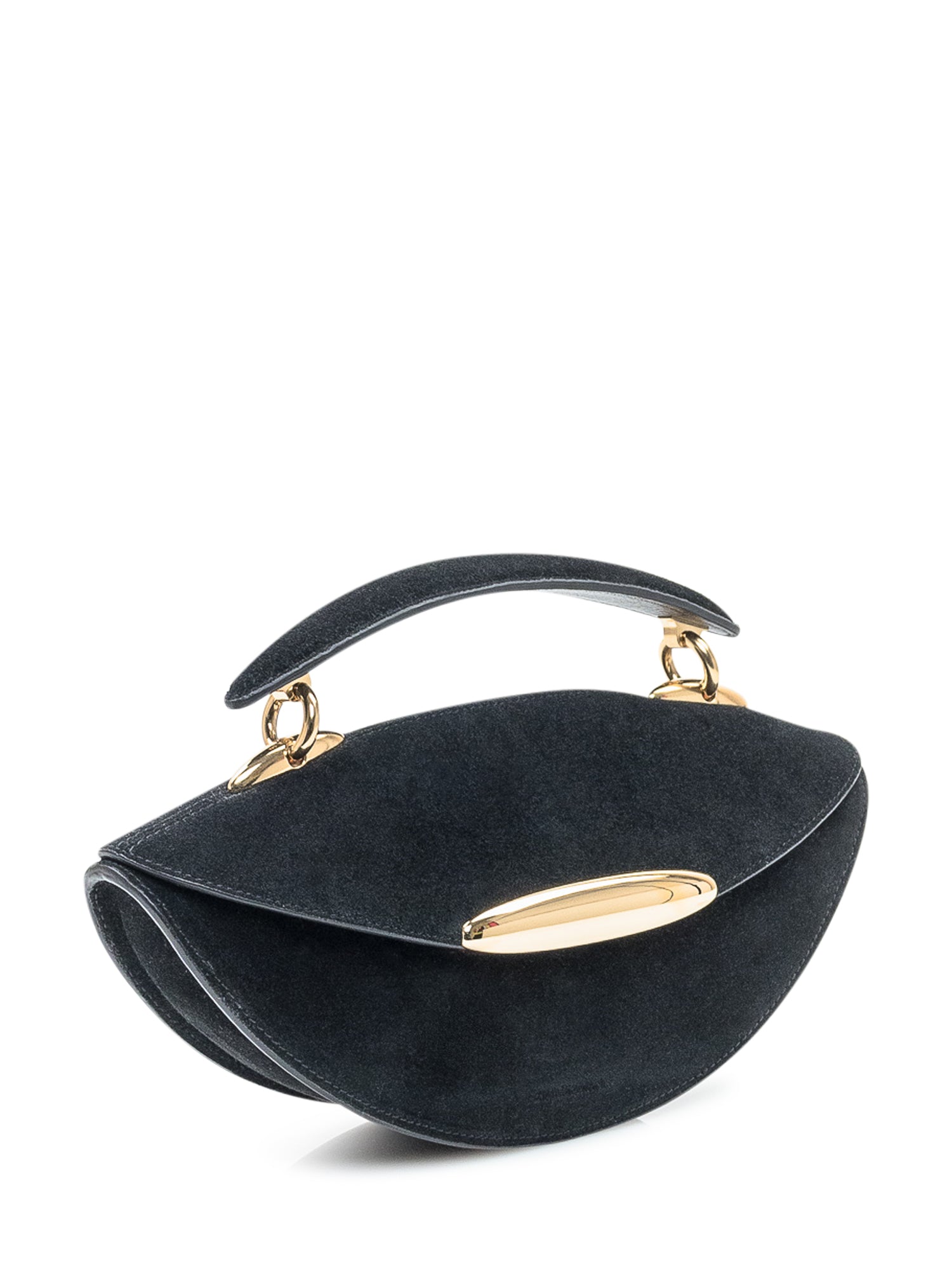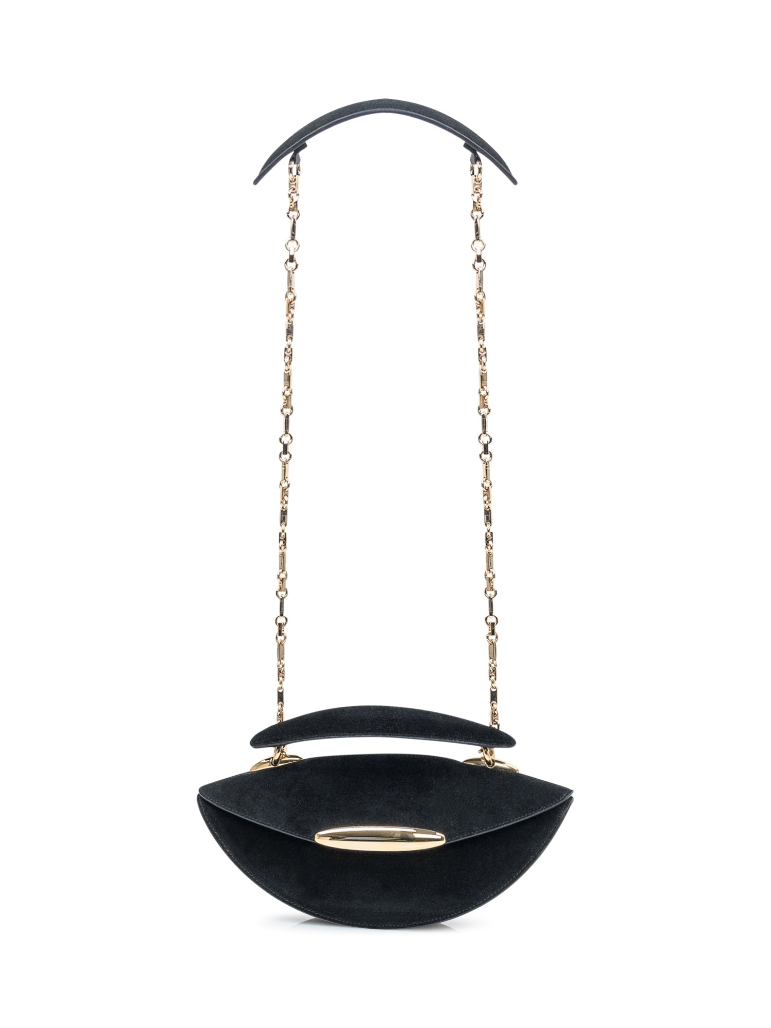 Zimmermann Wavelength Top Handle bag in black suede with gold chain and sculptural design. Elegant and contemporary.