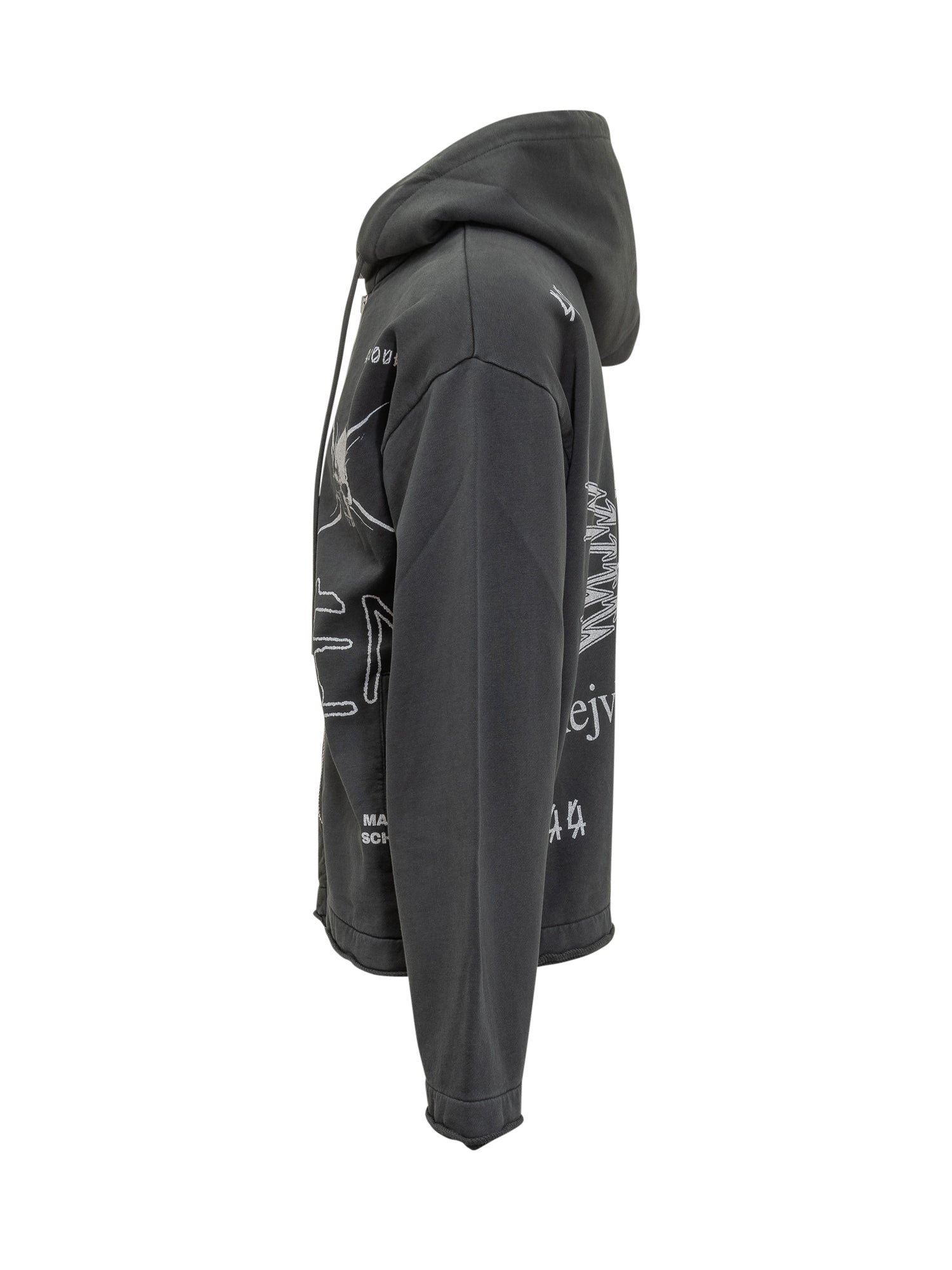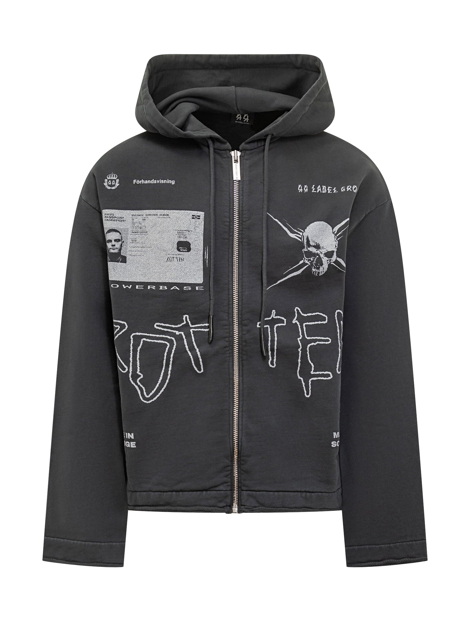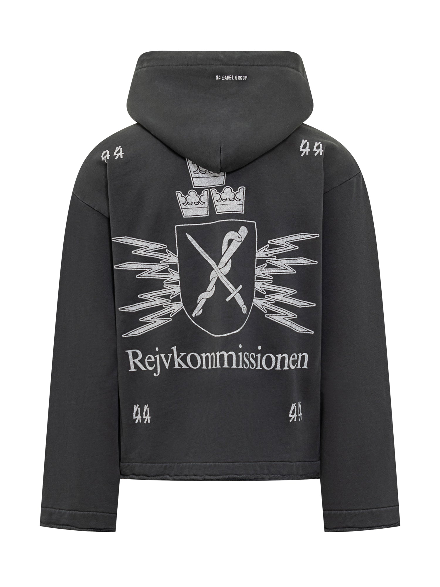 44 Label Group black hoodie with adjustable hood, zip closure and graphic prints.