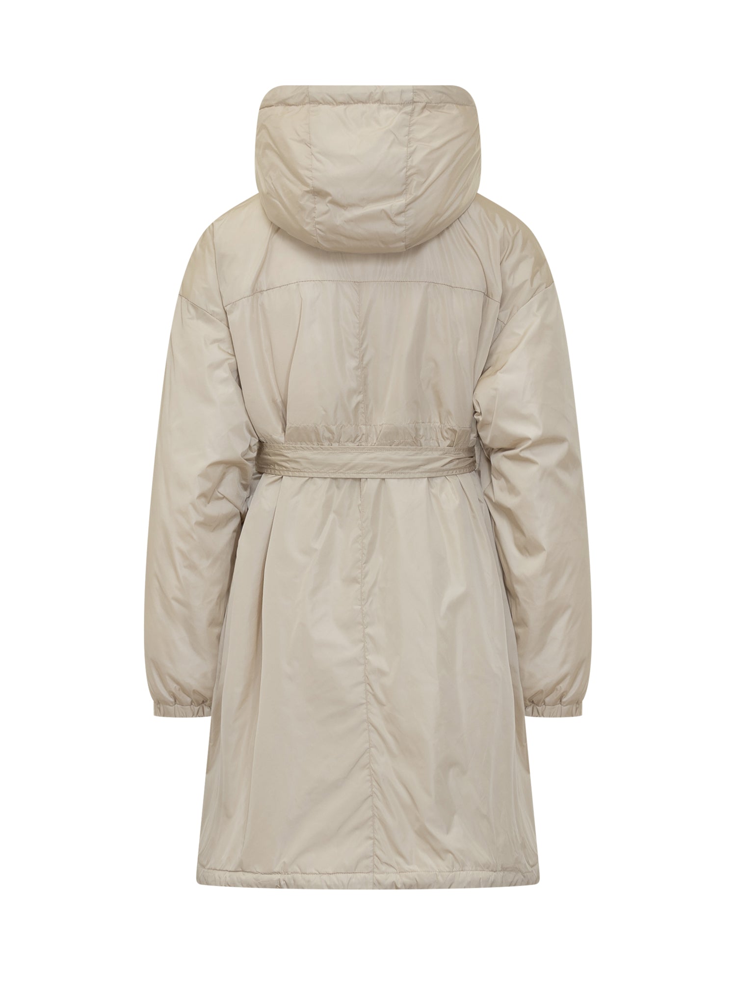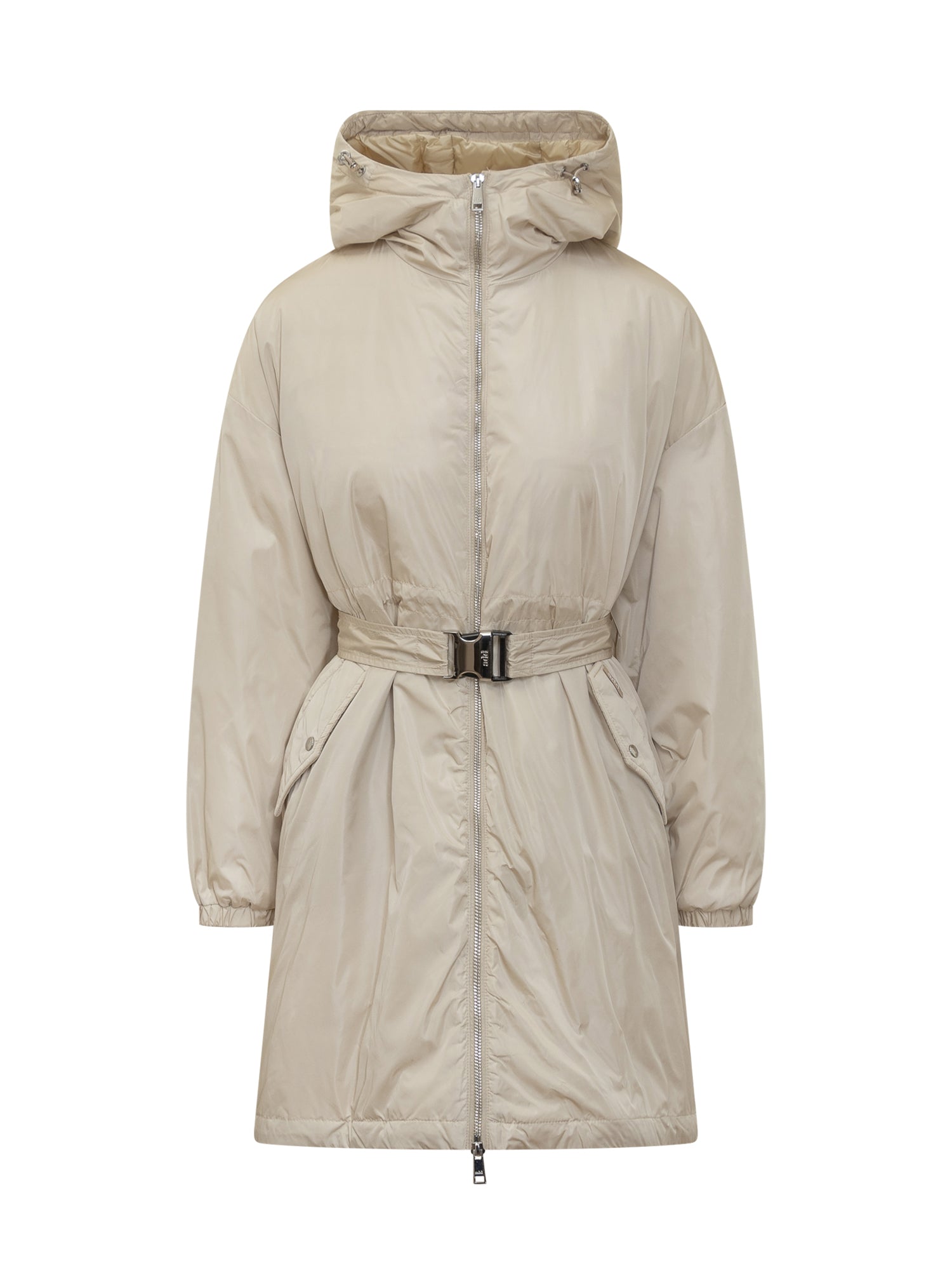 Add beige parka with adjustable hood, front zip closure, and metallic buckle belt.