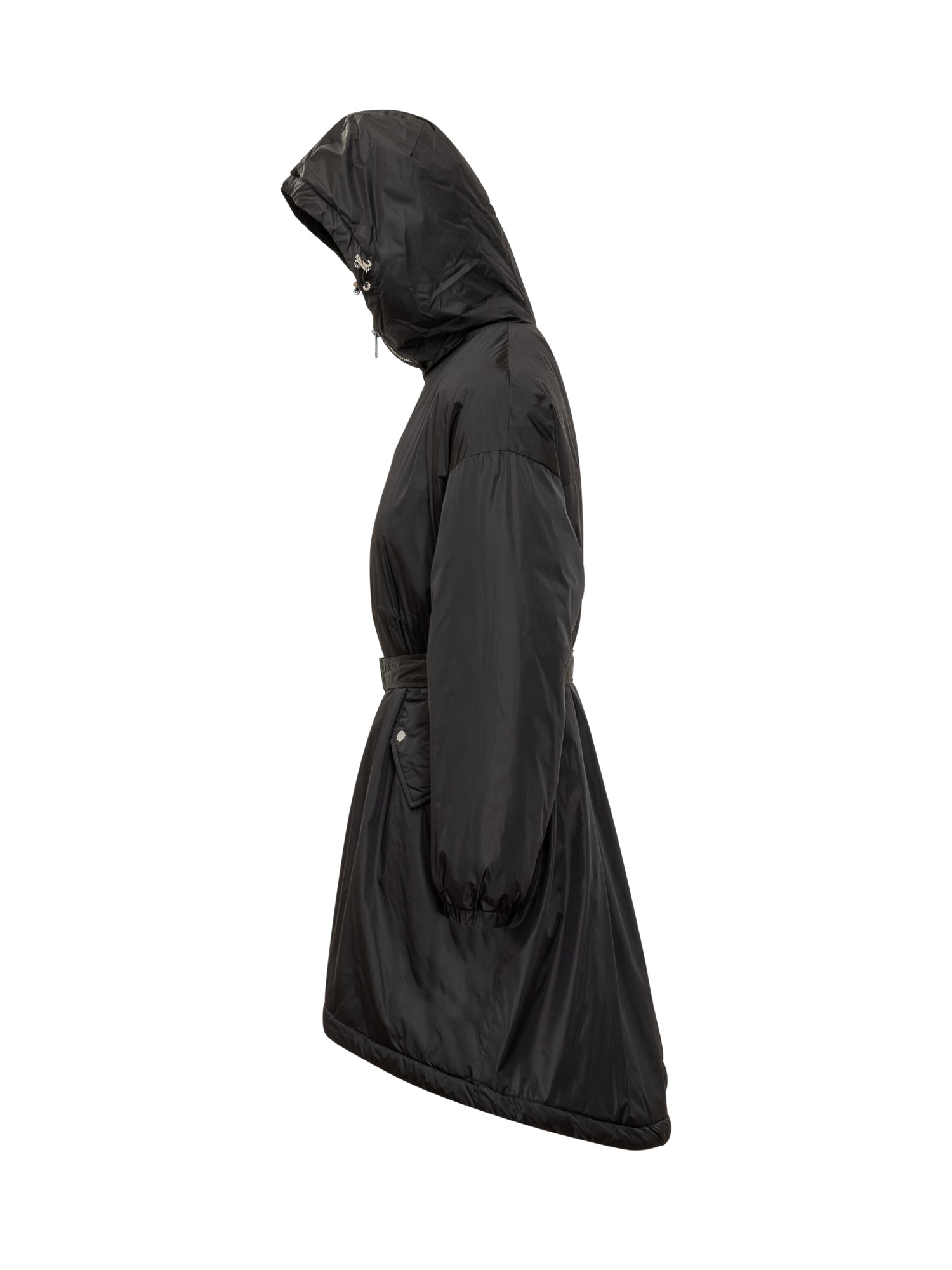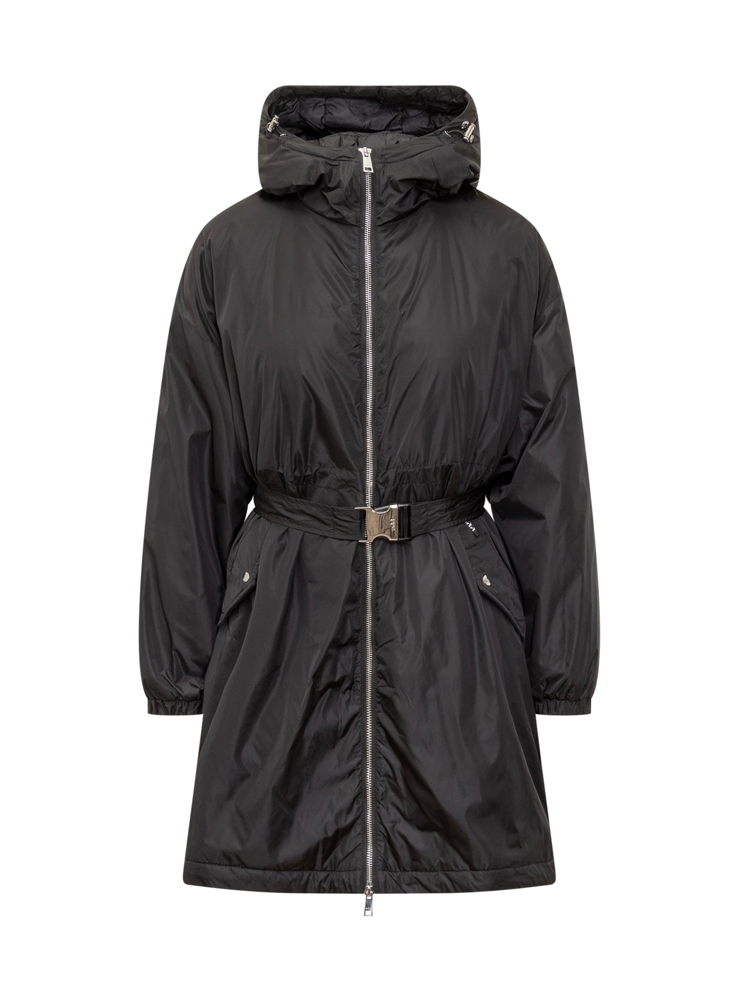 Add black parka with adjustable hood, front zip closure, and waist belt with metallic buckle.