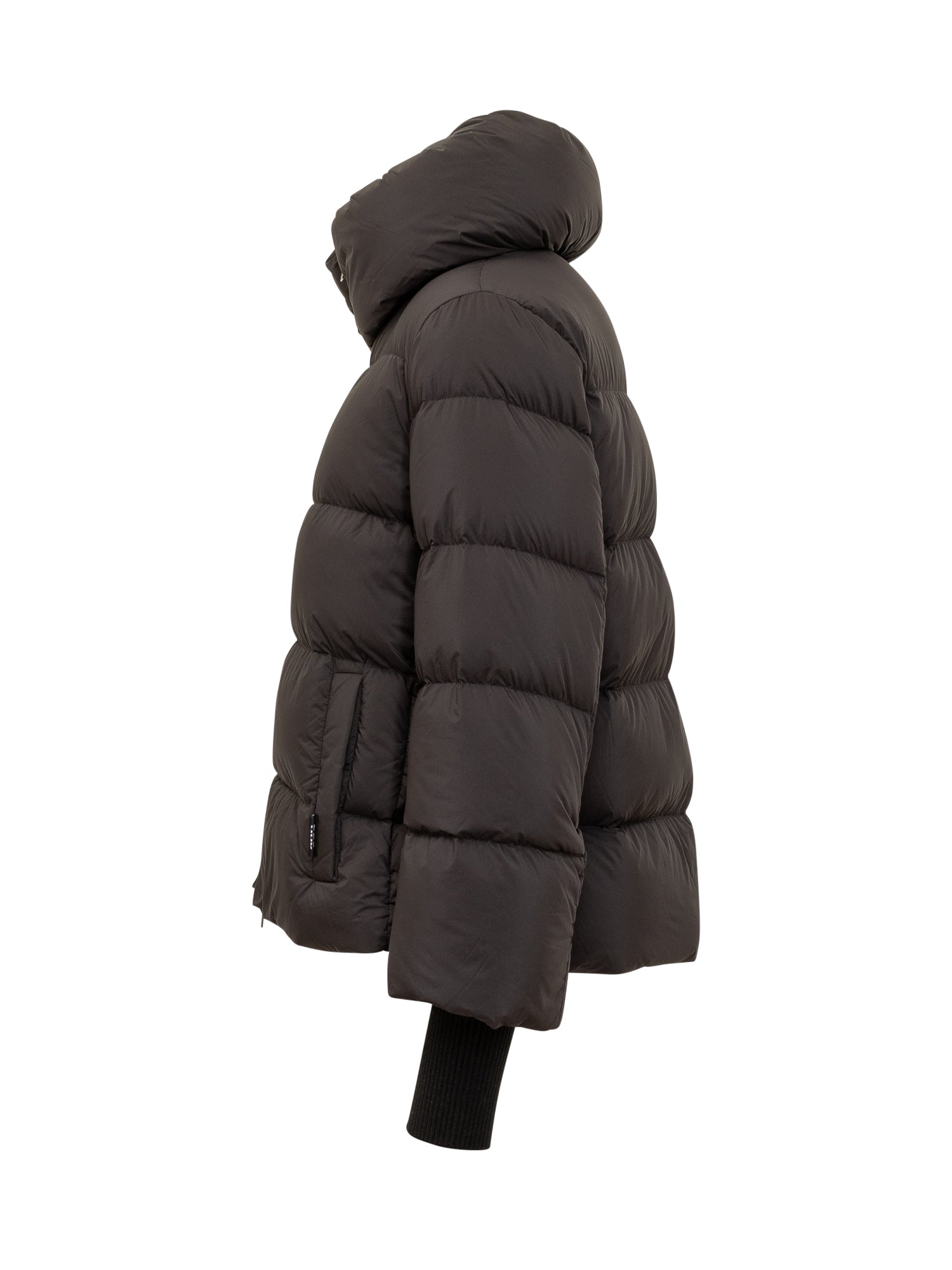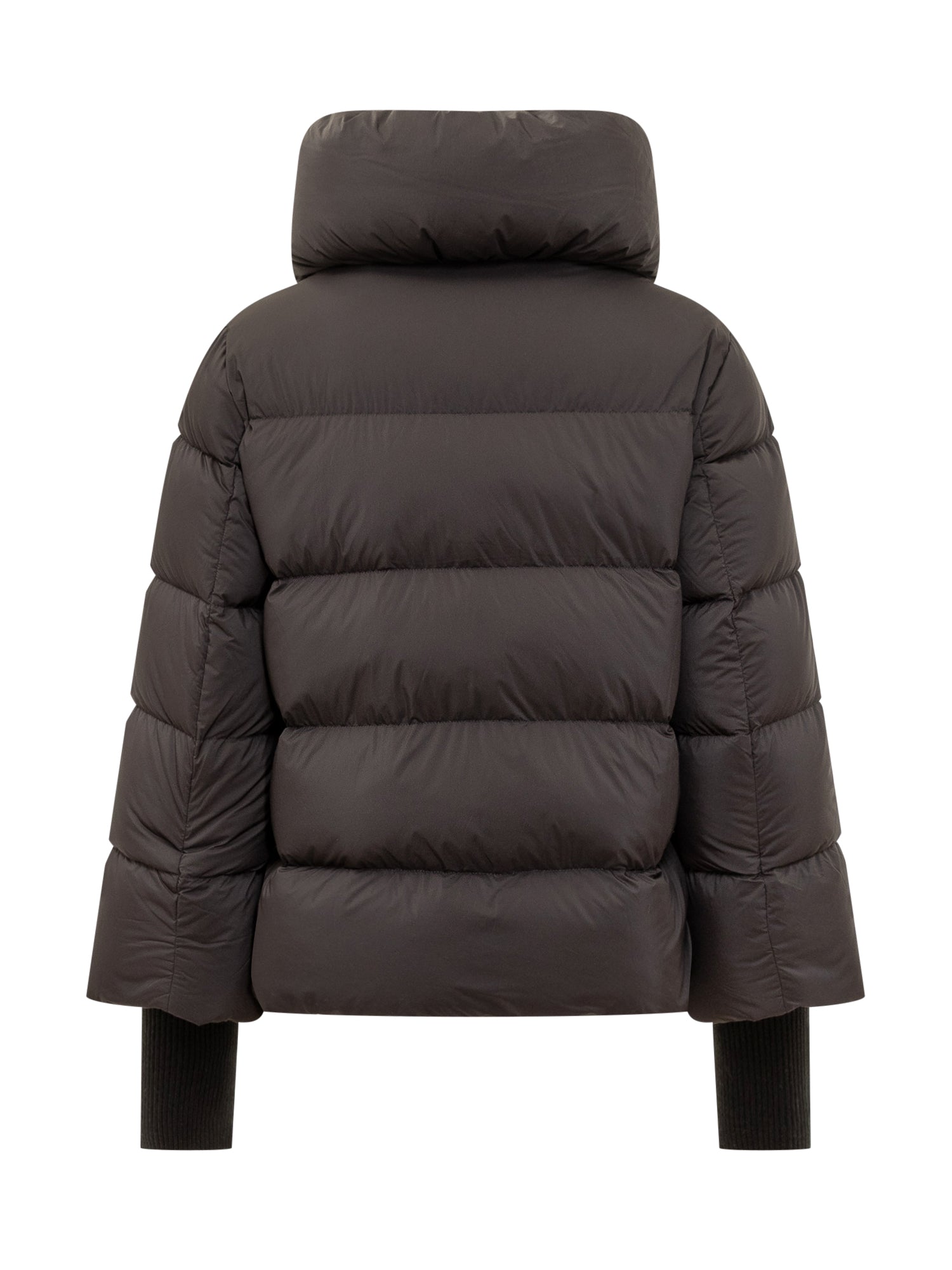 Add black down jacket with horizontal quilting, zip closure, and ribbed cuffs.