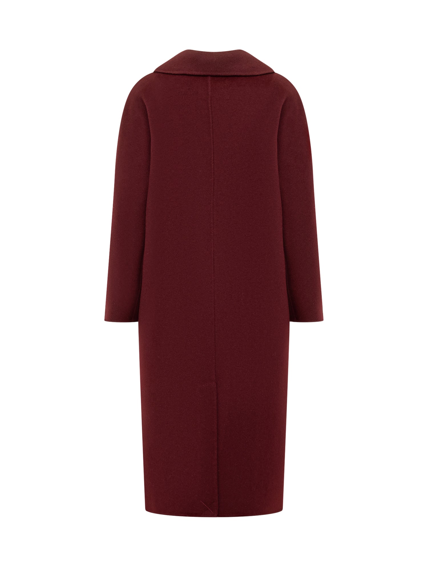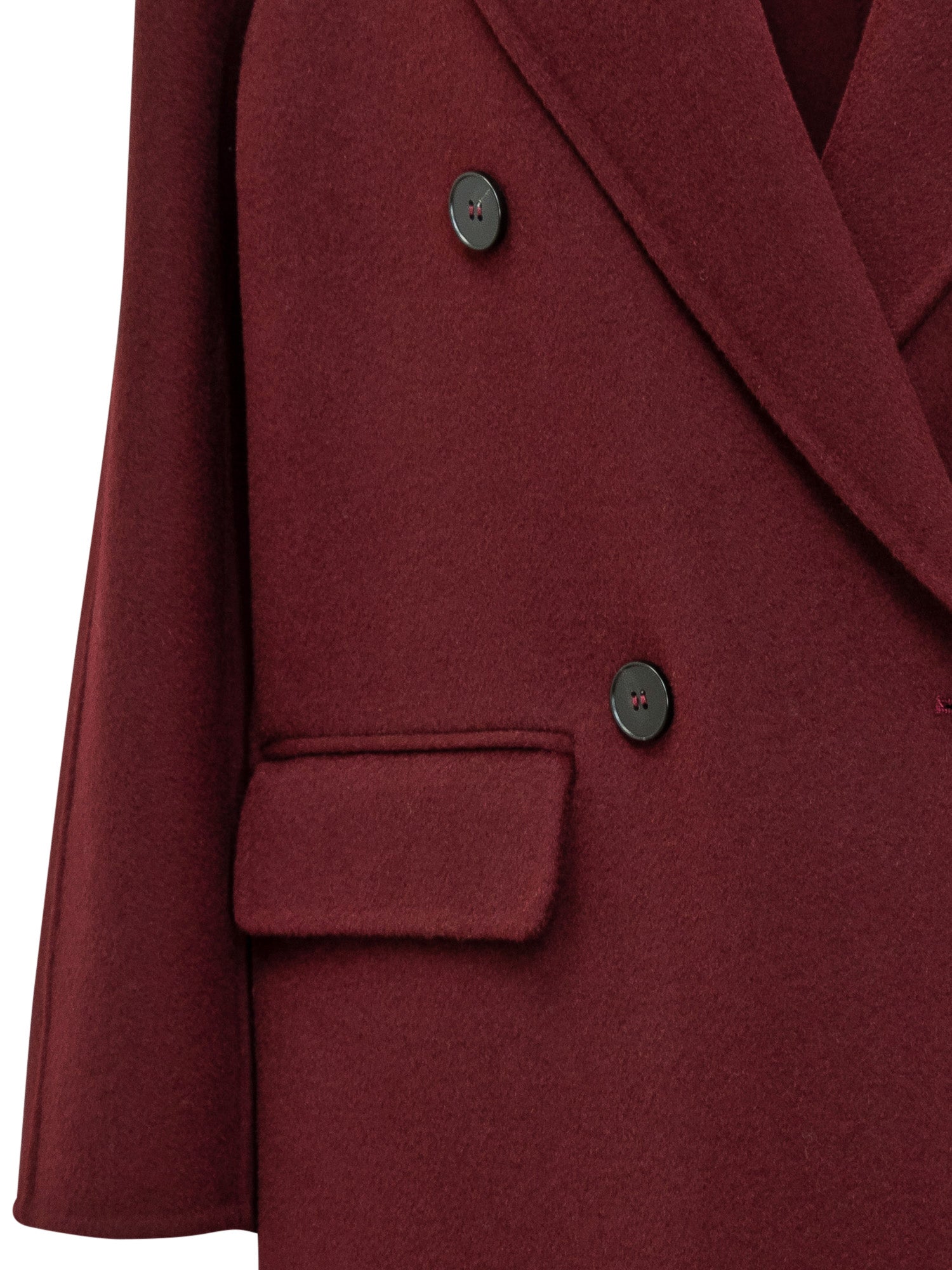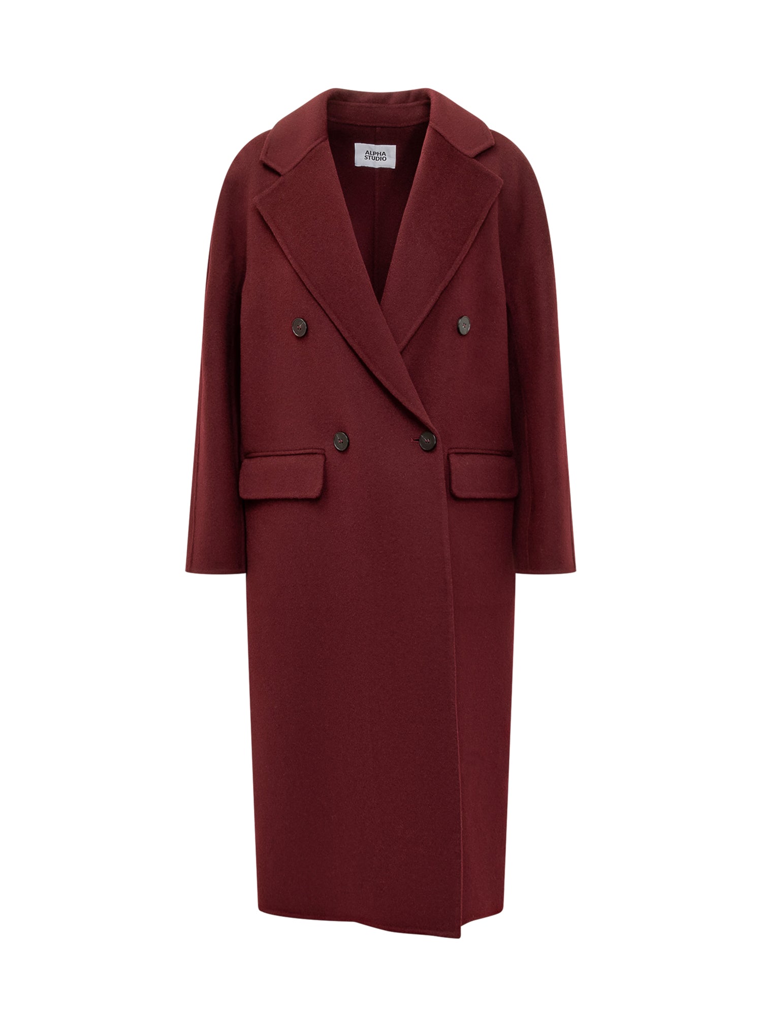 Alpha Studio wool coat in bordeaux with double-breasted button closure. Straight cut and flap pockets.