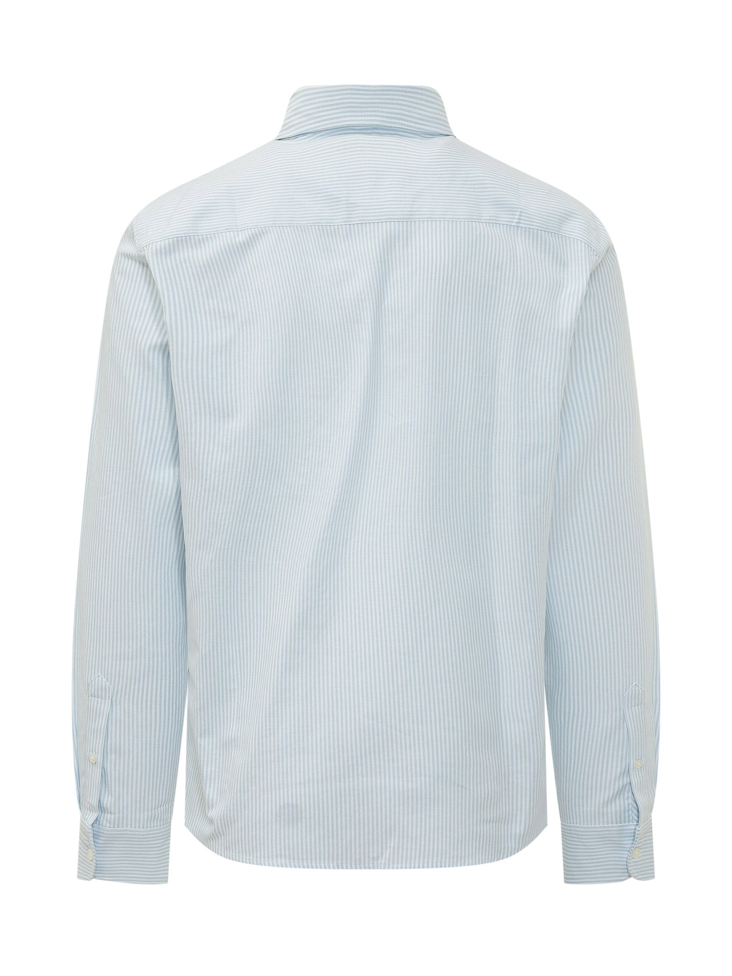 Long sleeve shirt featuring a button down collar and front button closure. Design with vertical striped pattern and embroidered logo on the chest. Clean lines and versatile style suitable for formal and contemporary looks.