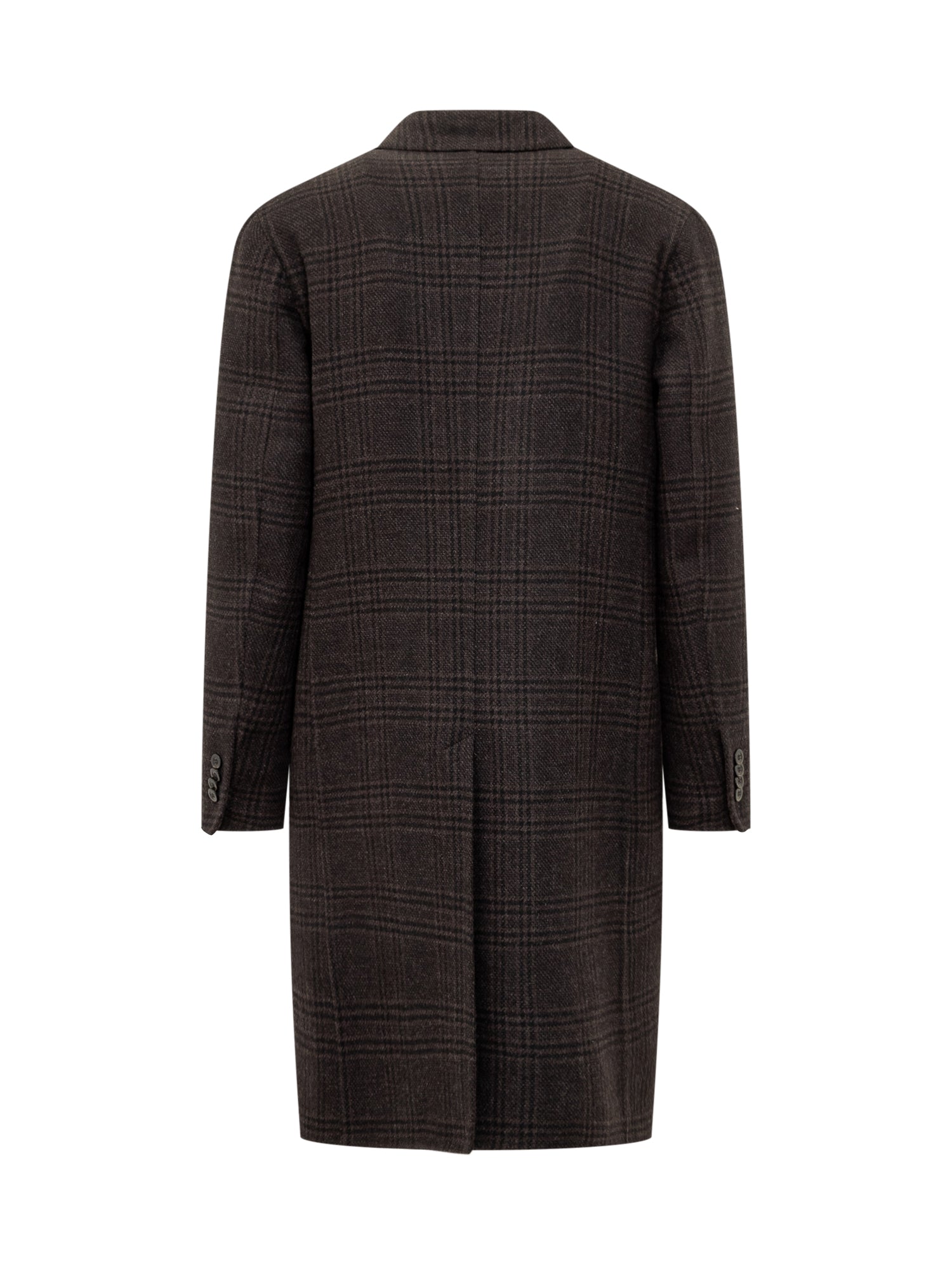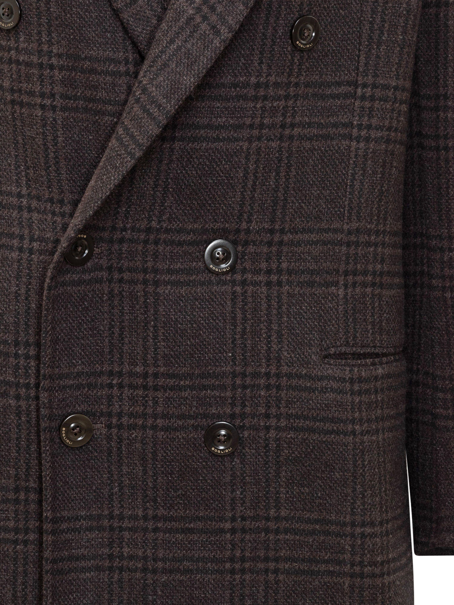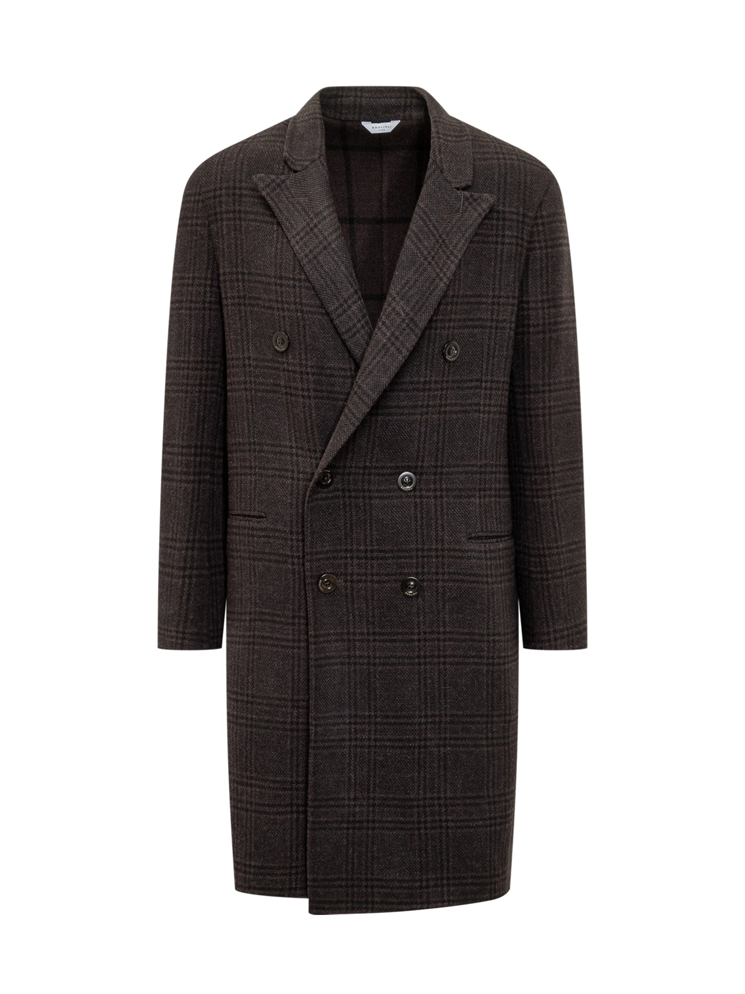 Boglioli double-breasted coat with check pattern, classic lapels and side pockets.
