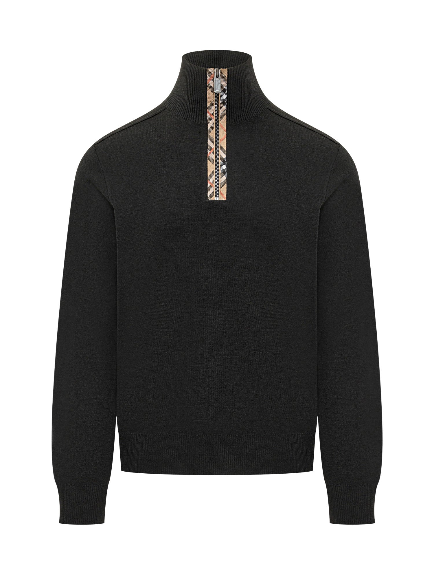 Long-sleeve sweater with high neck and front zip closure. Crafted from soft knit with ribbed trims, featuring a decorative detail along the zipper for a refined touch.