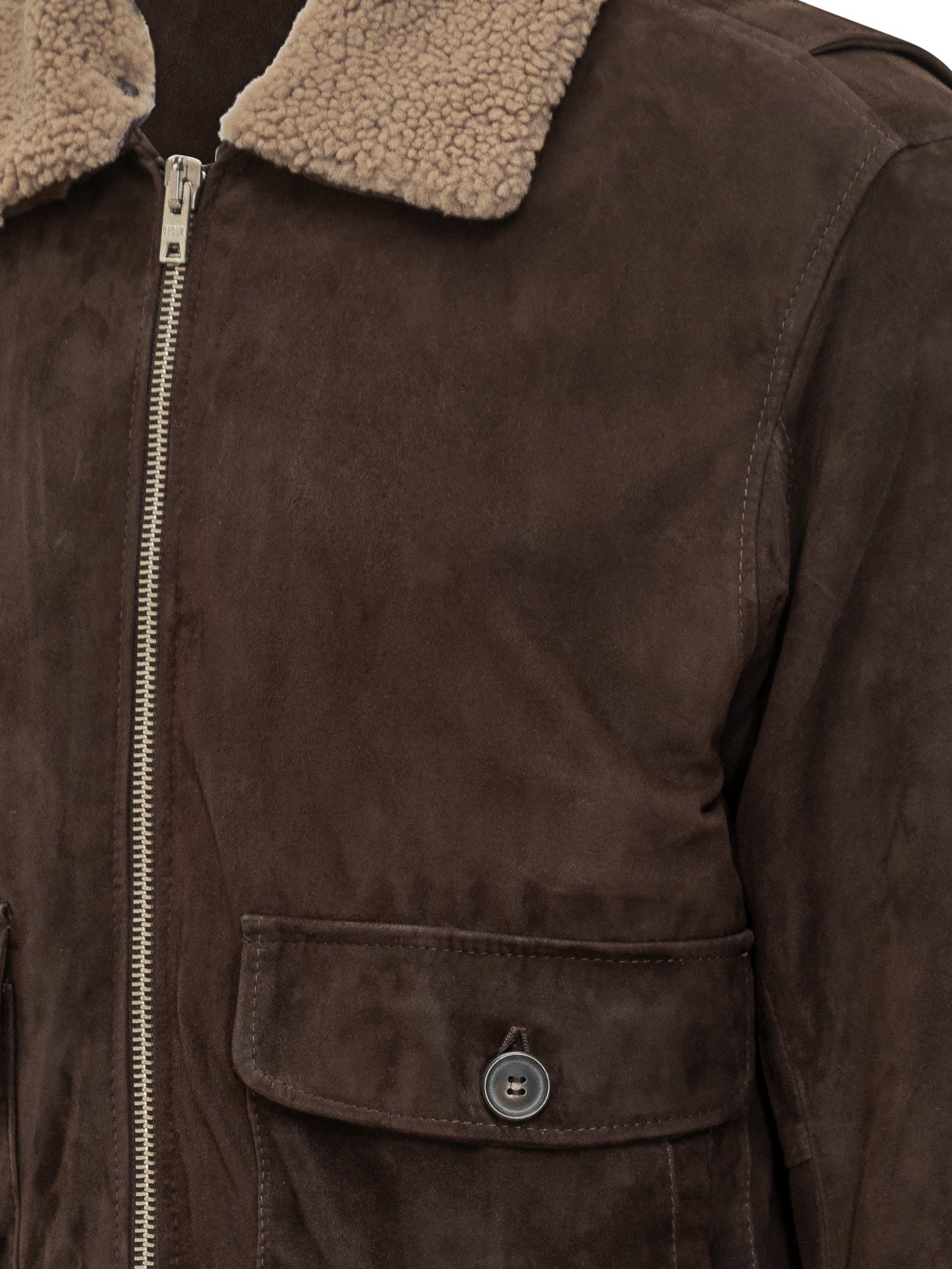 Dfour brown suede shearling jacket with contrasting shearling collar, flap front pockets and double-slider zip.