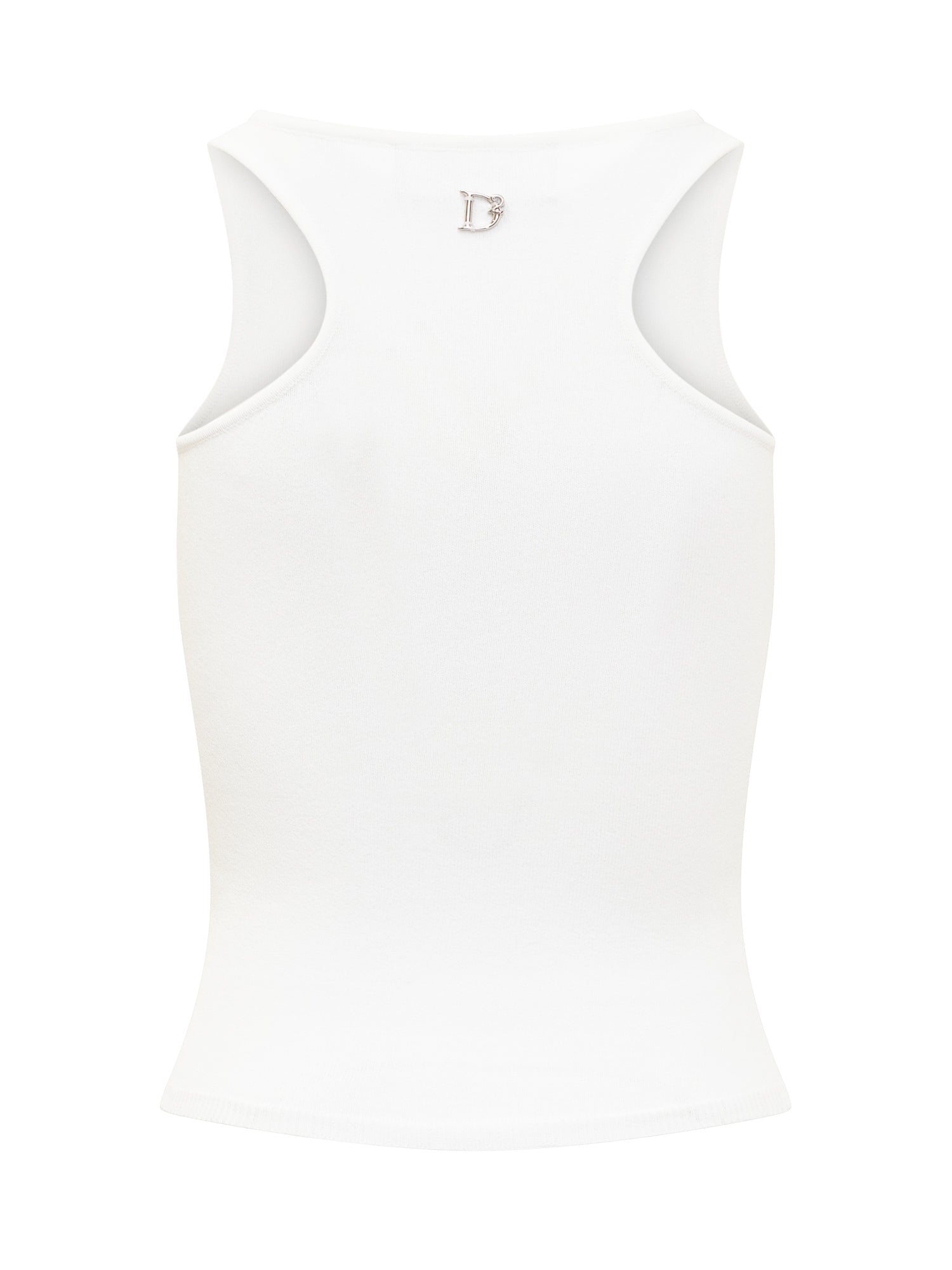 Sleeveless top. Round neckline. Cut out on the front. Logo detail applied on the back.