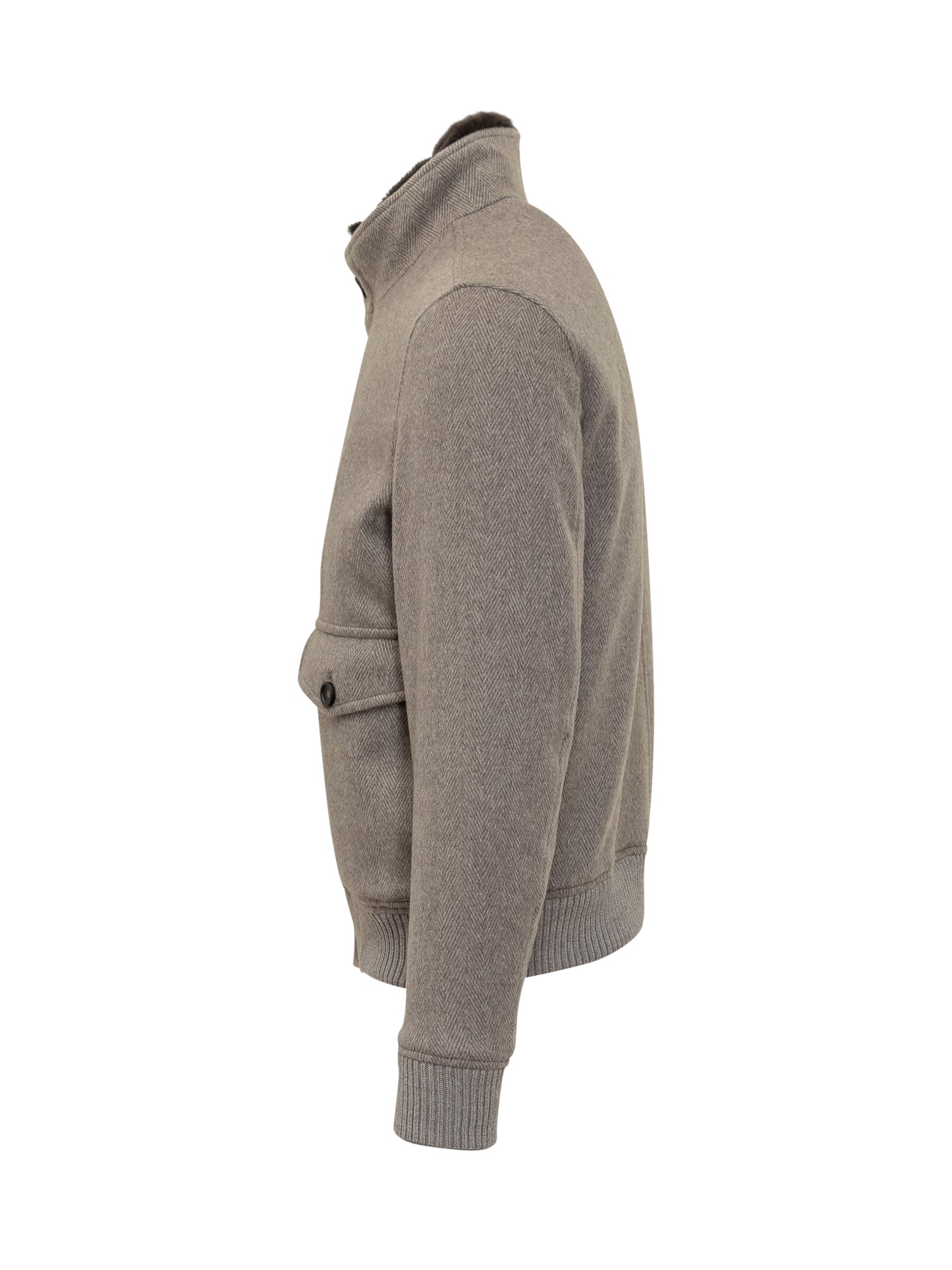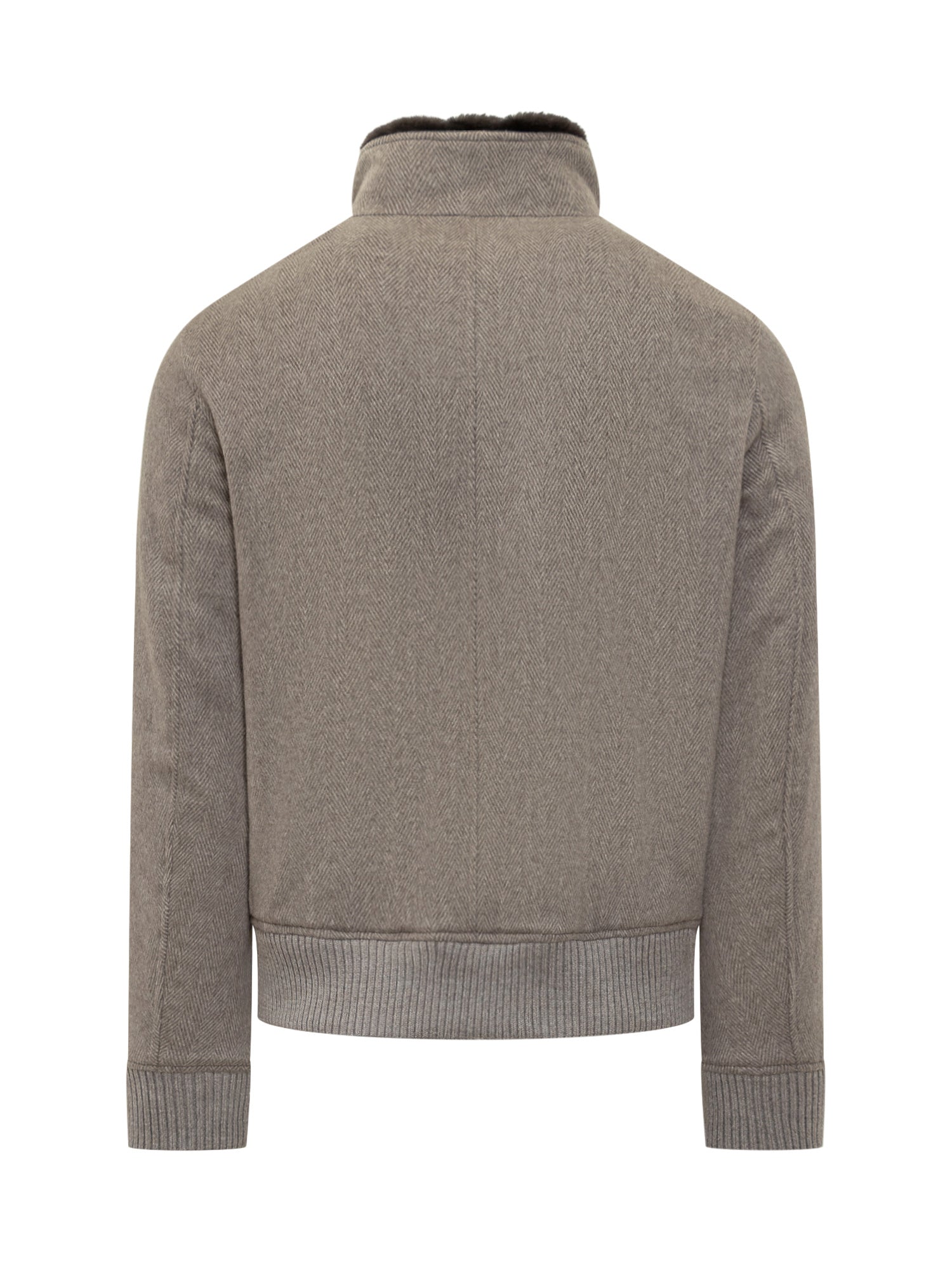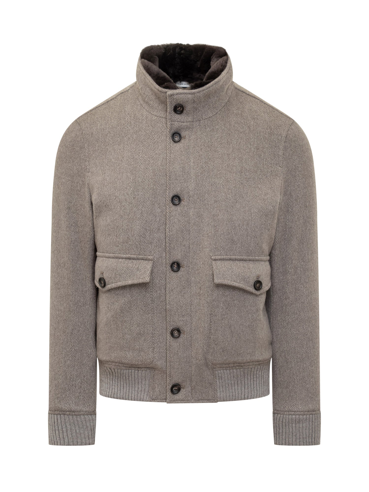Esterno grey cashmere jacket with shearling collar, button closure, and front flap pockets.