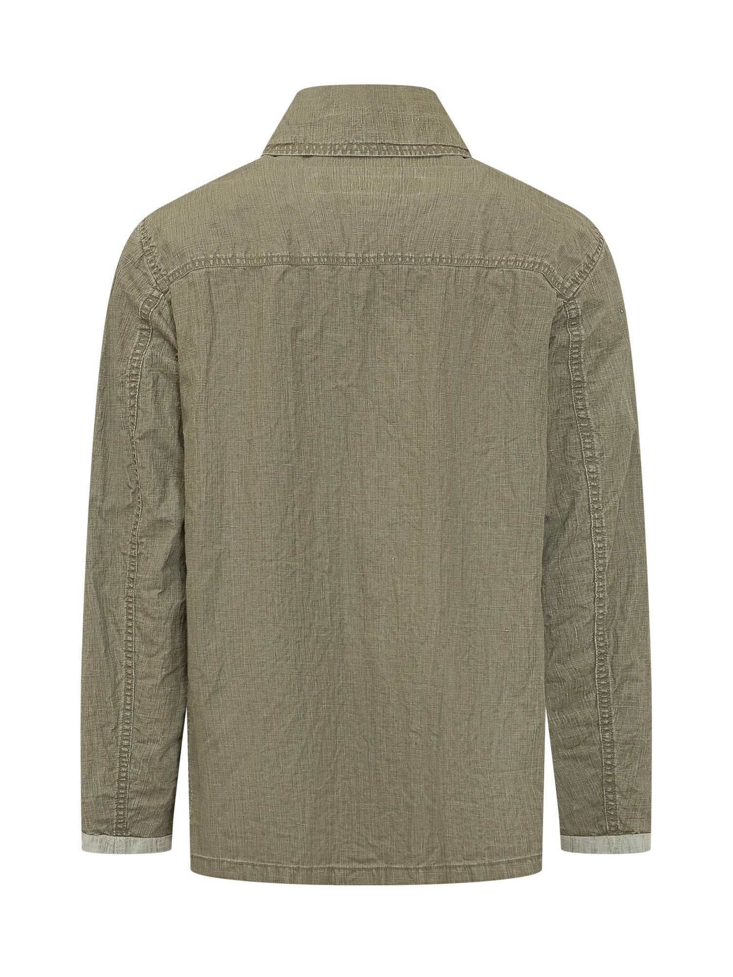 Jacket with classic collar and metal hook front closure. Solid construction and side pockets.