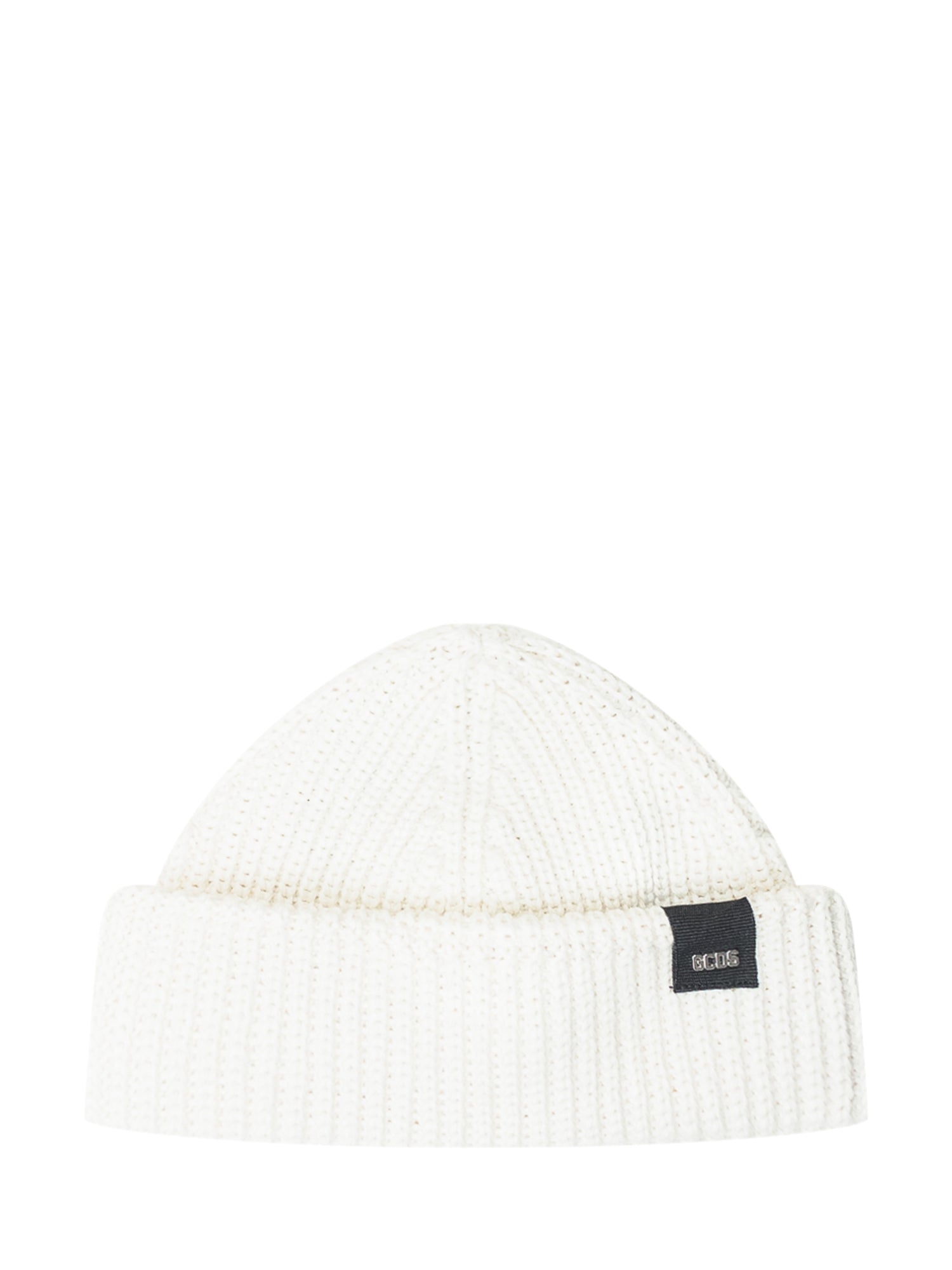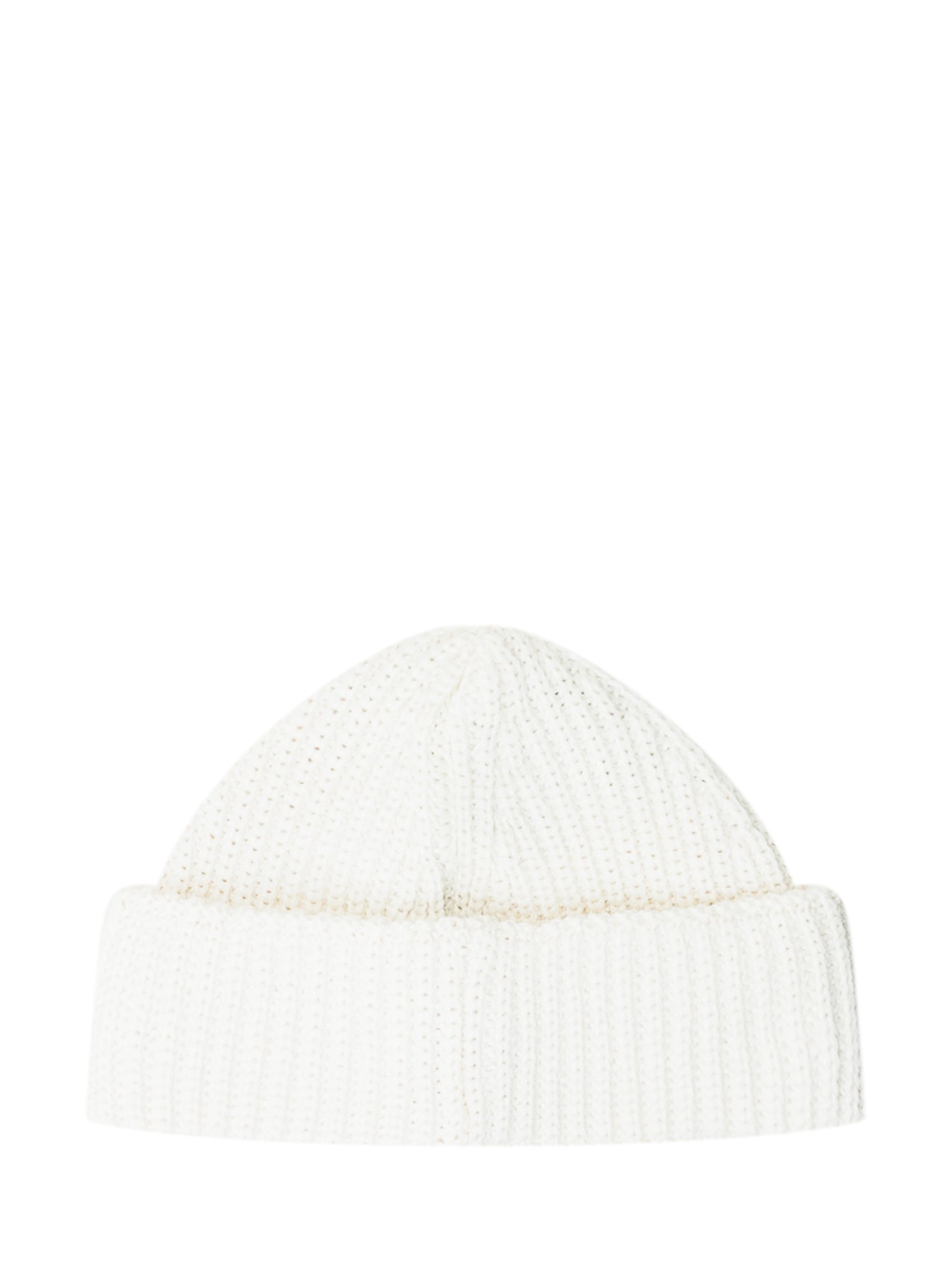 GCDS white ribbed wool beanie featuring a folded brim and front logo patch.
