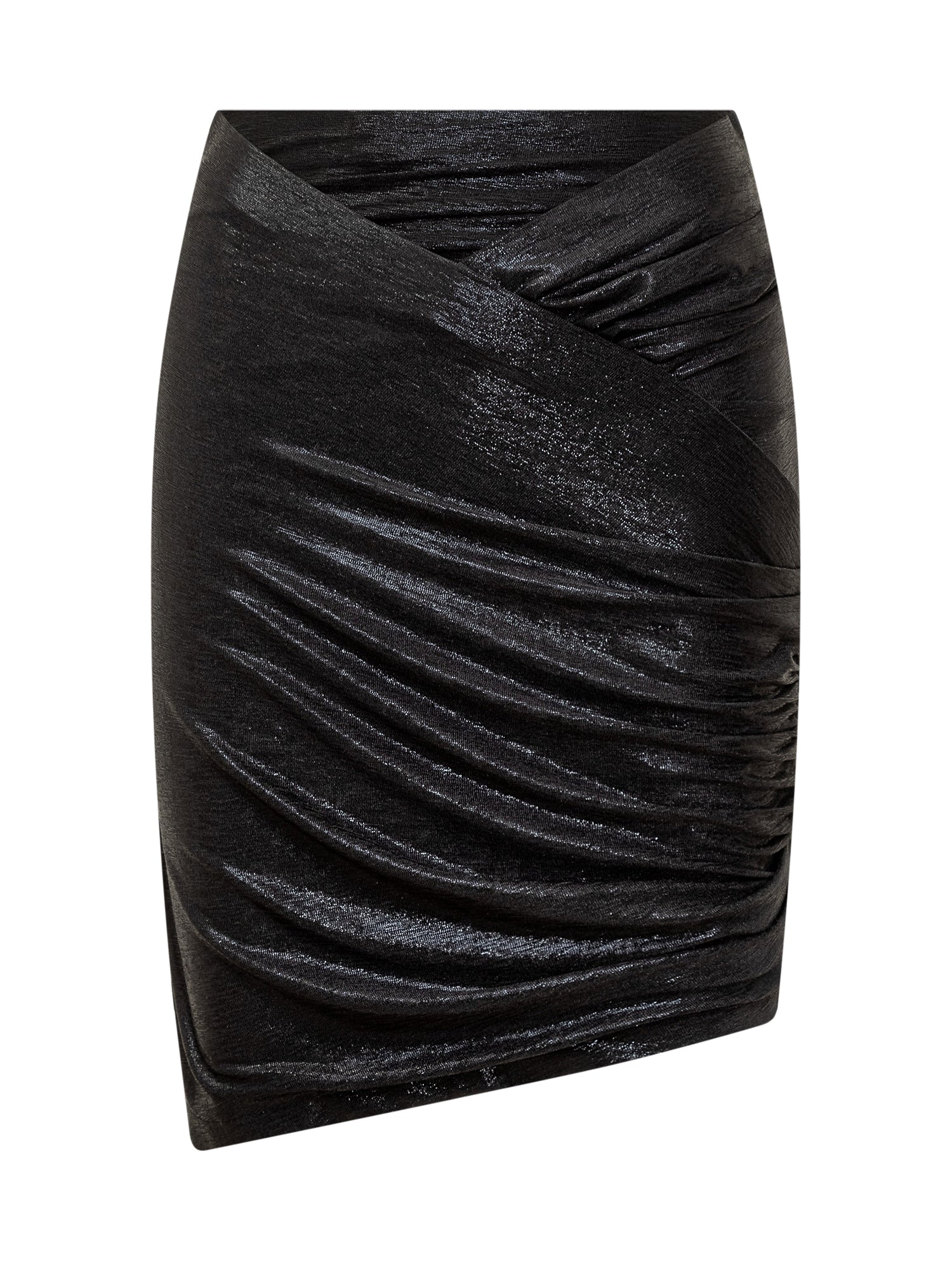 Mini skirt with wallet. Asymmetric hem. Metallic satin effect all over.