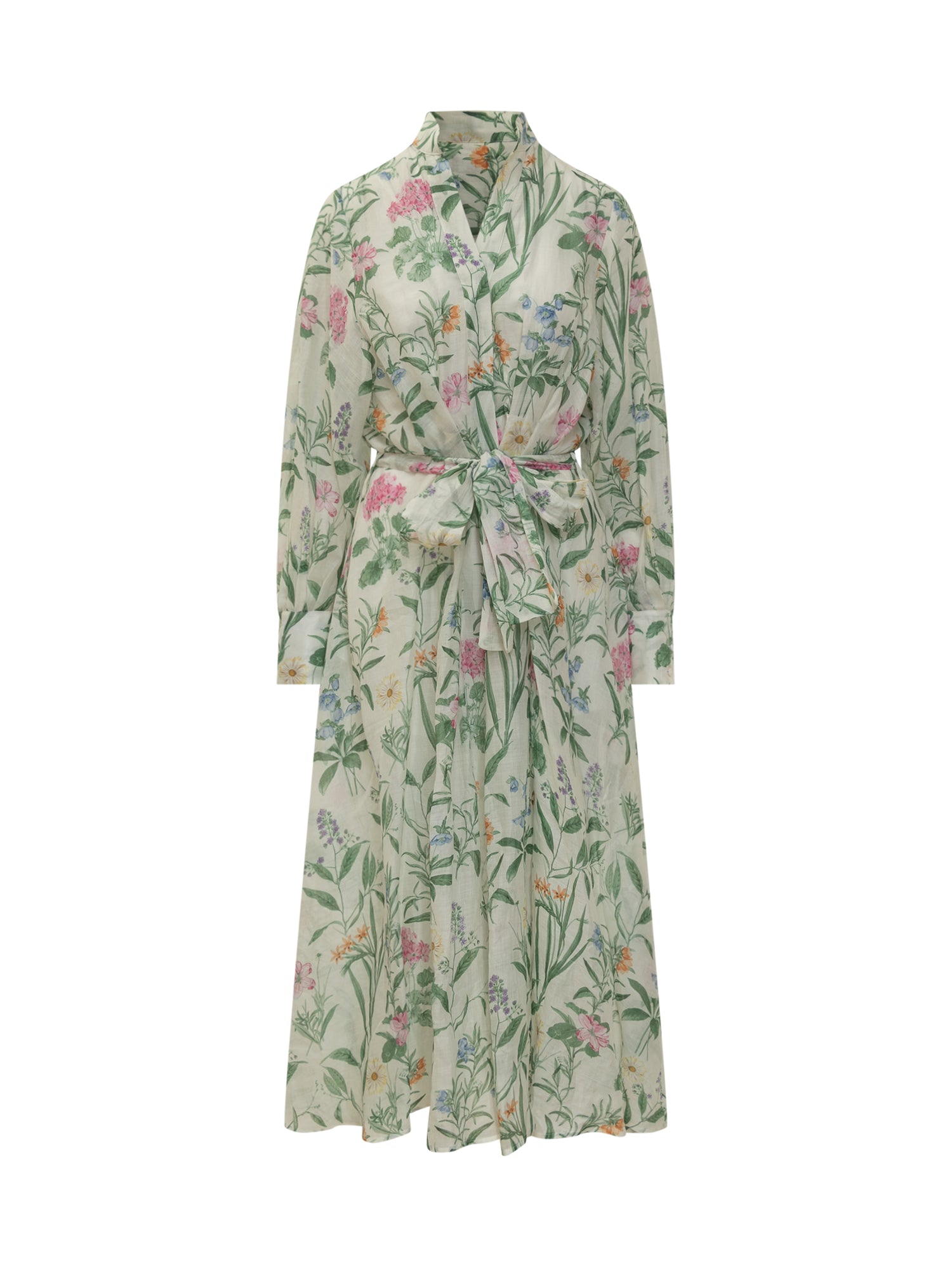 Button and belt closure. Cotton slip. V-neck. Long sleeves. Three-button cuffs.
