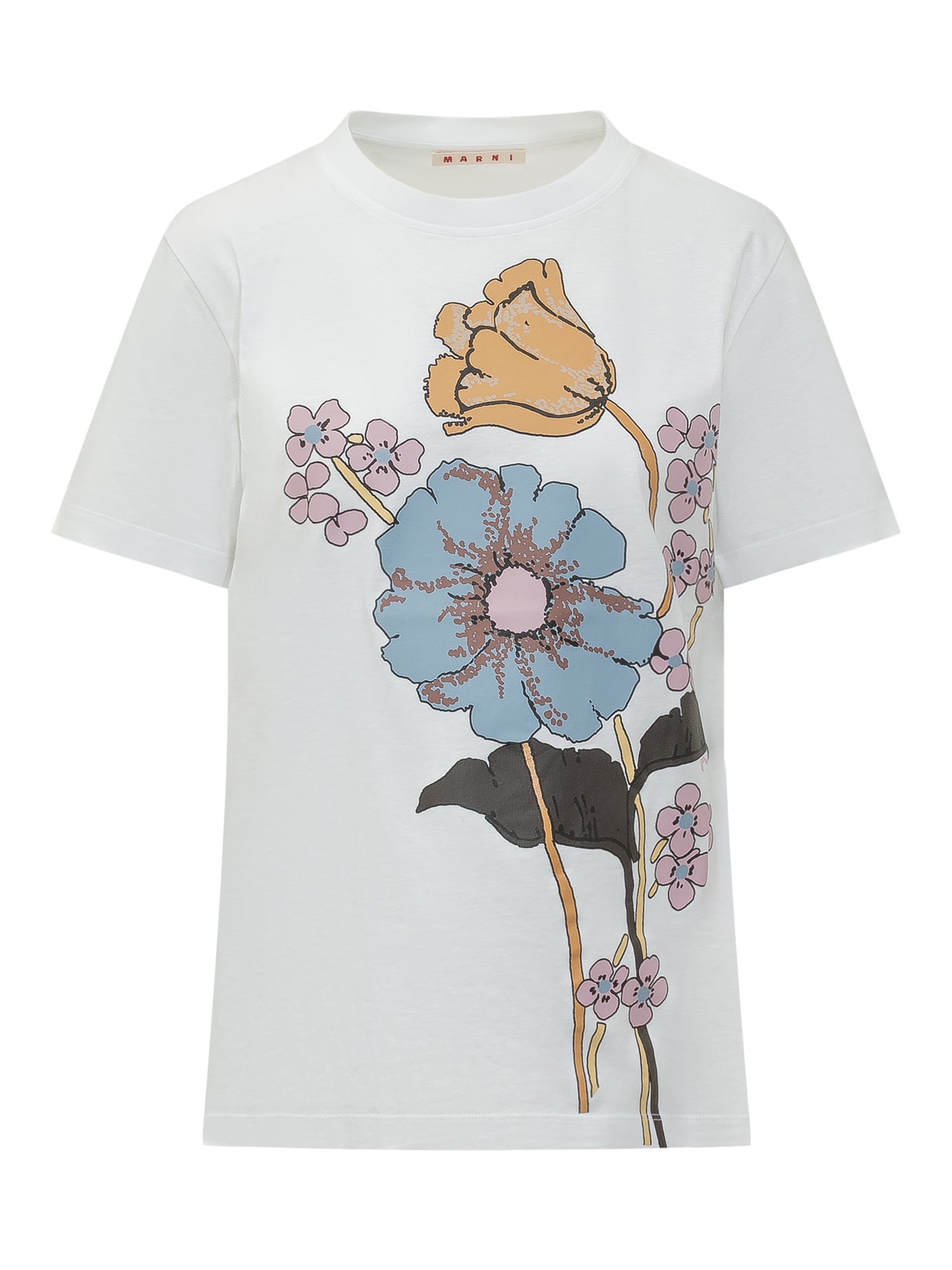 Short sleeve T-shirt featuring an artistic floral print on the front. Clean silhouette with a comfortable fit, perfect for adding a refined and creative.