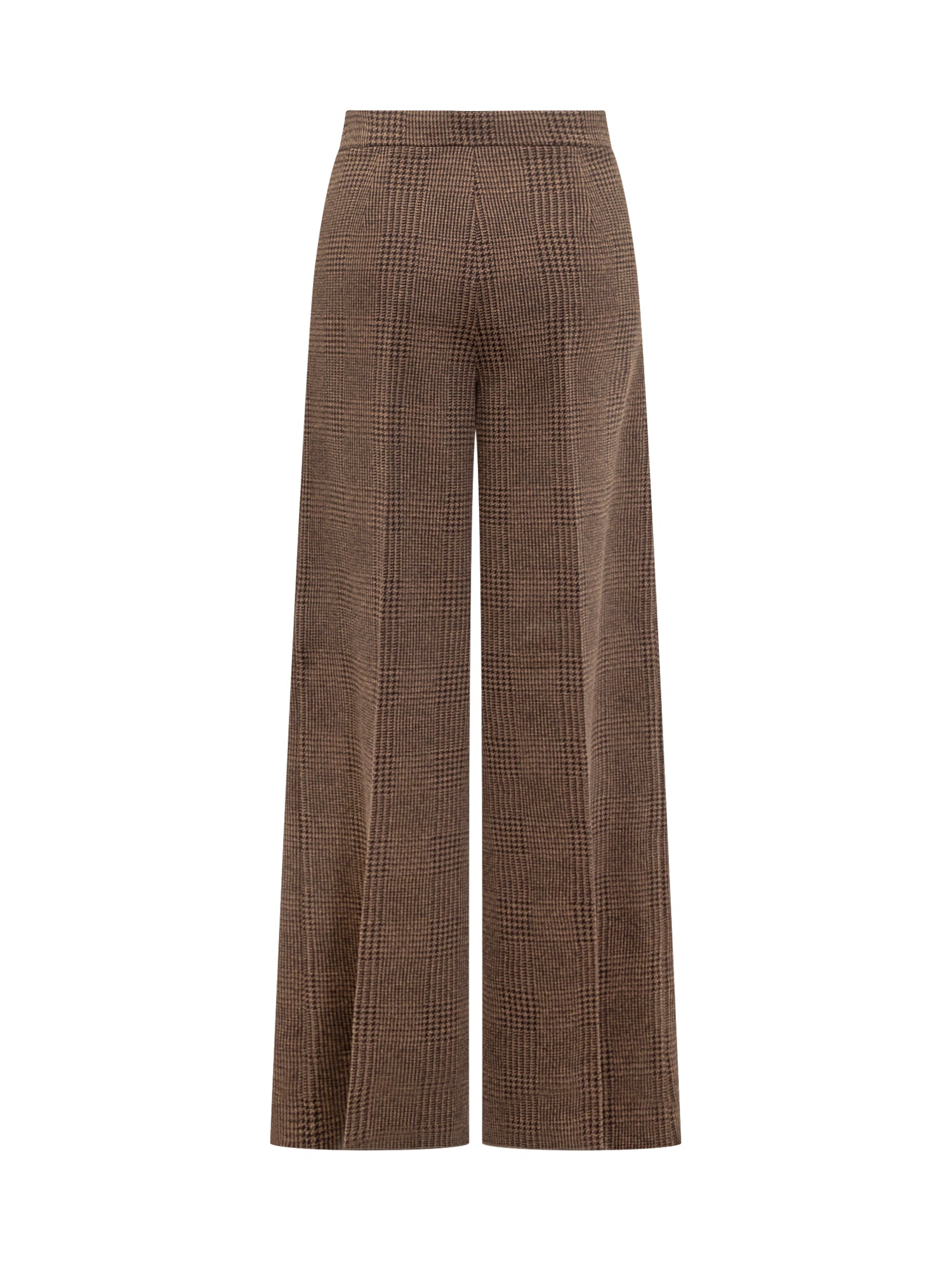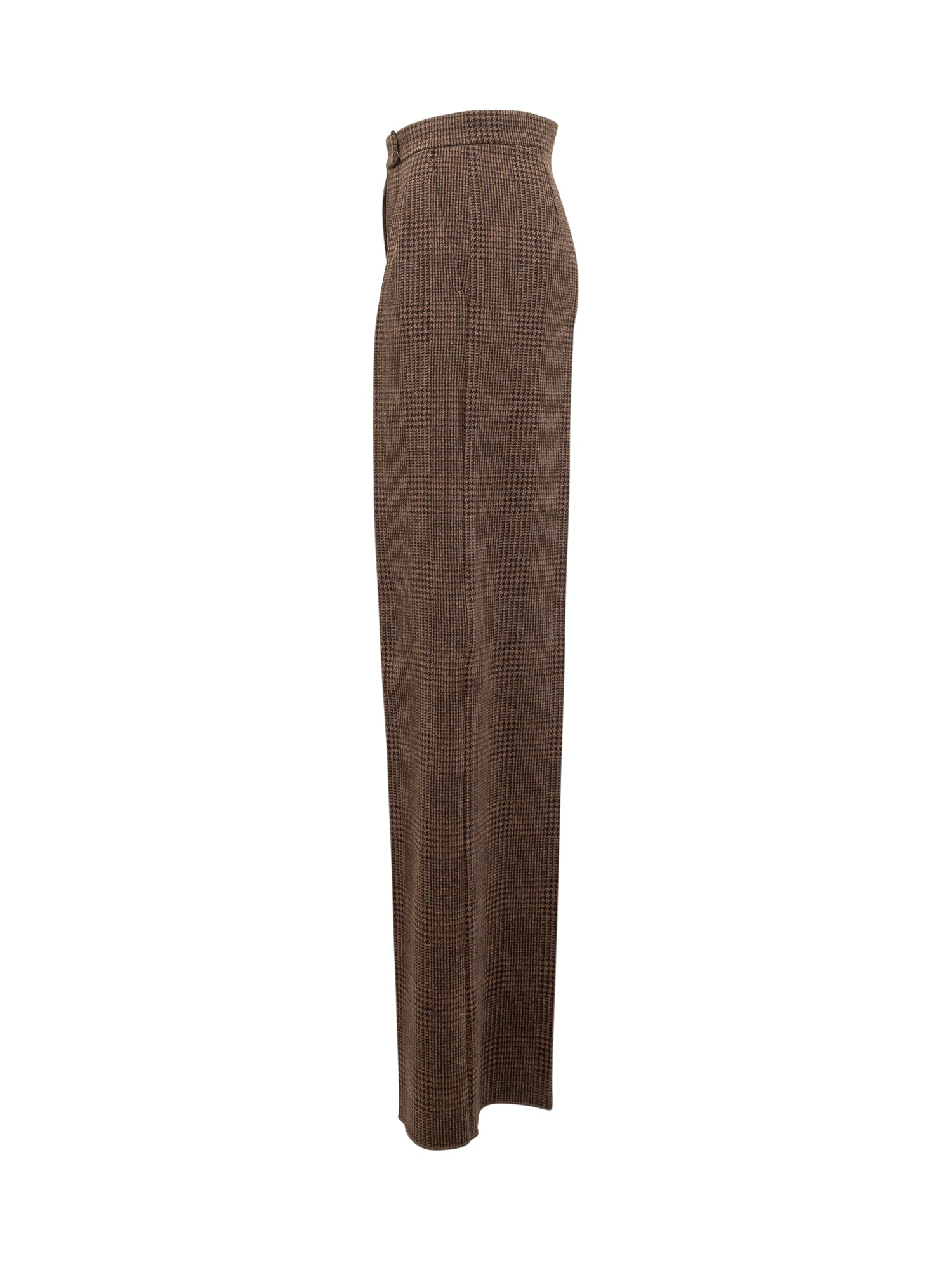Max Mara brown wool trousers with checked pattern. Wide straight-leg design with front crease, high waist and button and zip closure.