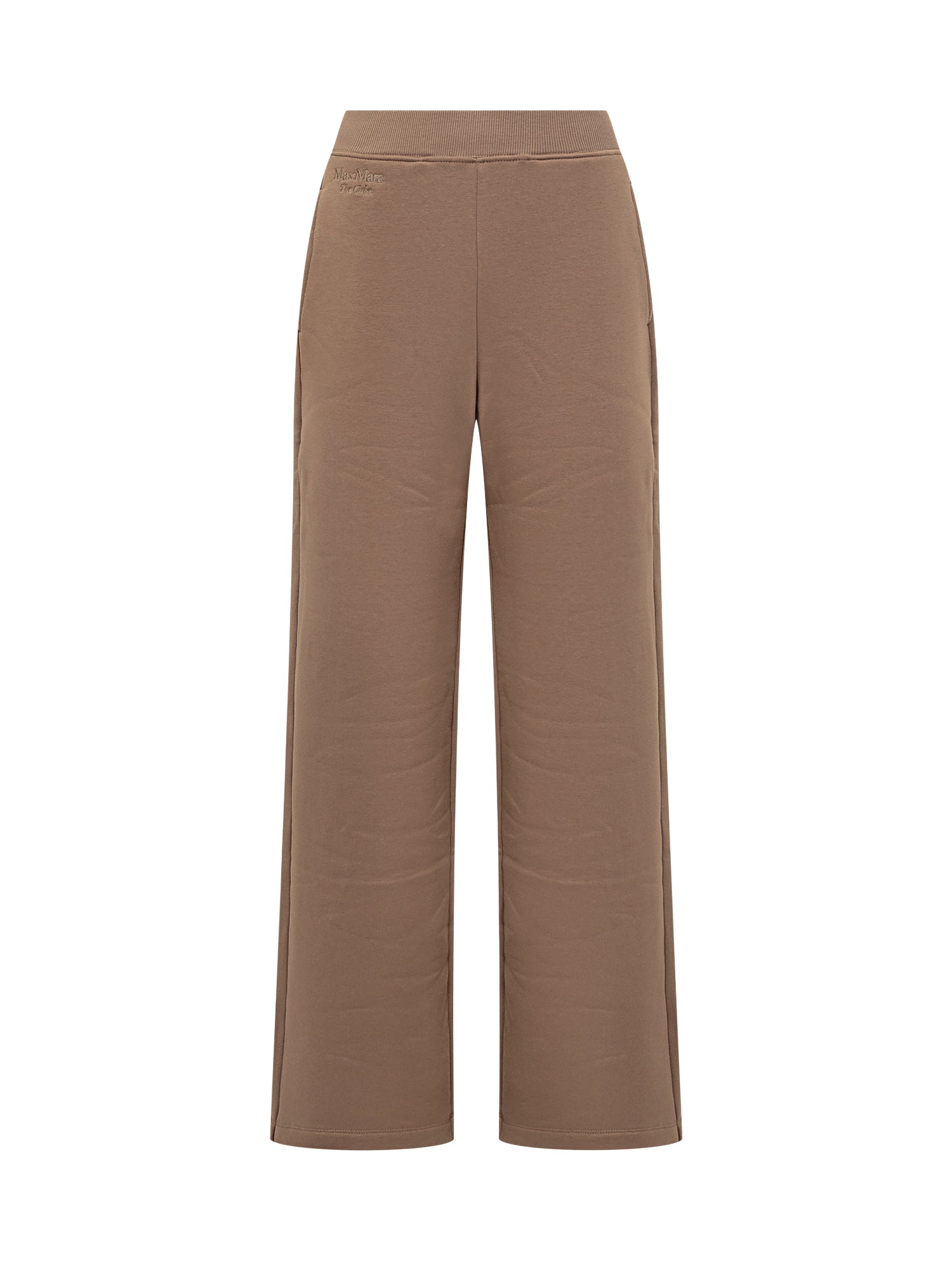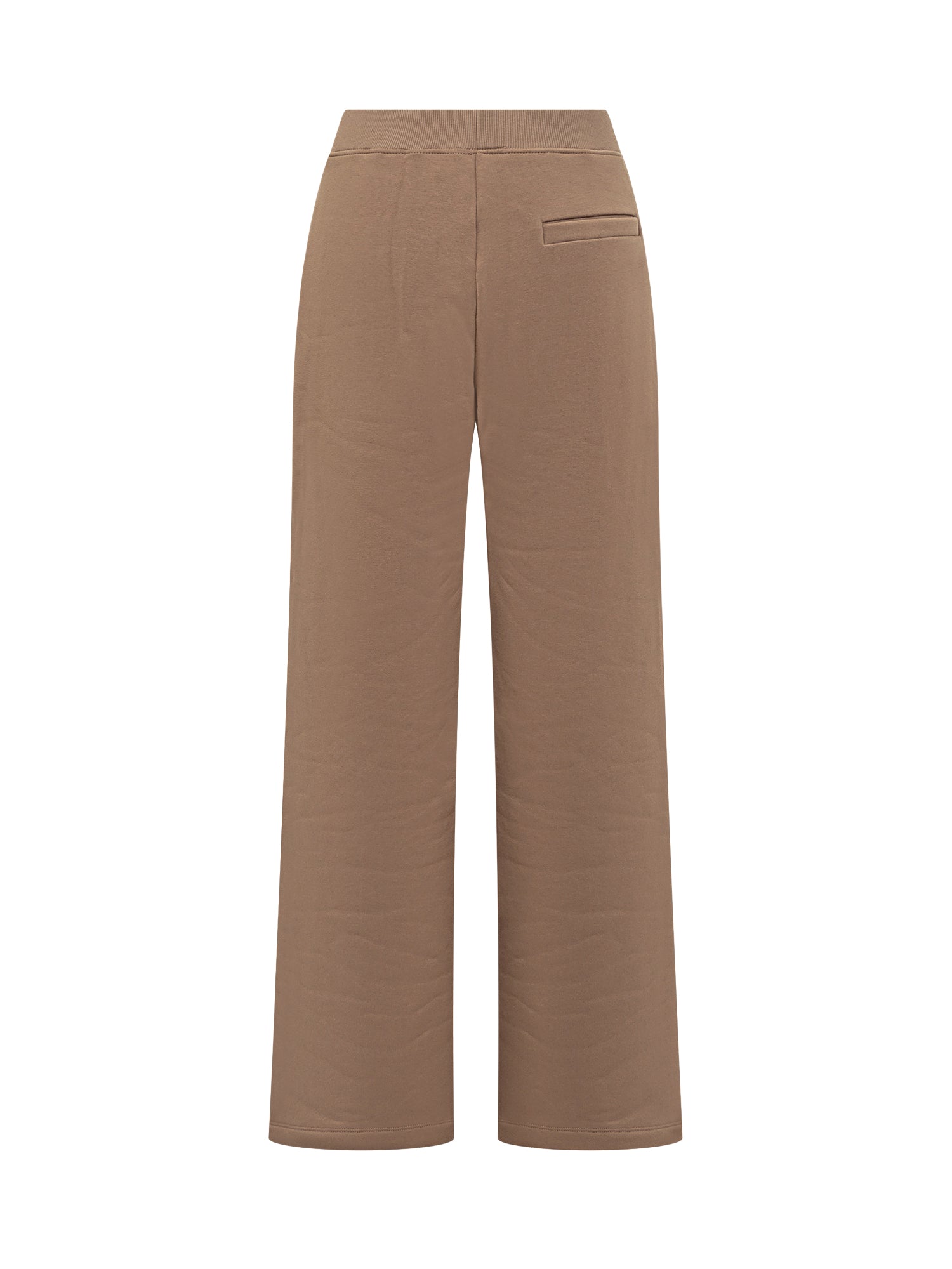 Max Mara S taupe fleece trousers with elastic waist and wide leg. Embroidered side logo and clean design.