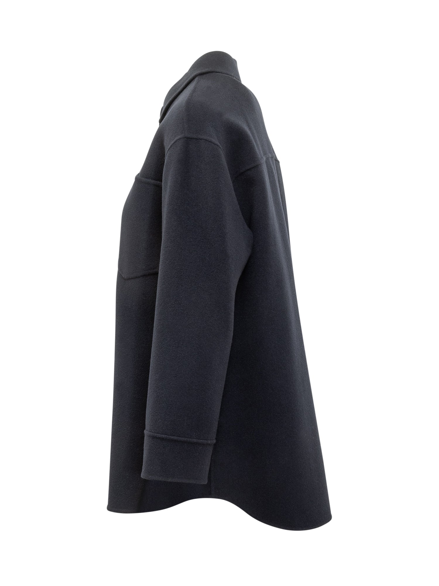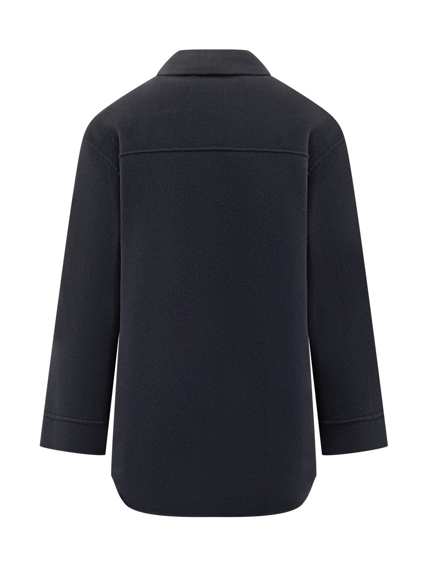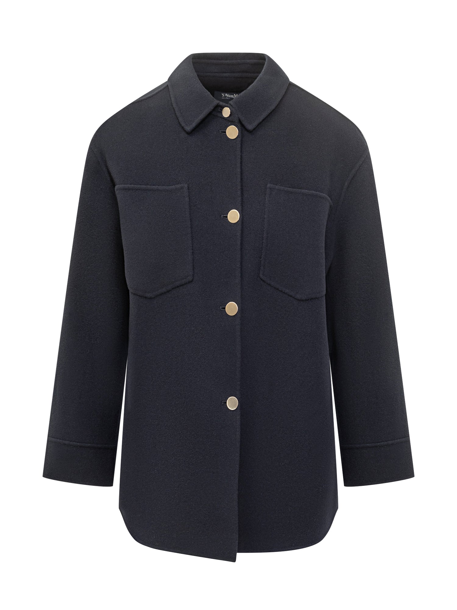 Max Mara S pure wool coat in midnight blue featuring a straight cut and front patch pockets. Finished with gold button closure and classic collar.