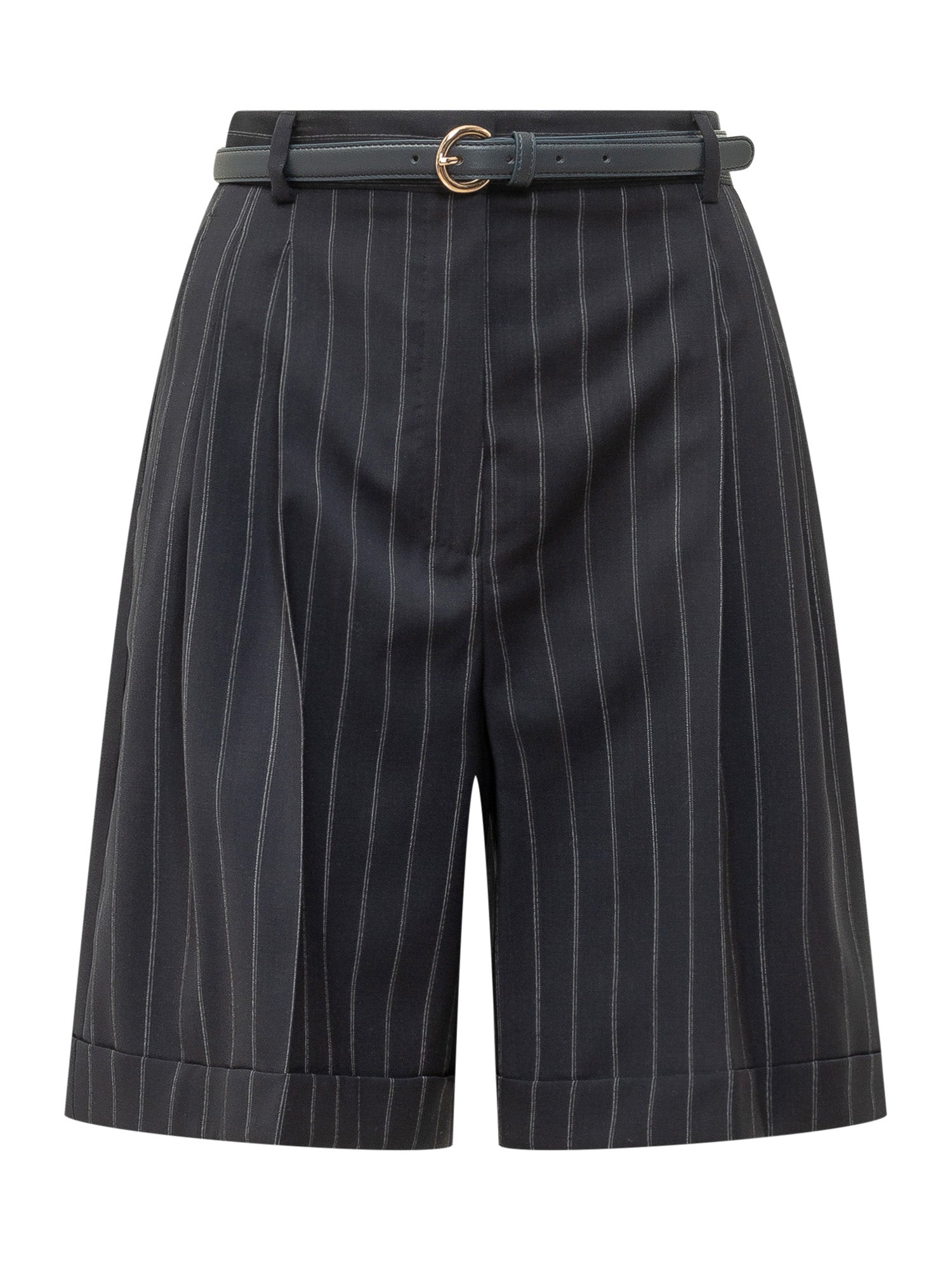 High waisted shorts with thin belt and buckle. Design featuring front pleats, side pockets and vertical stripe pattern. Wide silhouette ideal for elegant and contemporary looks.