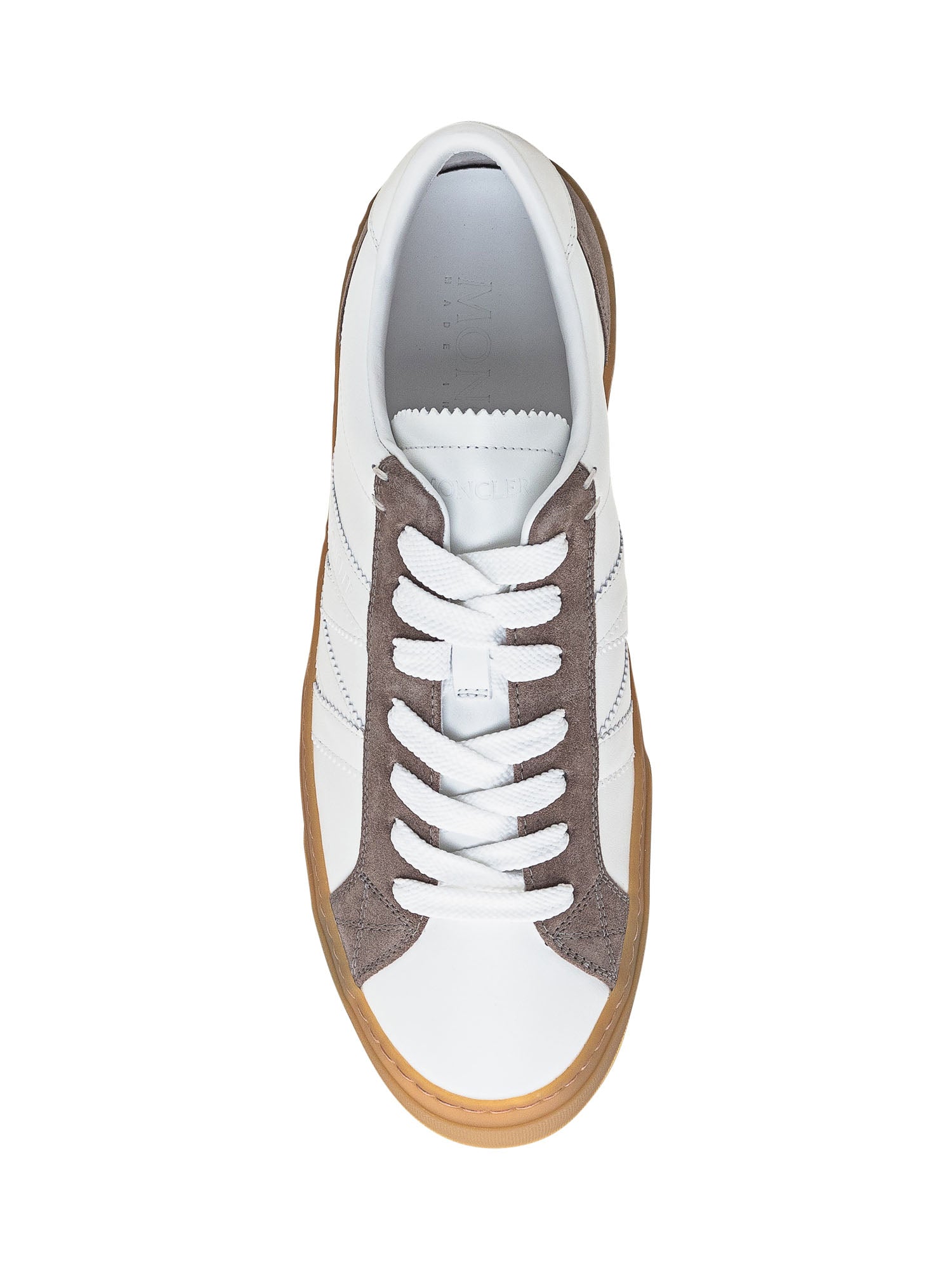 Low-top white sneakers. Lace-up front. Covered heel. EVA midsole. Contrast heel with embroidered logo. Suede leather details.