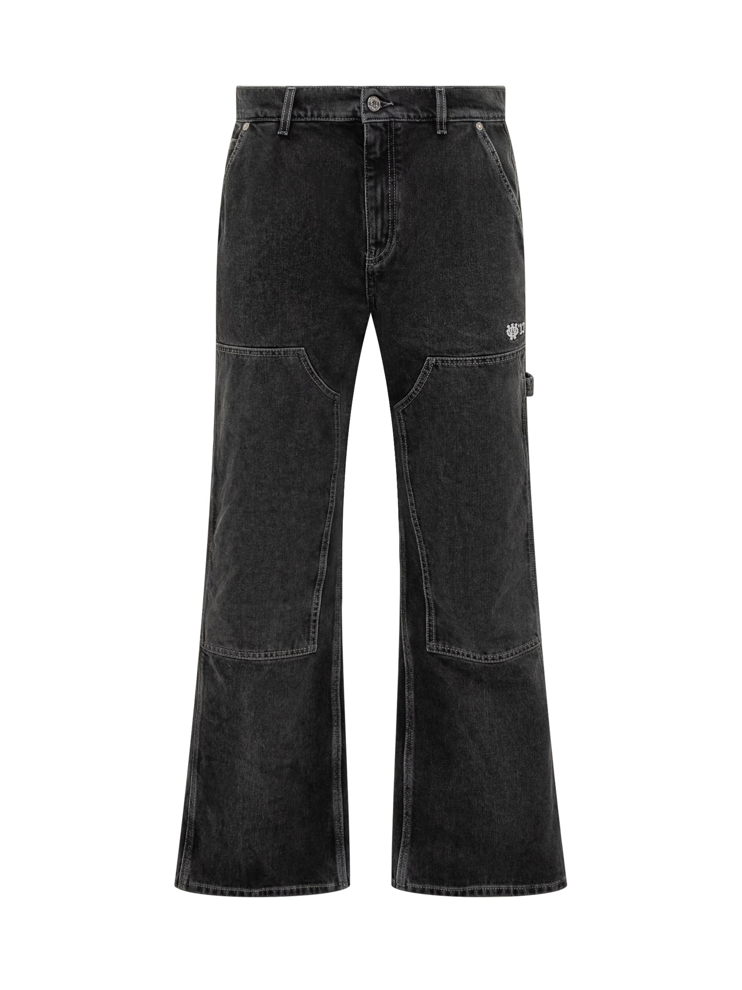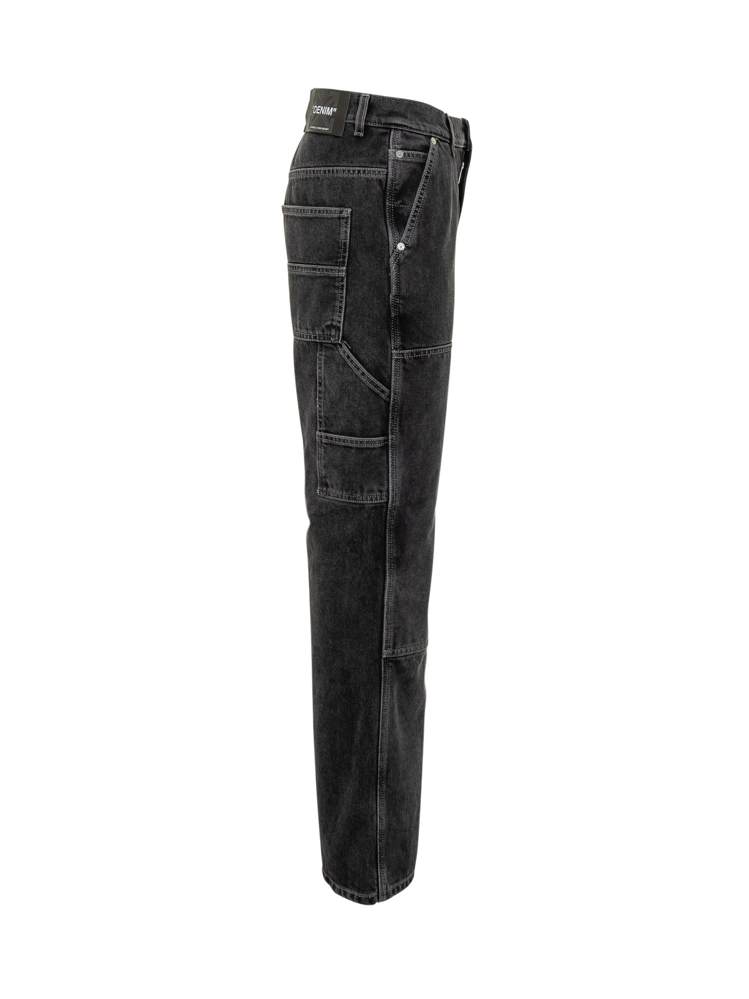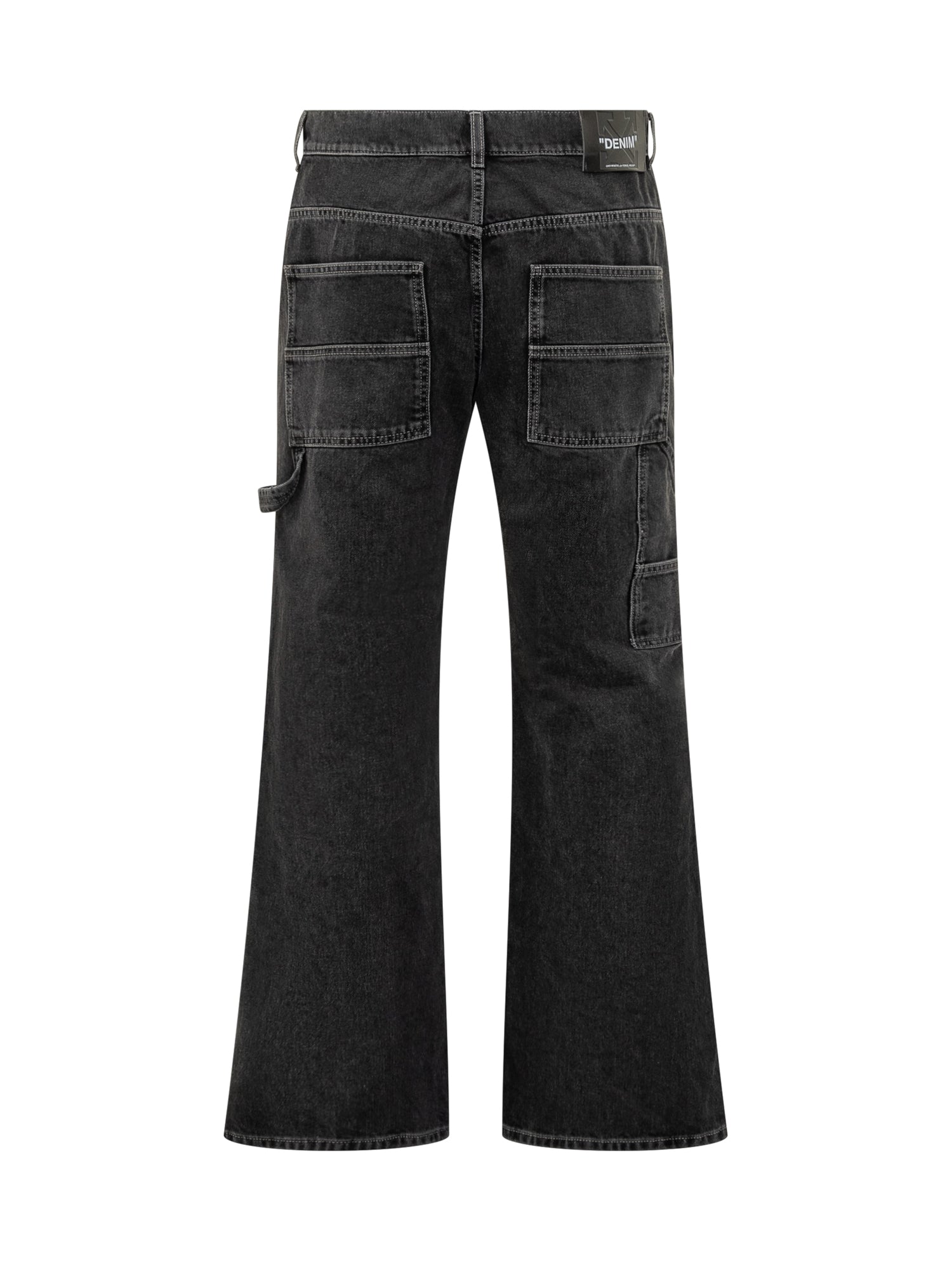 Off-White black vintage-effect denim jeans with wide-leg cut and contrast stitching. Embroidered logo, utility details, button and zip closure.