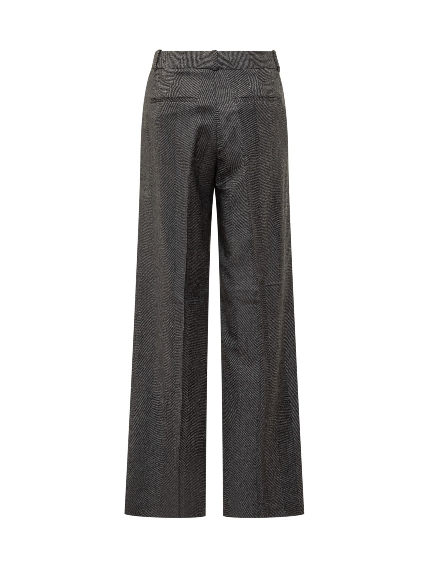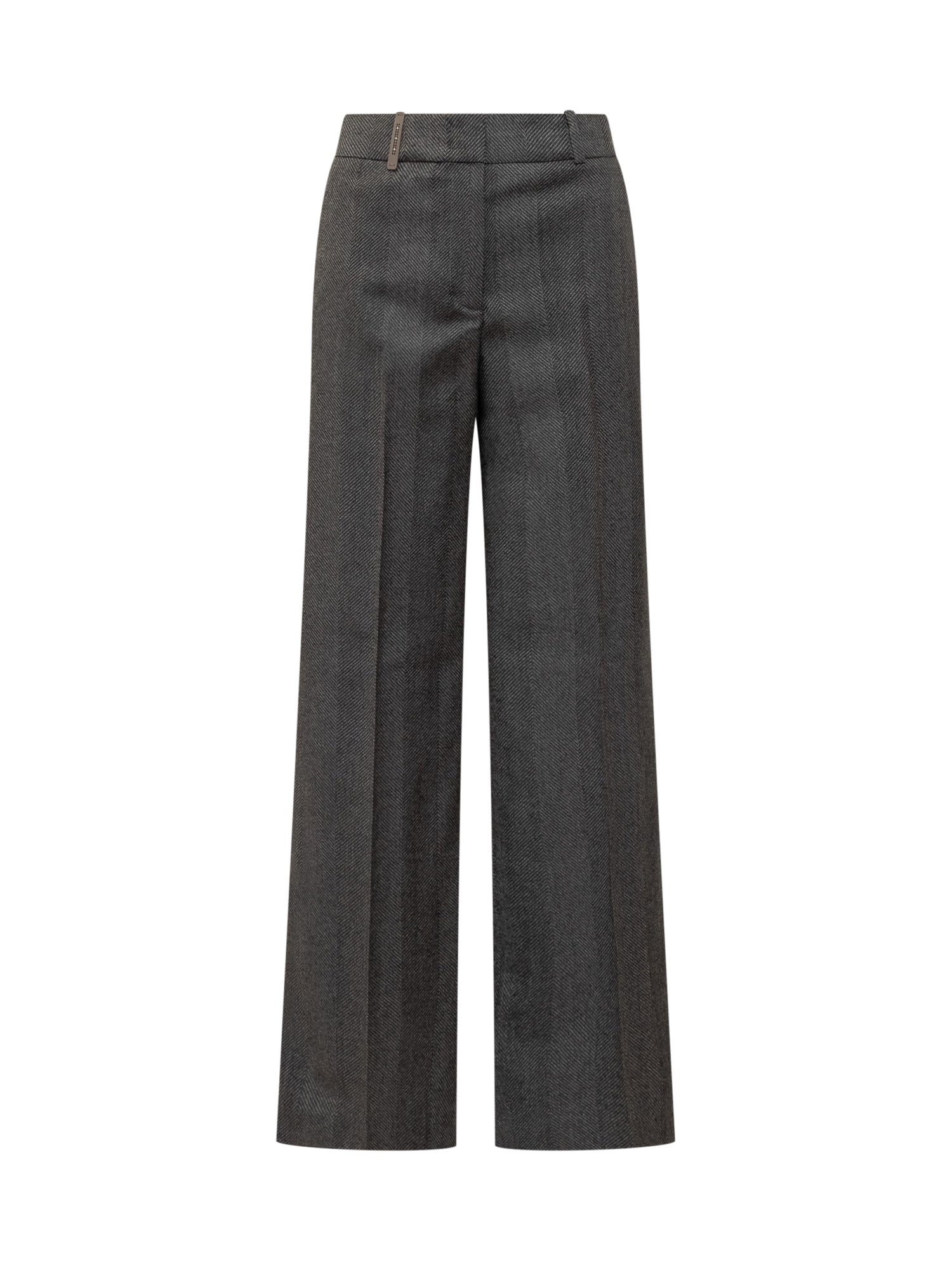 Peserico wool pants in grey herringbone pattern. Wide-leg style with front crease, elegant and comfortable.