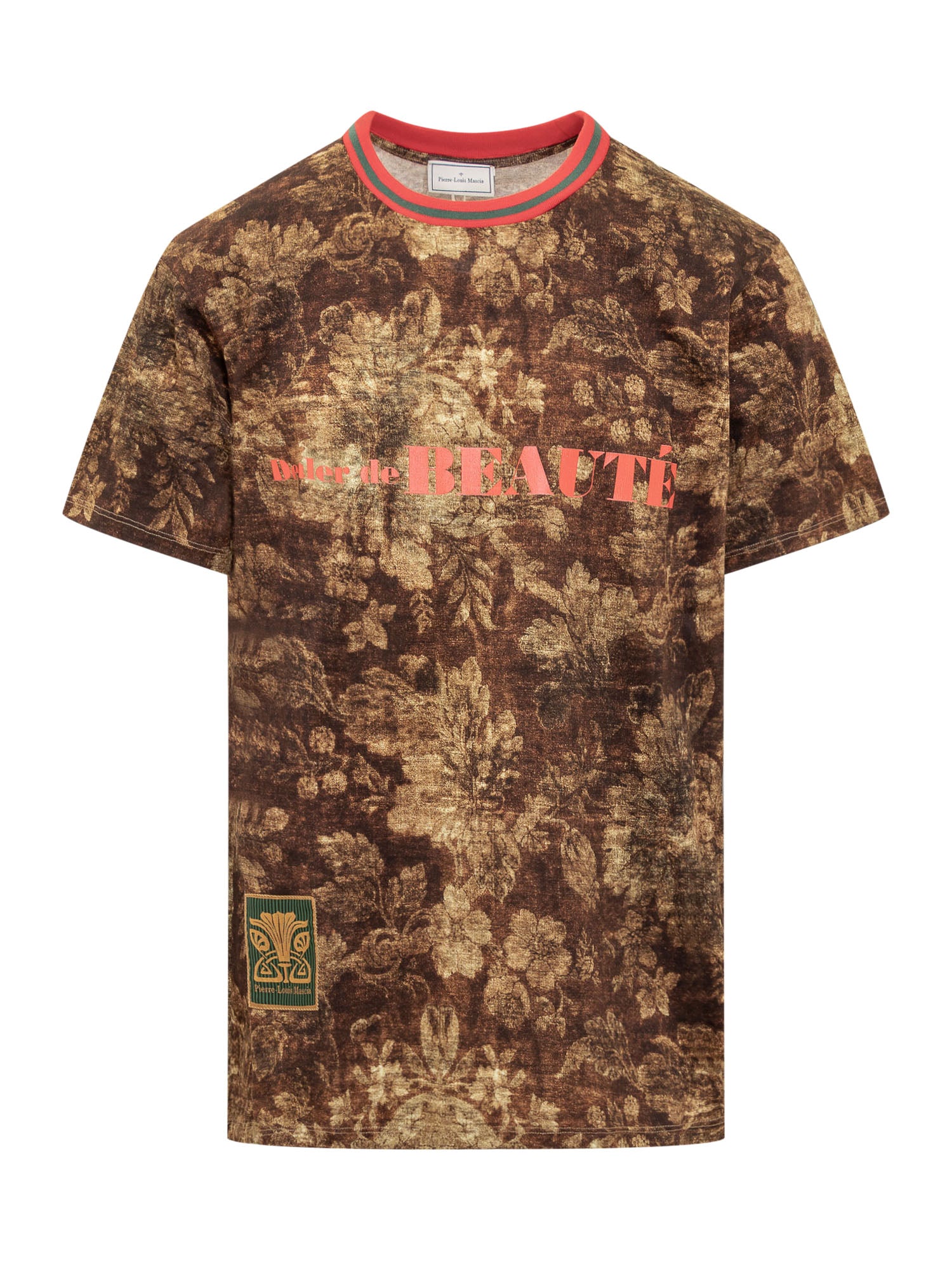 Short-sleeved brown t-shirt. Crew neck. Embroidered logo on the front. Floral pattern. Ribbed collar.
