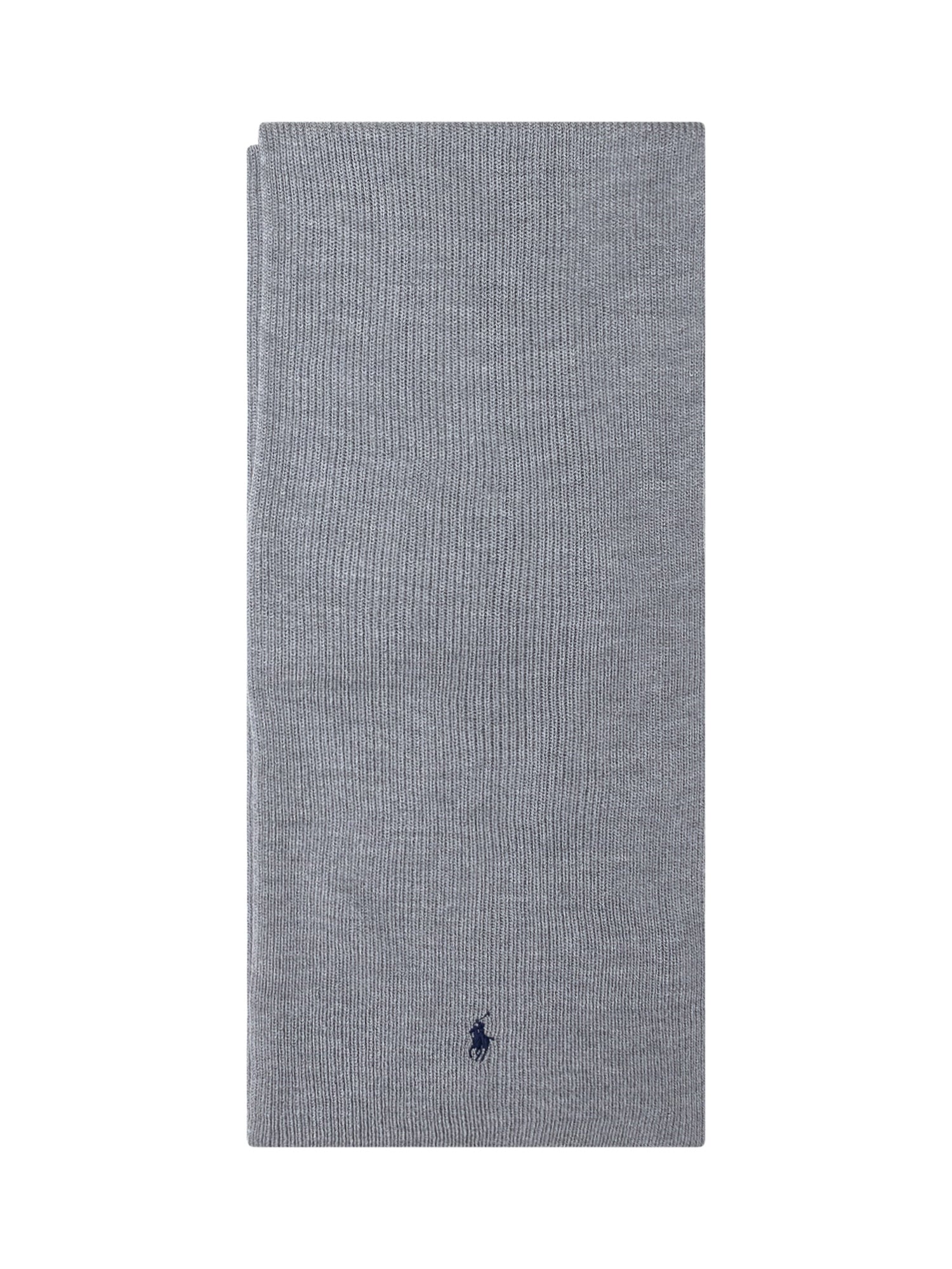 Polo Ralph Lauren grey knit scarf featuring the iconic navy embroidered logo.