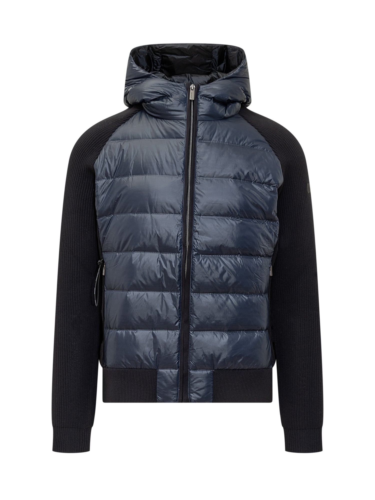 Hooded down jacket with high collar. Zipper closure. Ribbed hems. Two pockets.