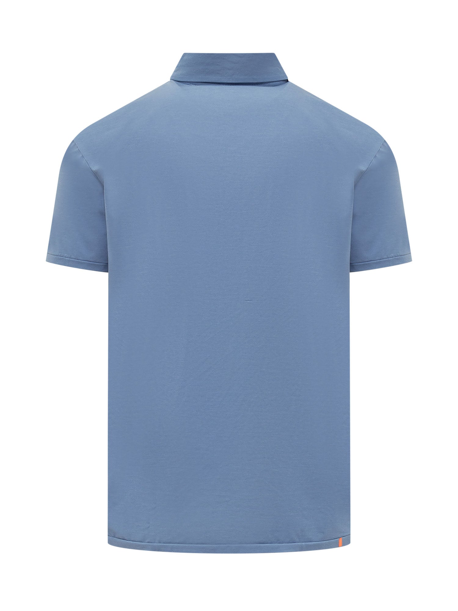 Short-sleeved polo shirt. Classic collar. Button fastening. Blue colour.