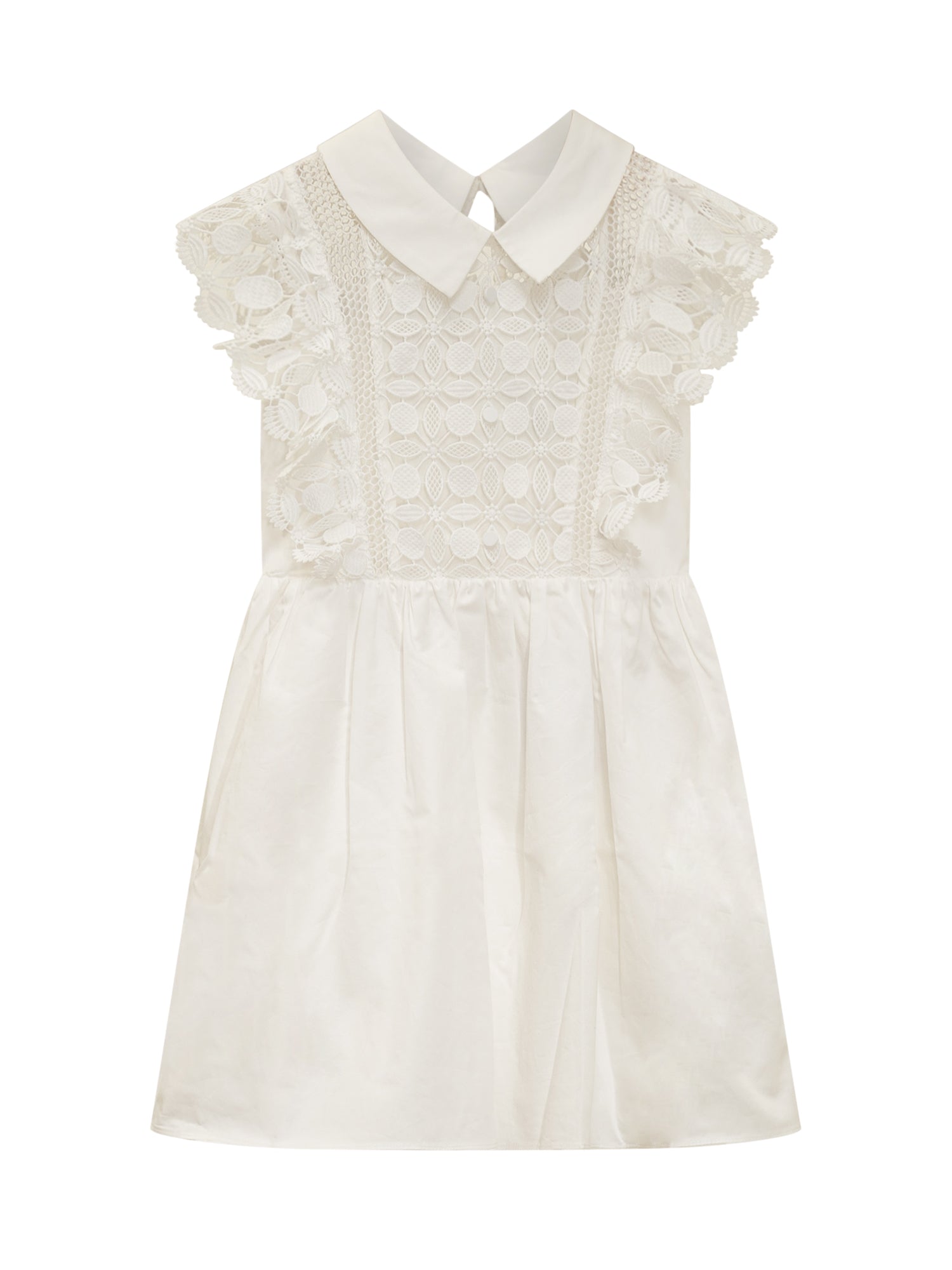 White dress with short sleeves. Floral embroidery on the top. Shirt collar. Zip back closure.