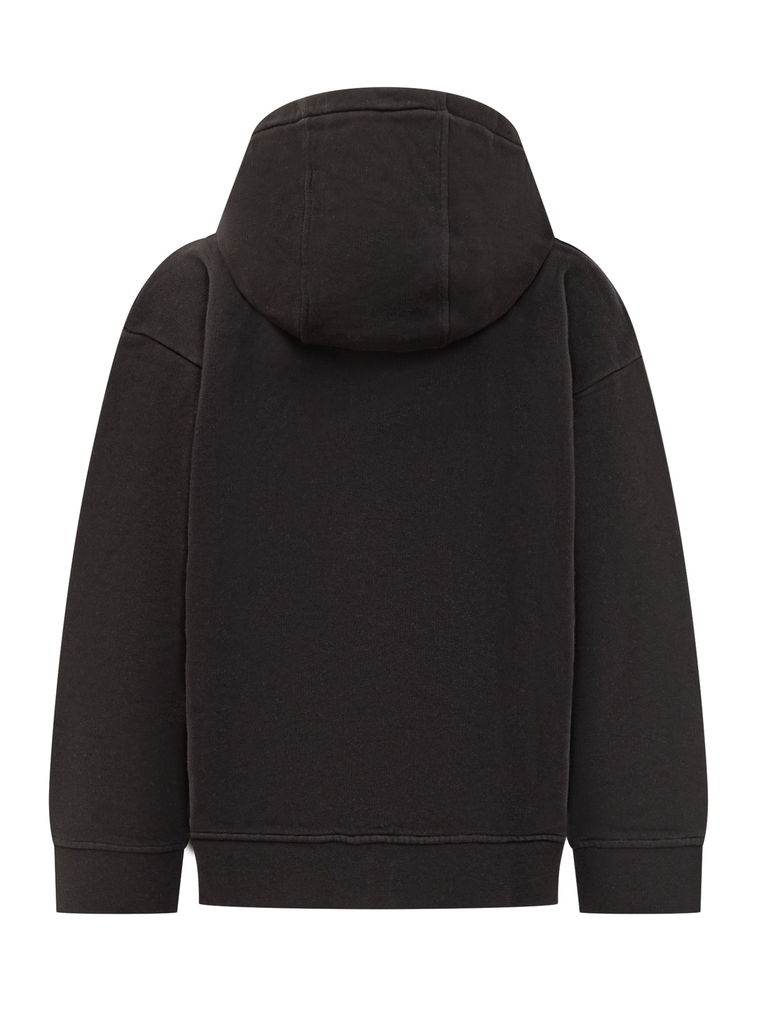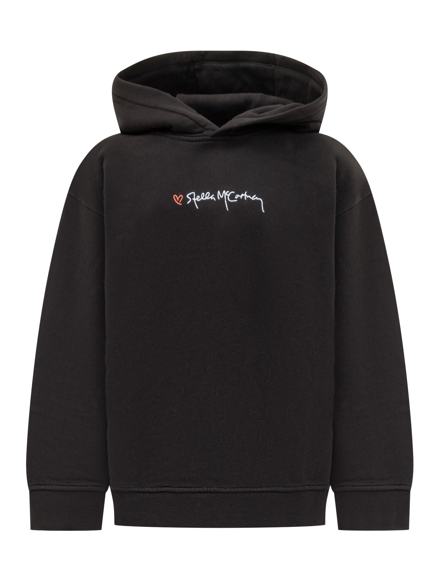 Stella McCartney black cotton hoodie featuring embroidered logo and red heart. Essential and sustainable design.