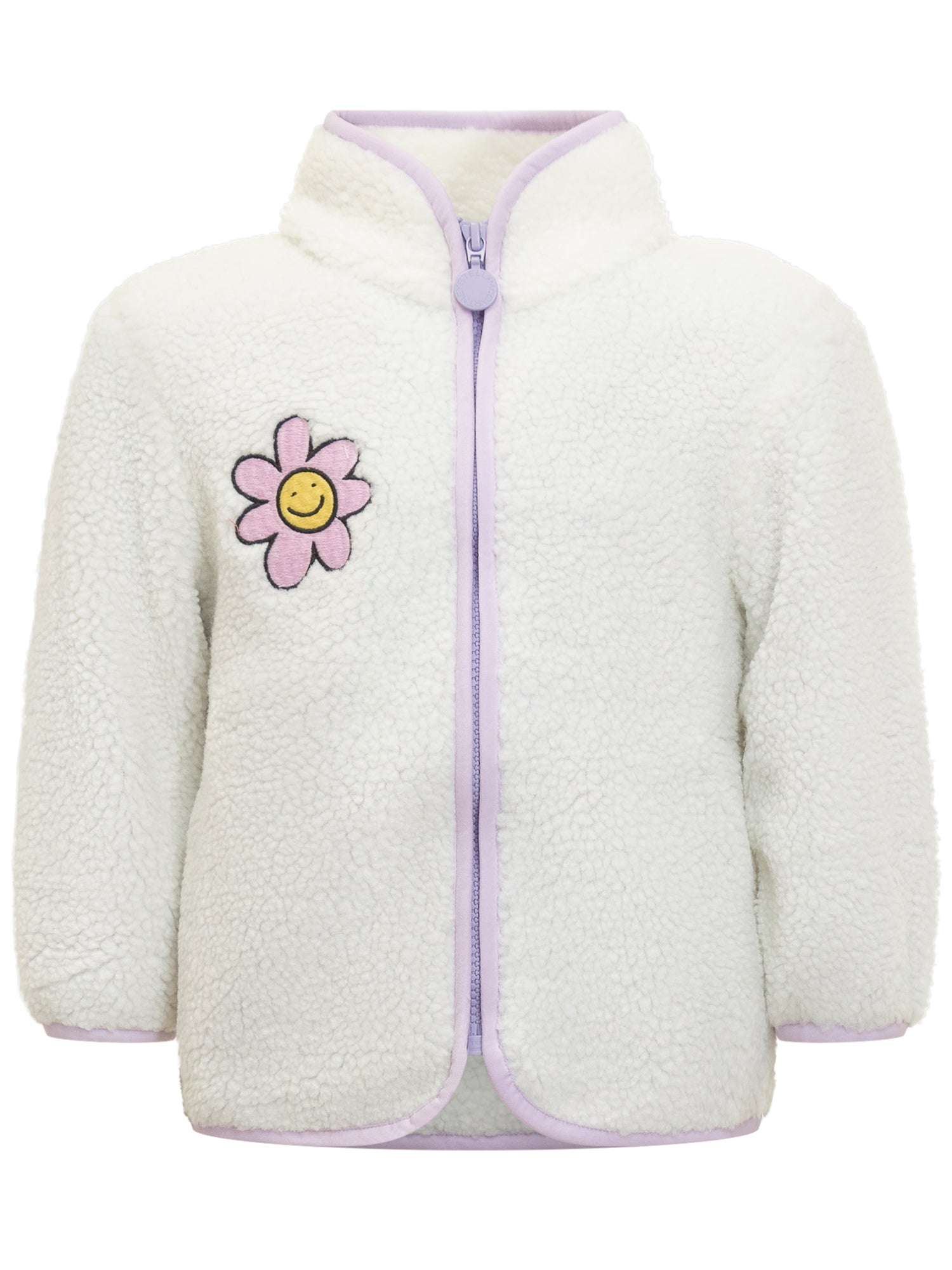 White fleece jacket by Stella McCartney Kids, crafted from ultra-soft sherpa-style fabric. It features lilac trim details and a cheerful flower patch with a smiley face on the chest.