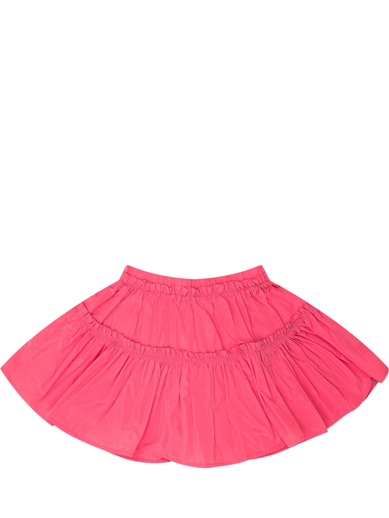 Pink ruffle skirt. Elasticized waistband. Metal logo on the front.