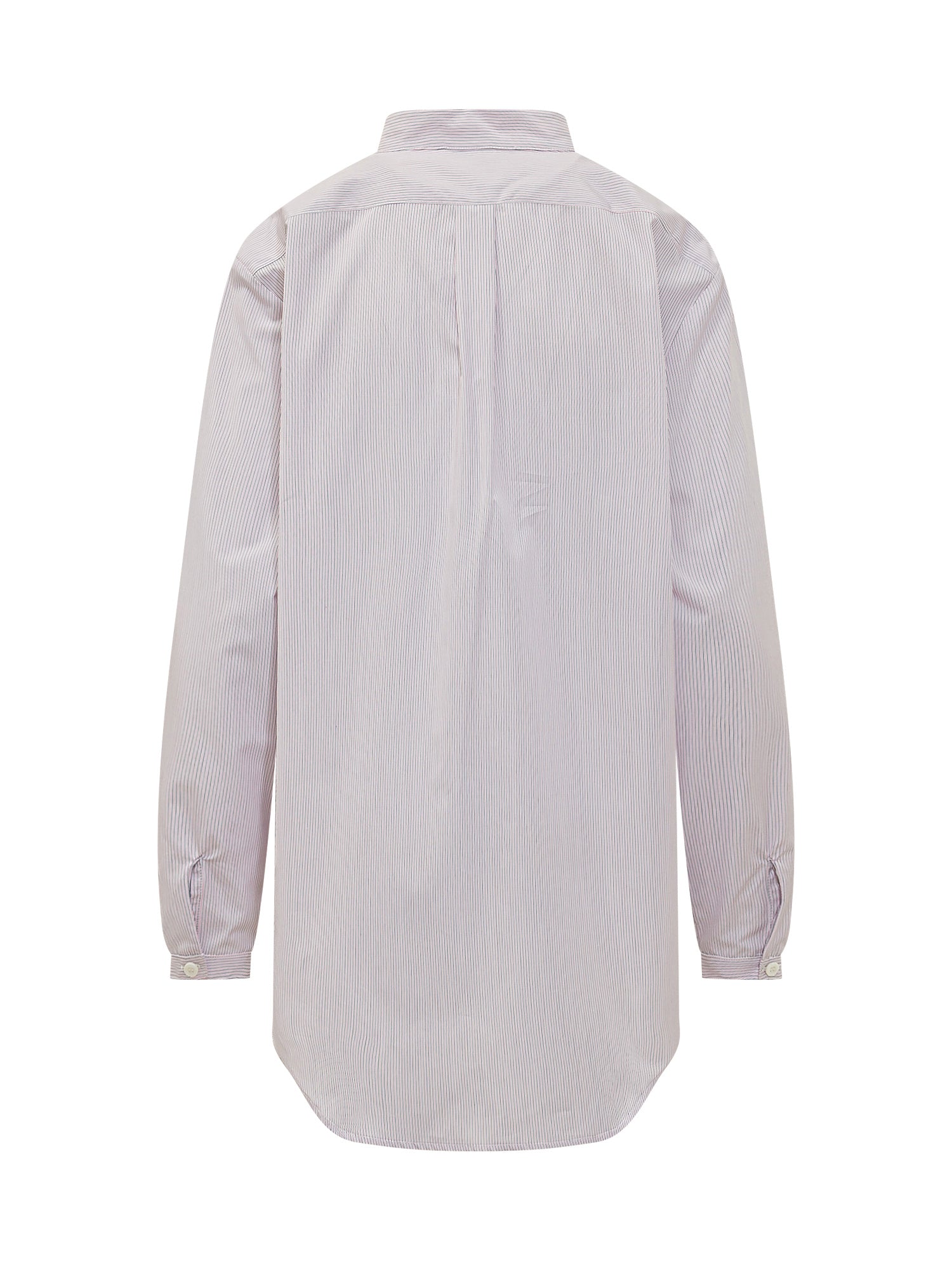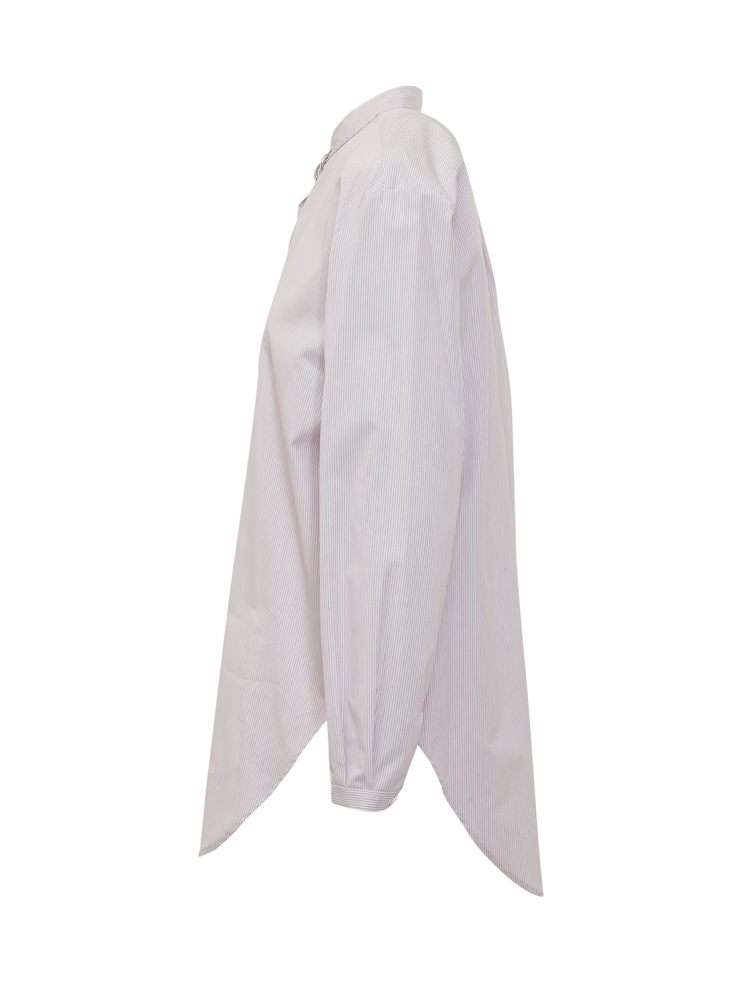Camicia Liona a maniche lunghe con collo coreano e chiusura frontale con bottoni. Motivo a righe verticali e linea allungata con fondo arrotondato. Design ricercato per uno stile contemporaneo.