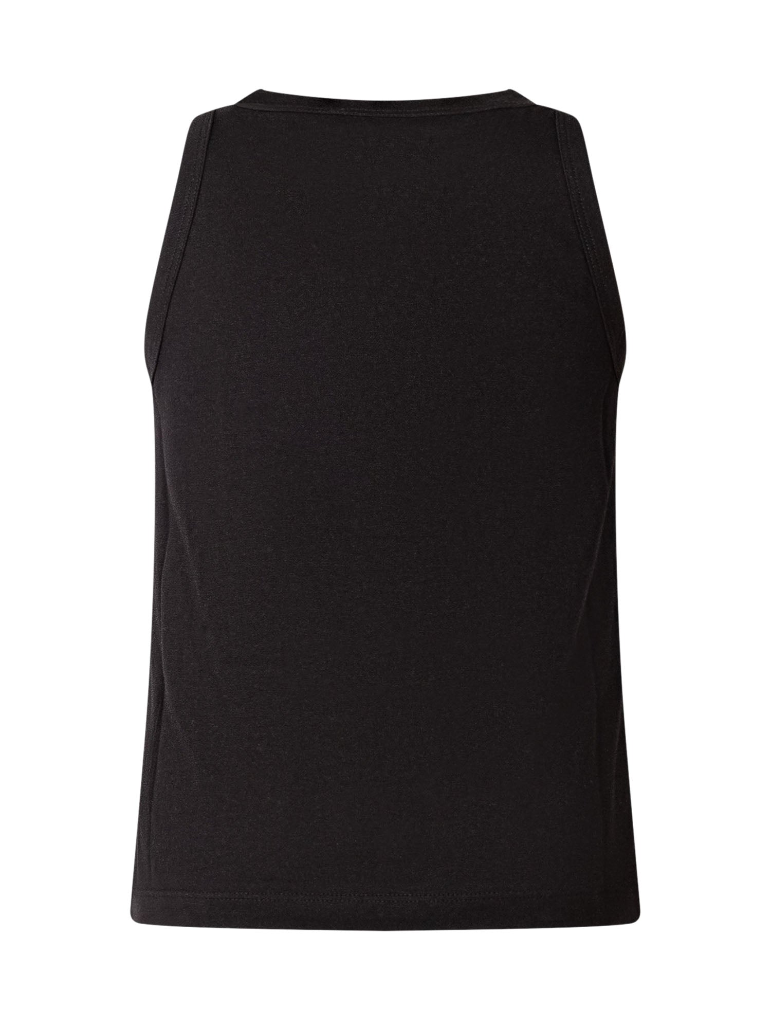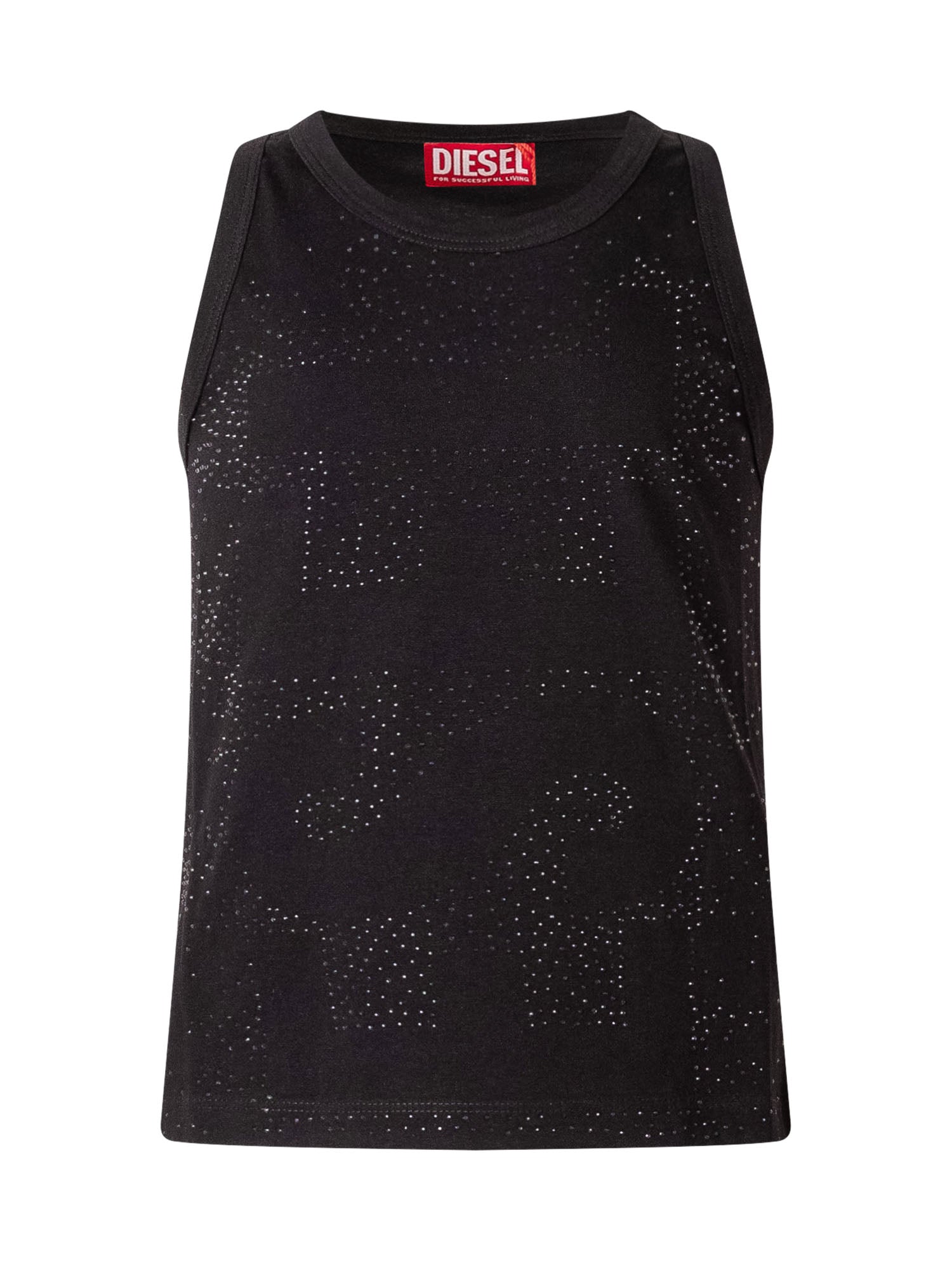 Top senza maniche con scollo rotondo e superficie decorata da applicazioni distribuite sul davanti.