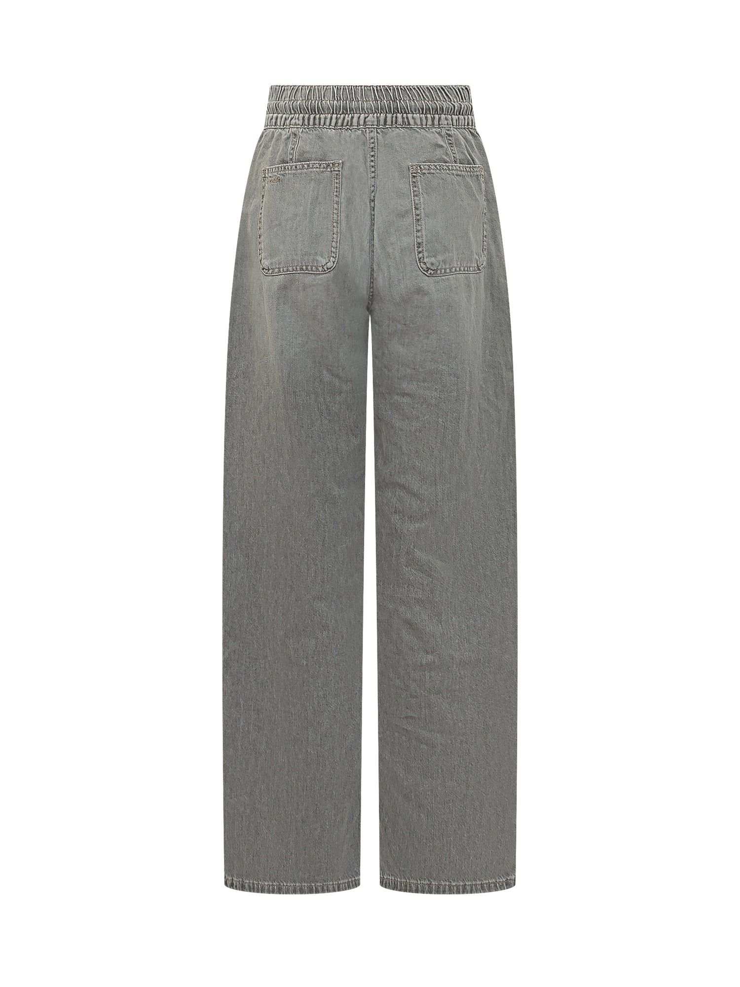 Pantaloni in denim con vita elasticizzata e coulisse regolabile. Tasche applicate e gamba ampia.