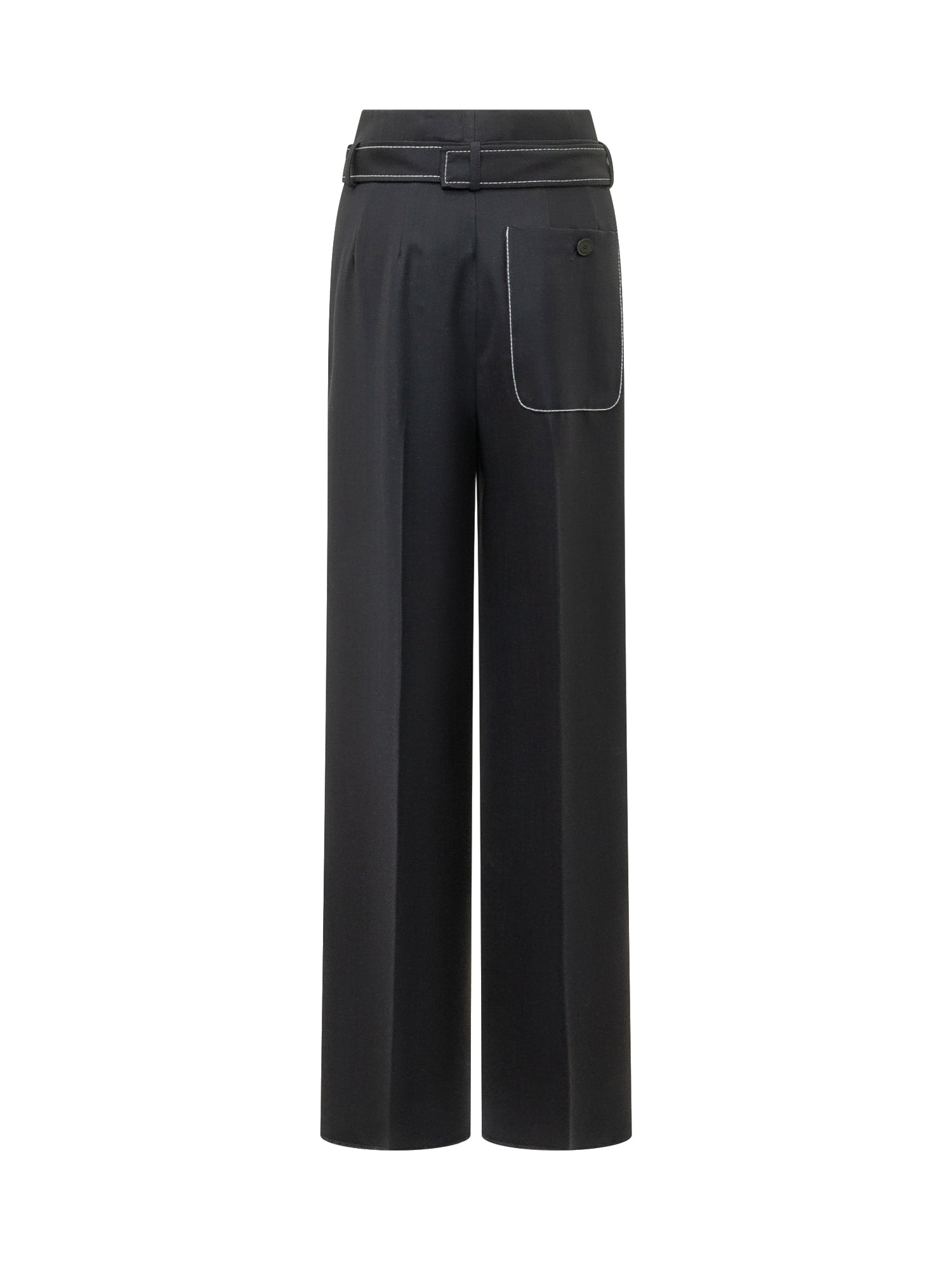 Pantalone con cintura coordinata e fibbia metallica. Chiusura frontale e gamba dritta con piega centrale per un look elegante e definito.