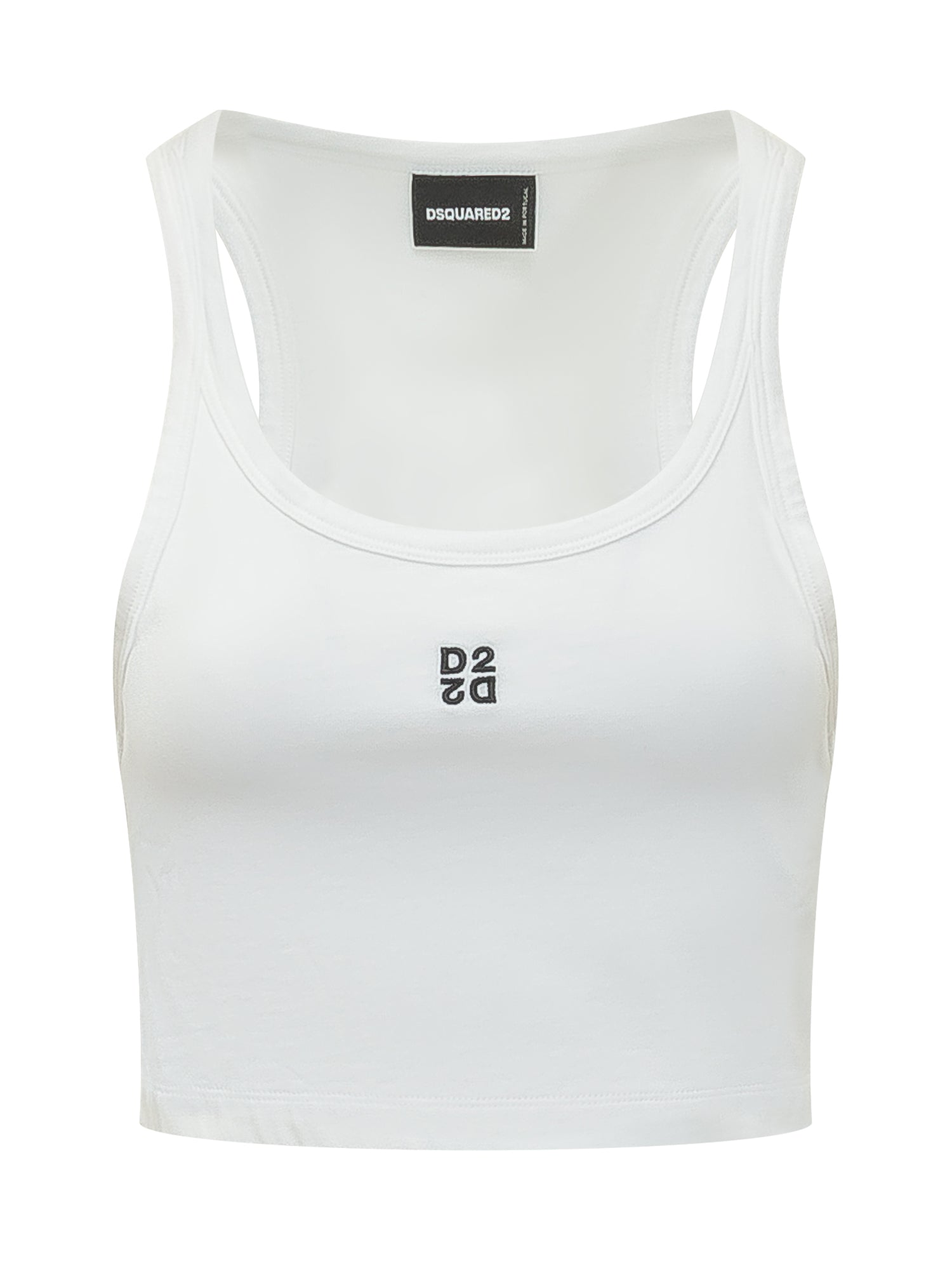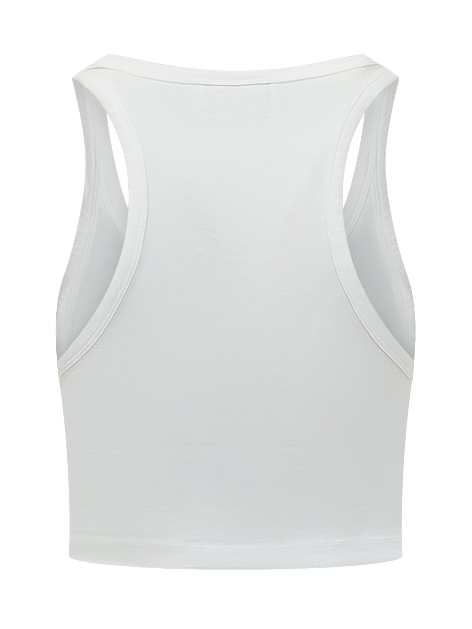 Top corto con taglio sportivo, scollatura ampia e spalle larghe. Realizzato in jersey elasticizzato con logo minimal sul davanti.