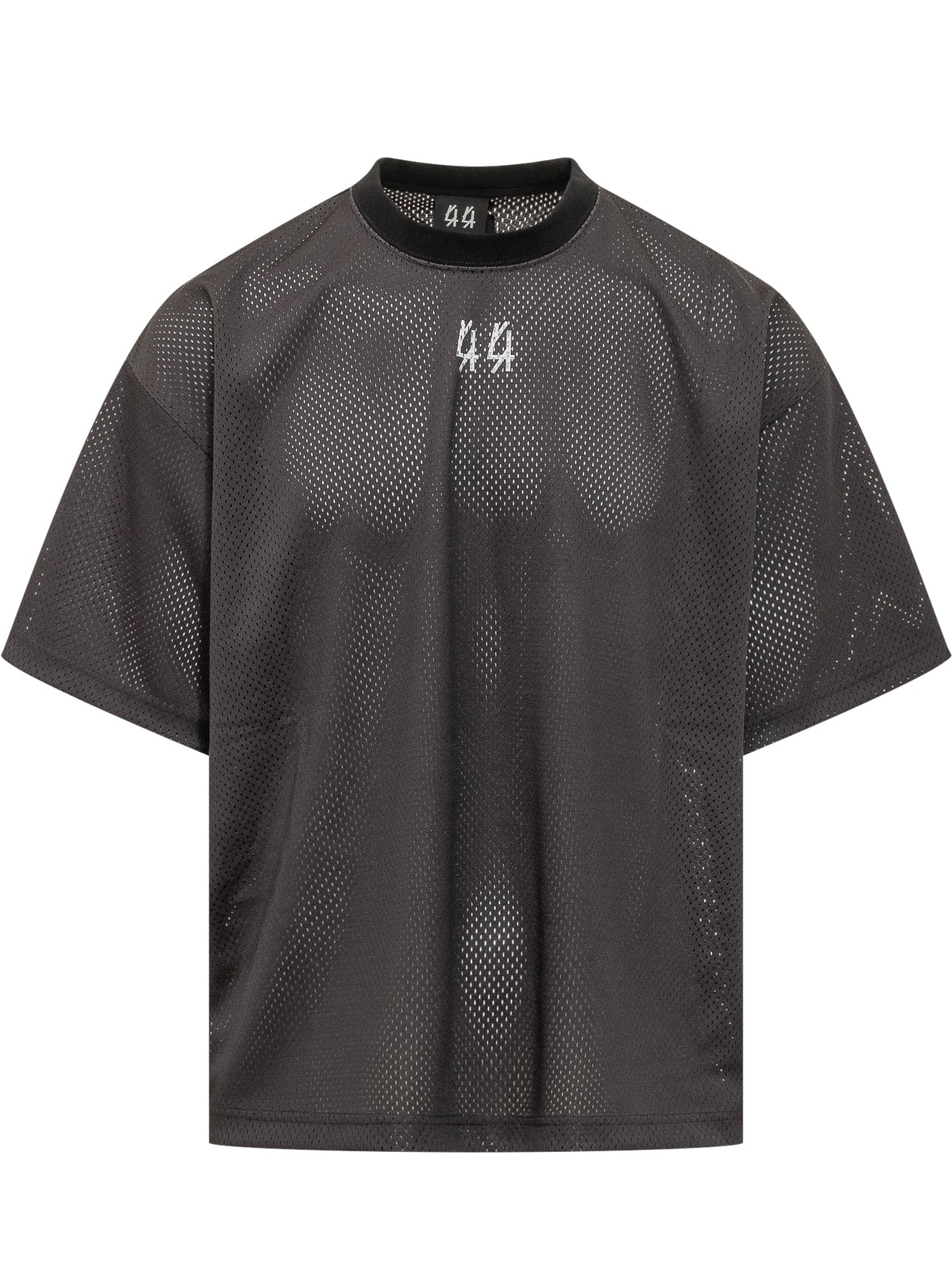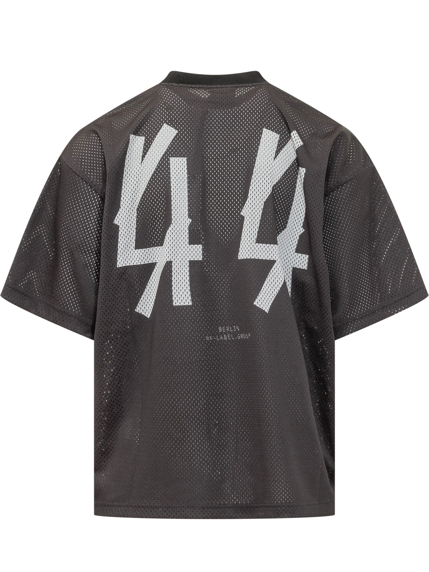 Maglia stile soccer in rete traspirante, maniche corte e girocollo, logo sul petto e maxi stampa sul retro.
