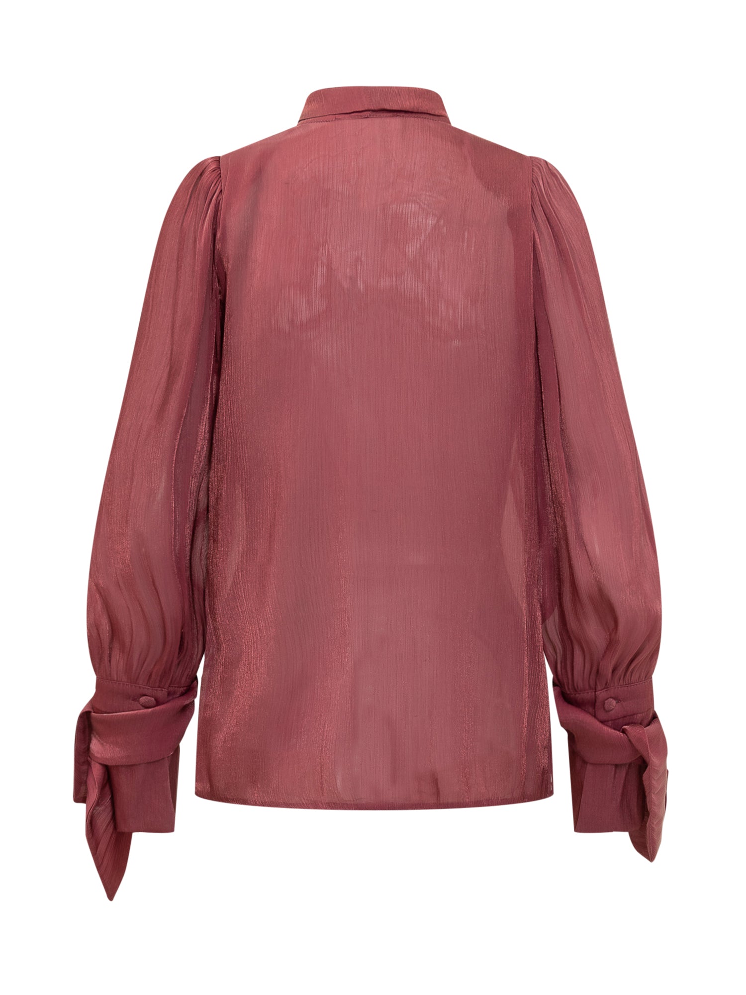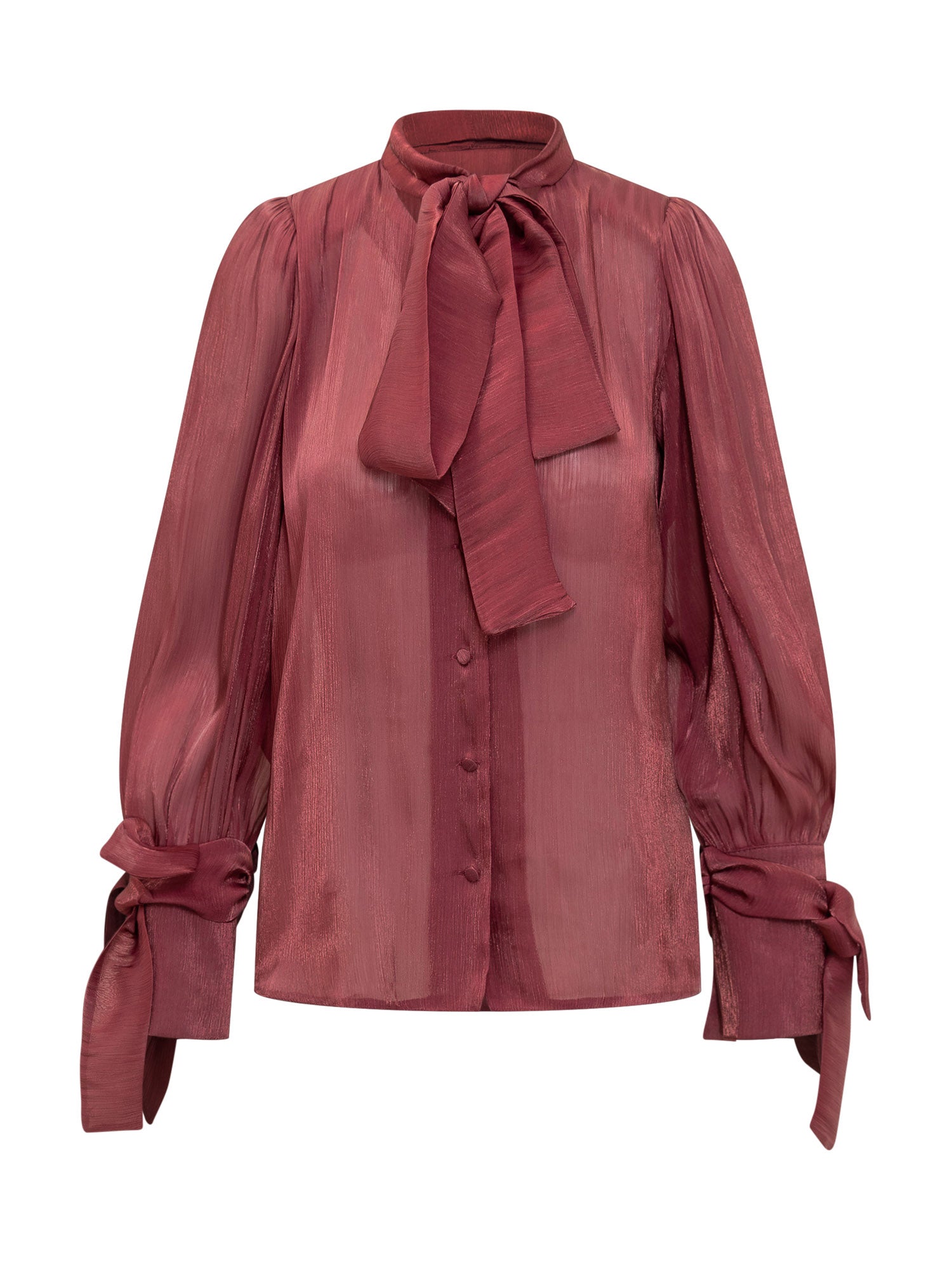 Blusa Actualee in tessuto satinato color bordeaux con fiocco al collo e polsini con nastri.