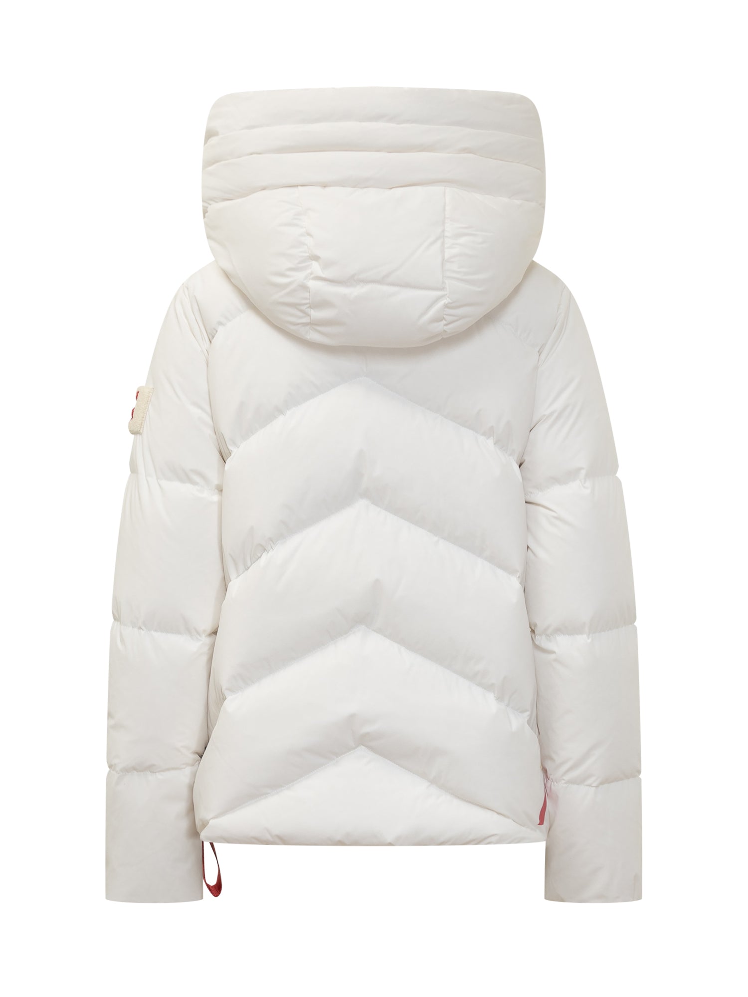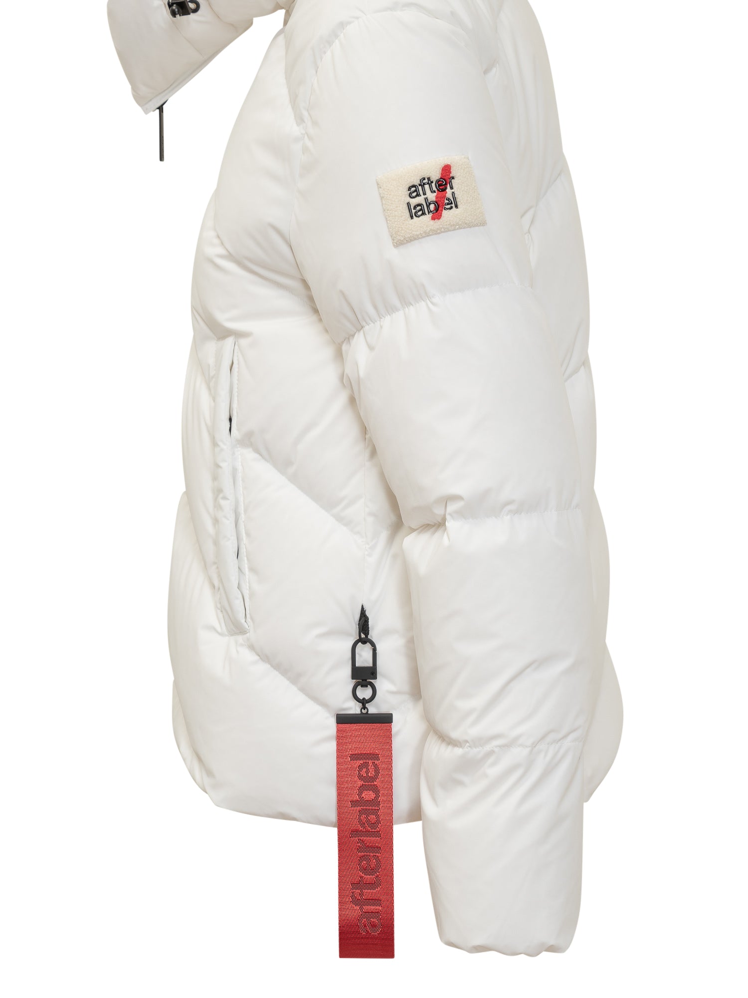 Piumino After Label bianco con trapuntatura a chevron e cappuccio regolabile. Imbottitura calda e silhouette moderna.