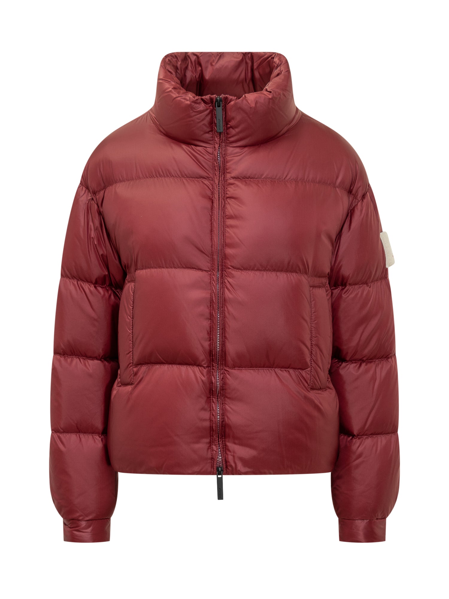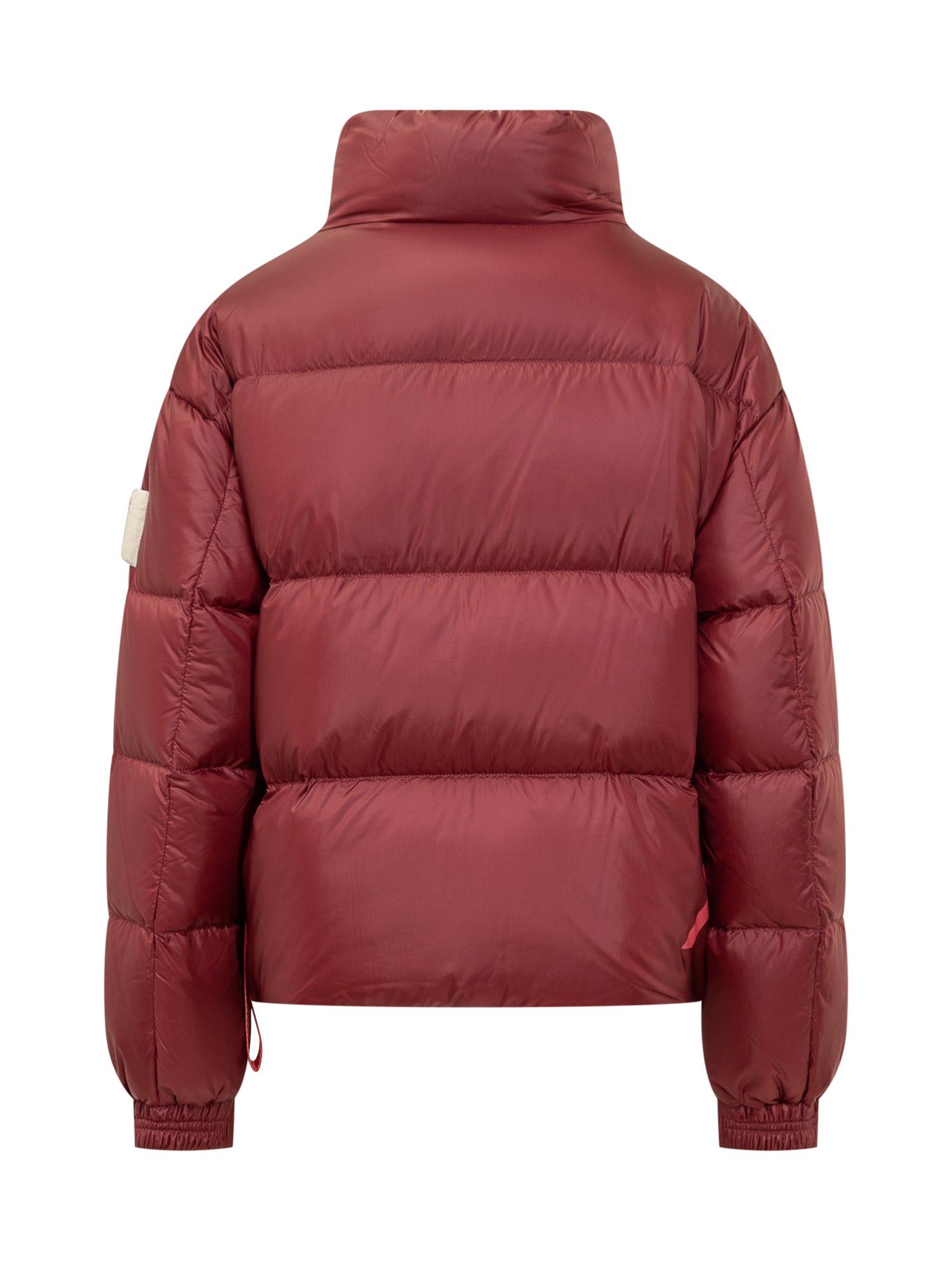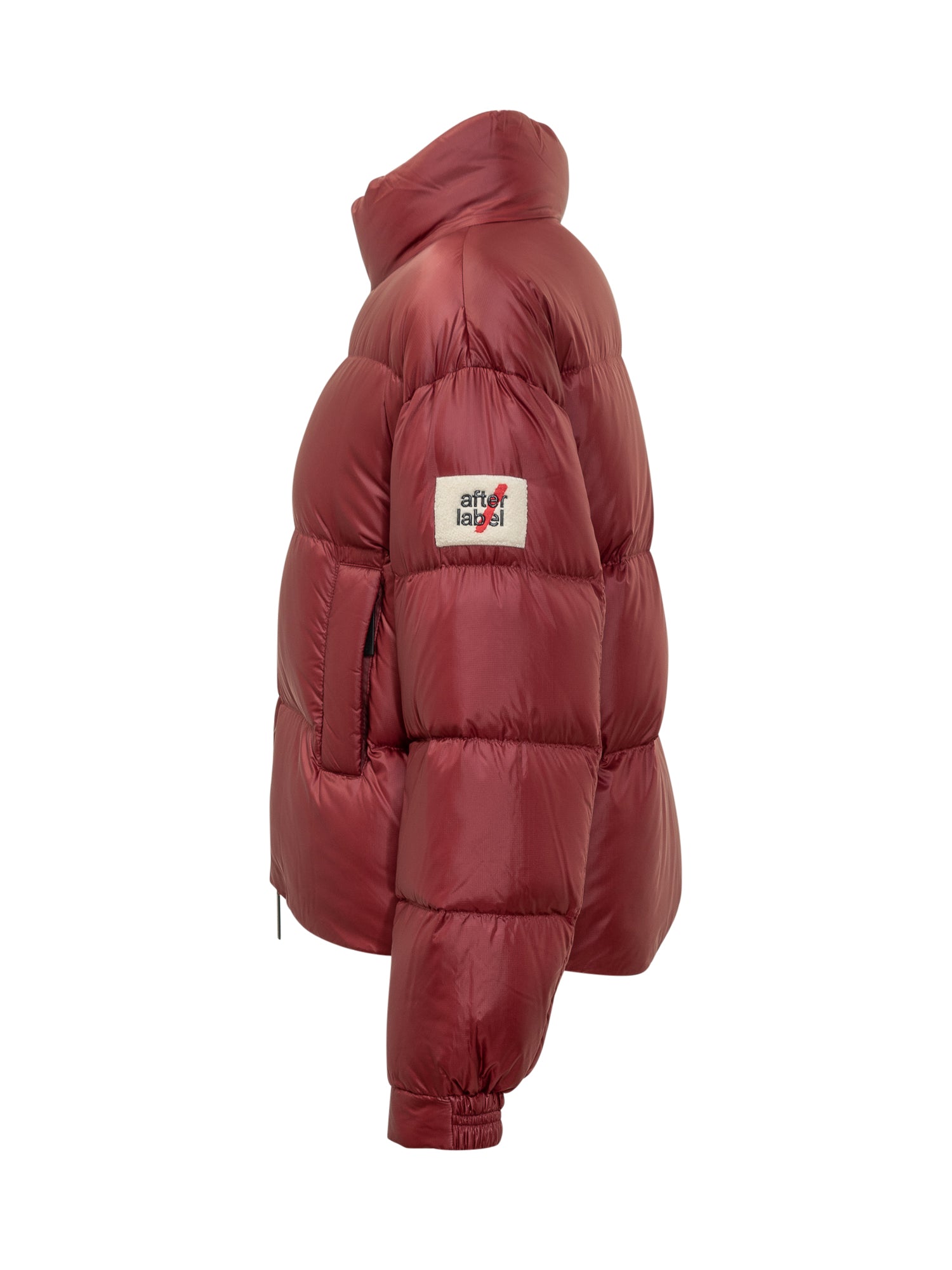 Piumino After Label bordeaux dal taglio corto con collo alto e chiusura zip. Realizzato in tessuto tecnico lucido.