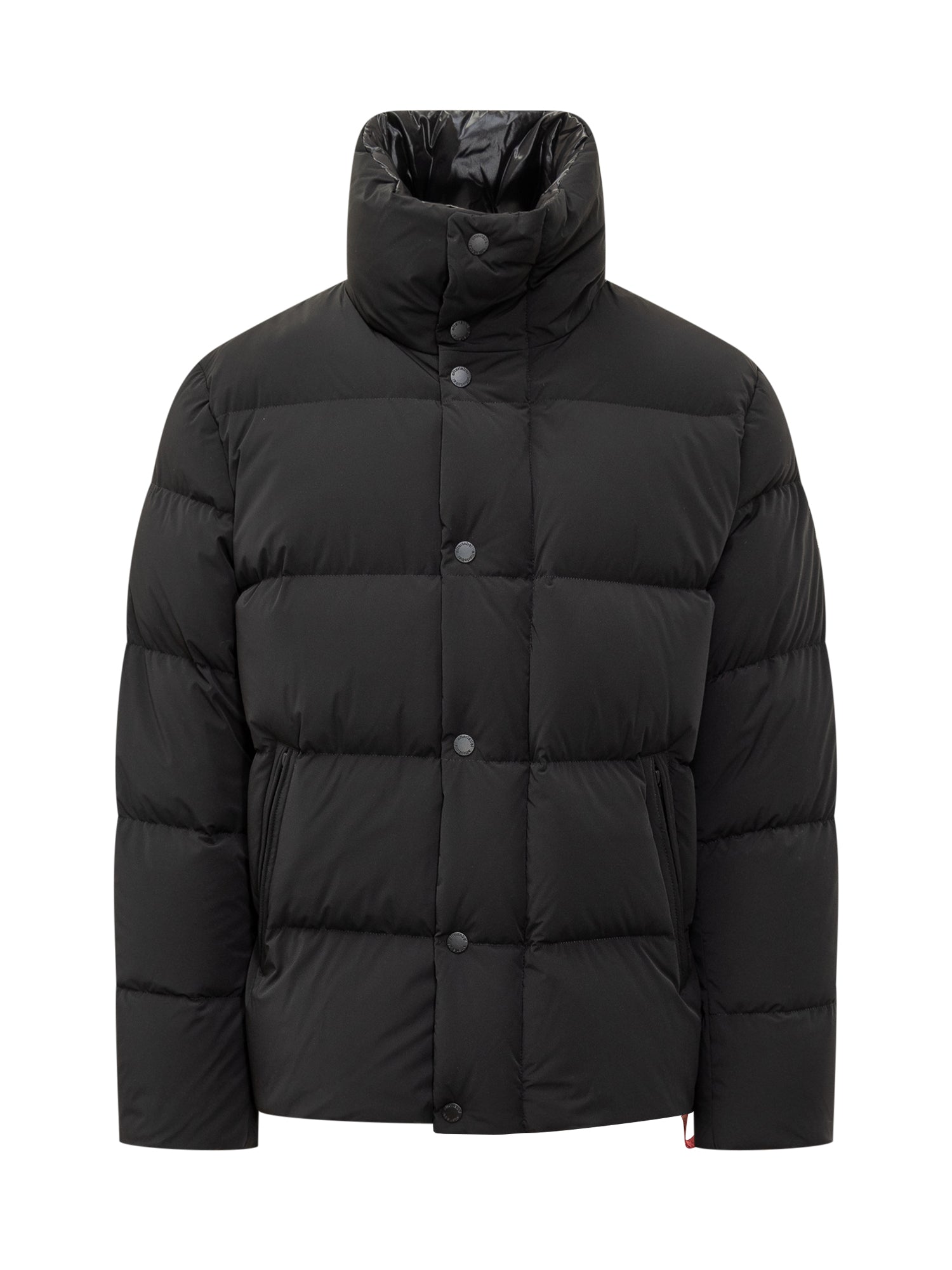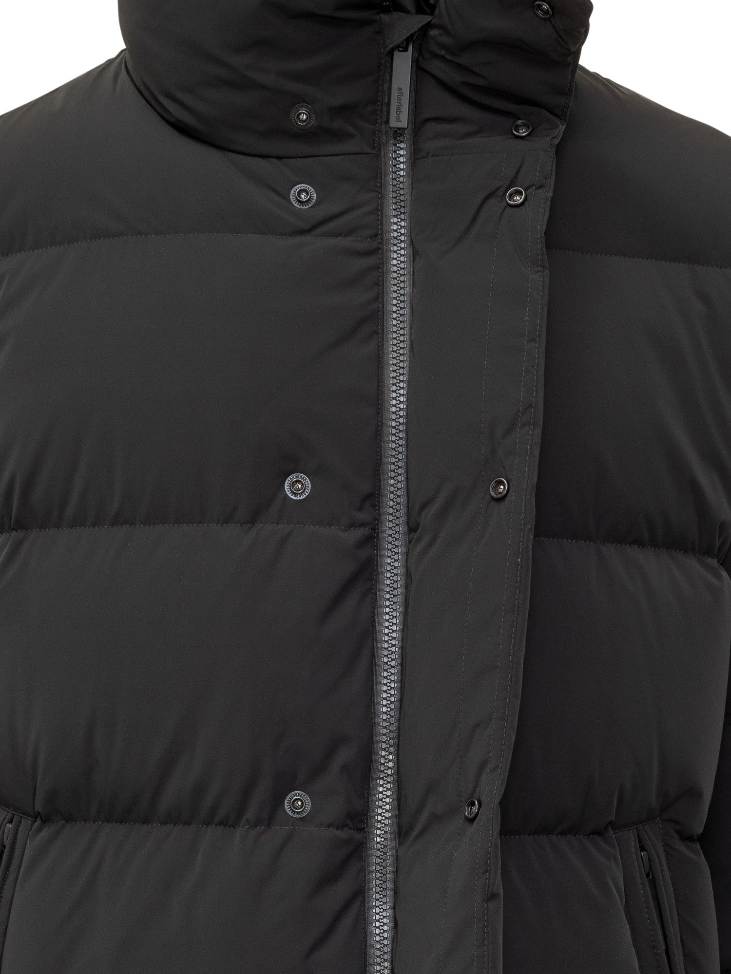 Piumino After Label in nylon nero con imbottitura calda, chiusura a bottoni automatici e tasche laterali con zip. Design minimale e confortevole.