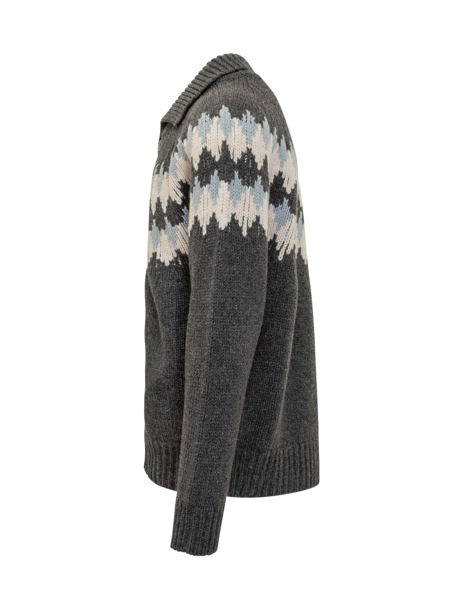 Cardigan Alanui in lana grigia con motivo geometrico multicolore a contrasto.