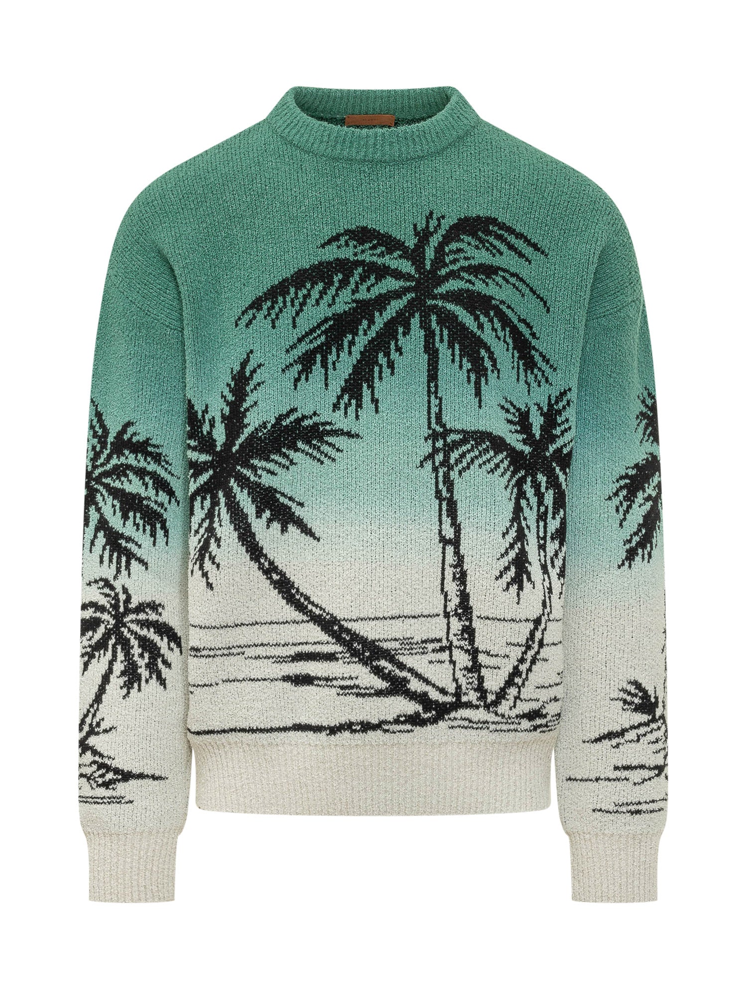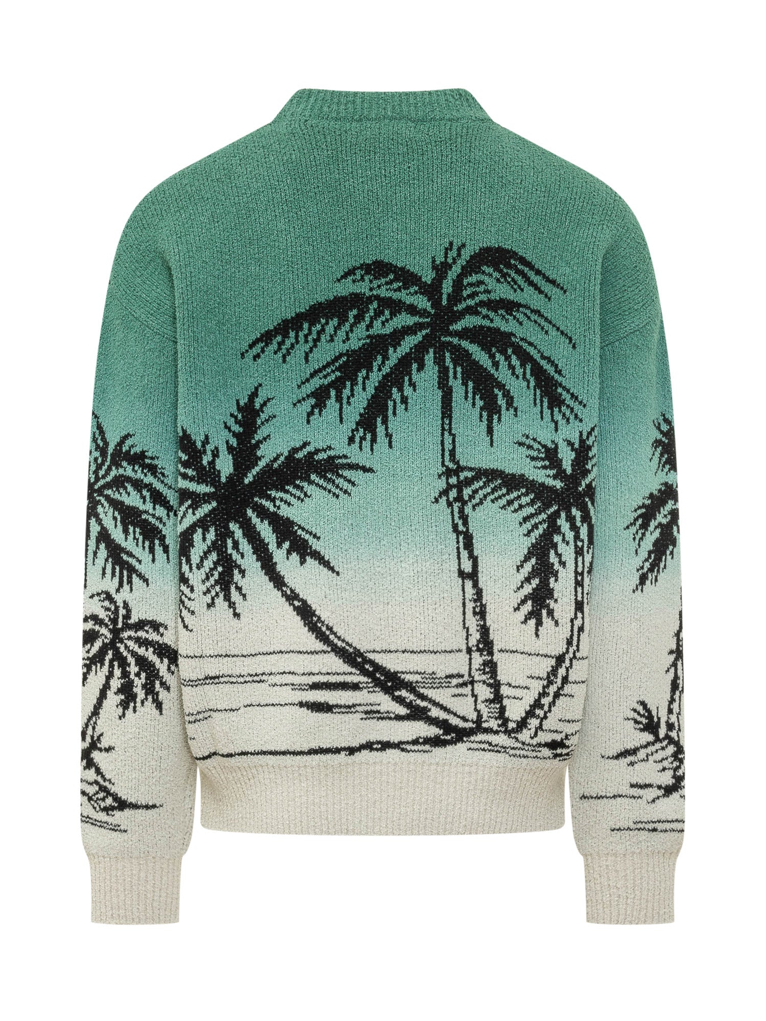 Maglione in maglia dalla vestibilità regolare con motivo palme jacquard all over. Girocollo classico, maniche lunghe e finiture a costine su collo, polsi e fondo. Texture morbida e lavorazione ricercata.