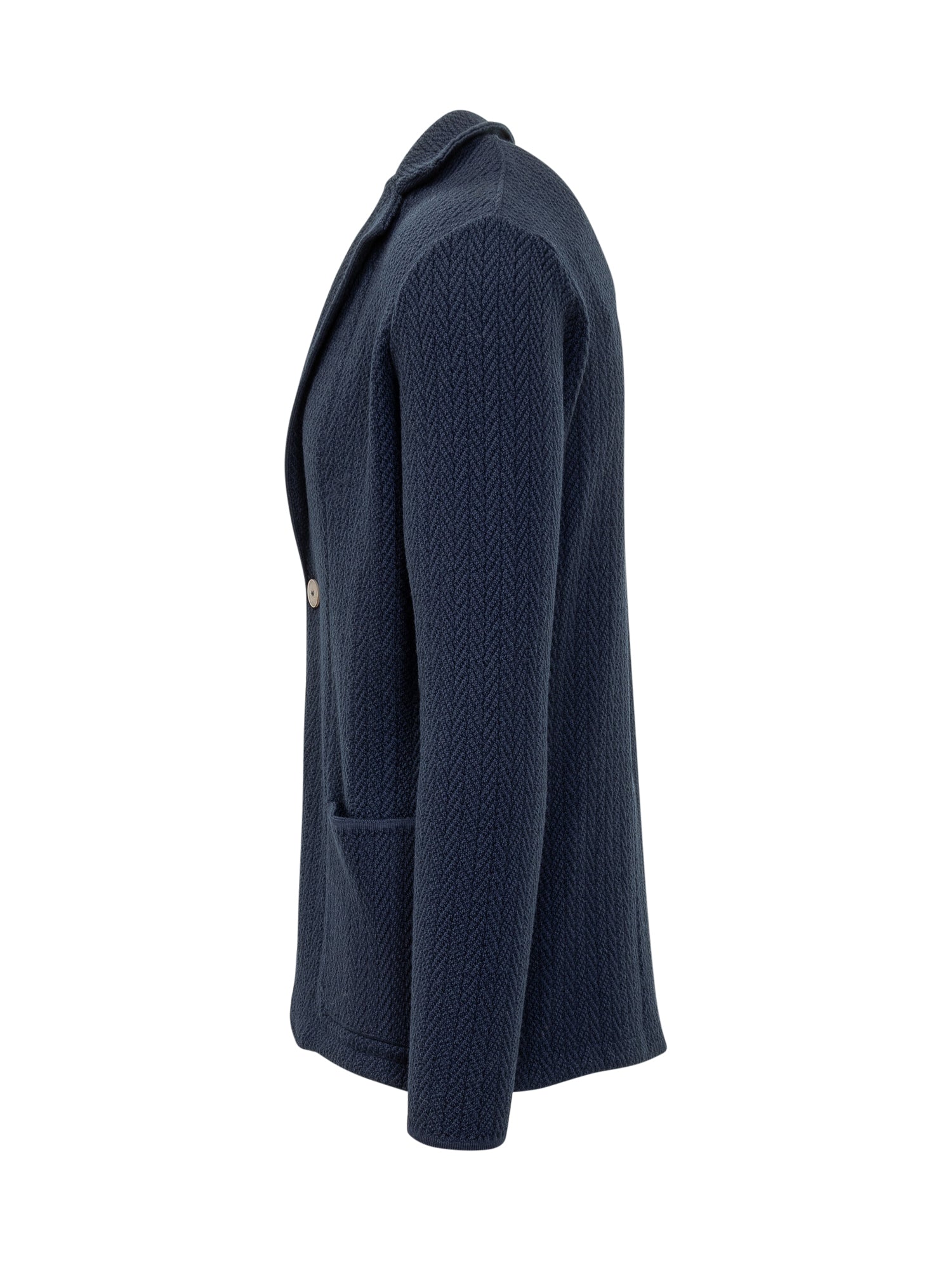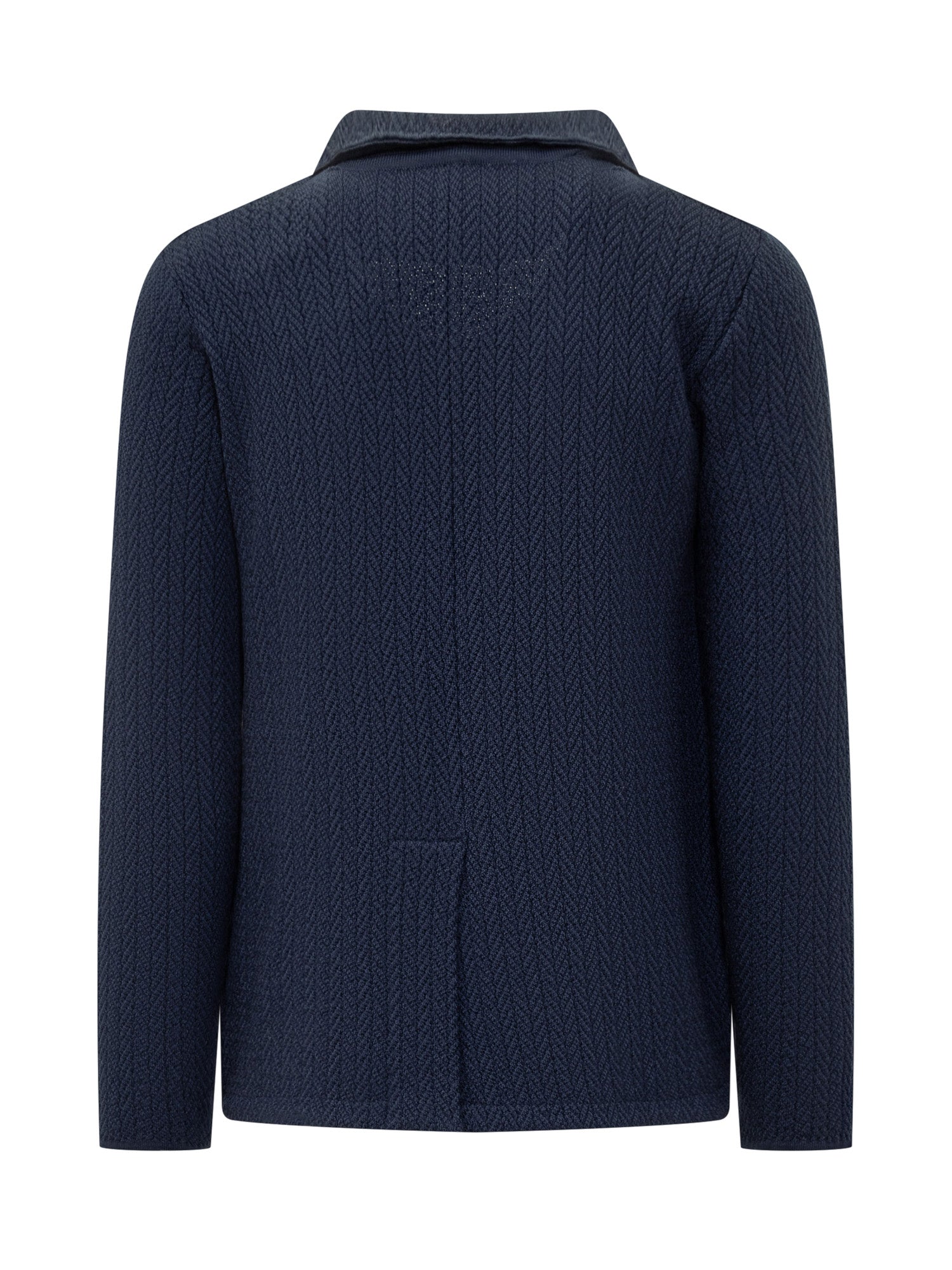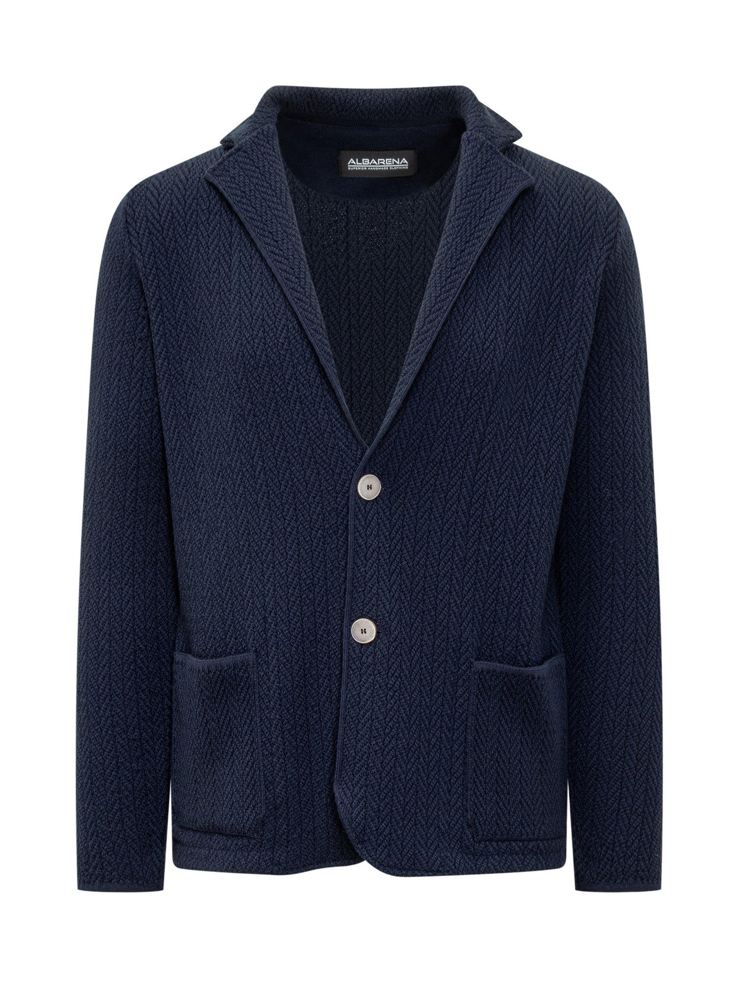 Giacca Albarena in maglia blu con texture a spigato, chiusura a due bottoni e tasche applicate.
