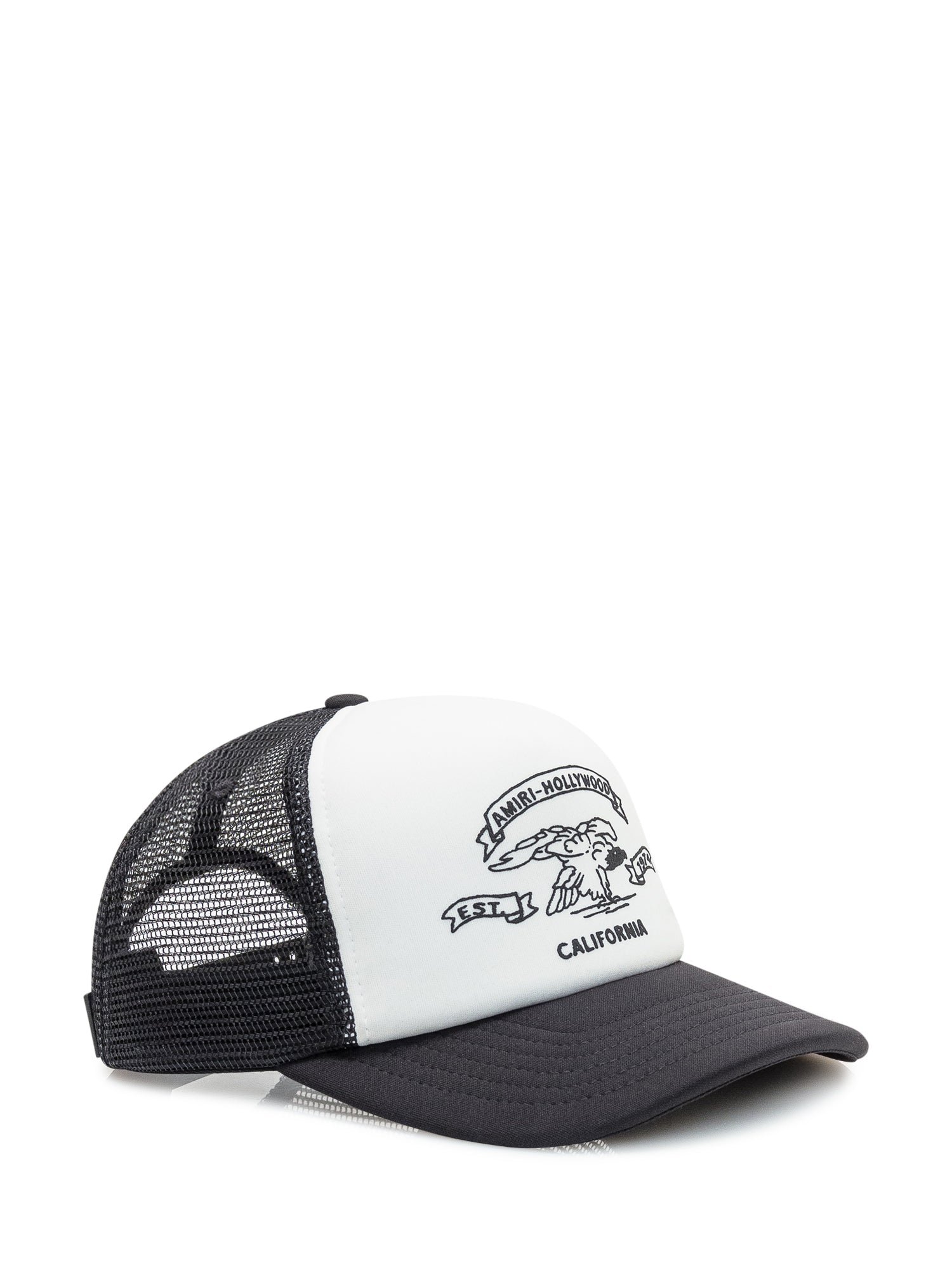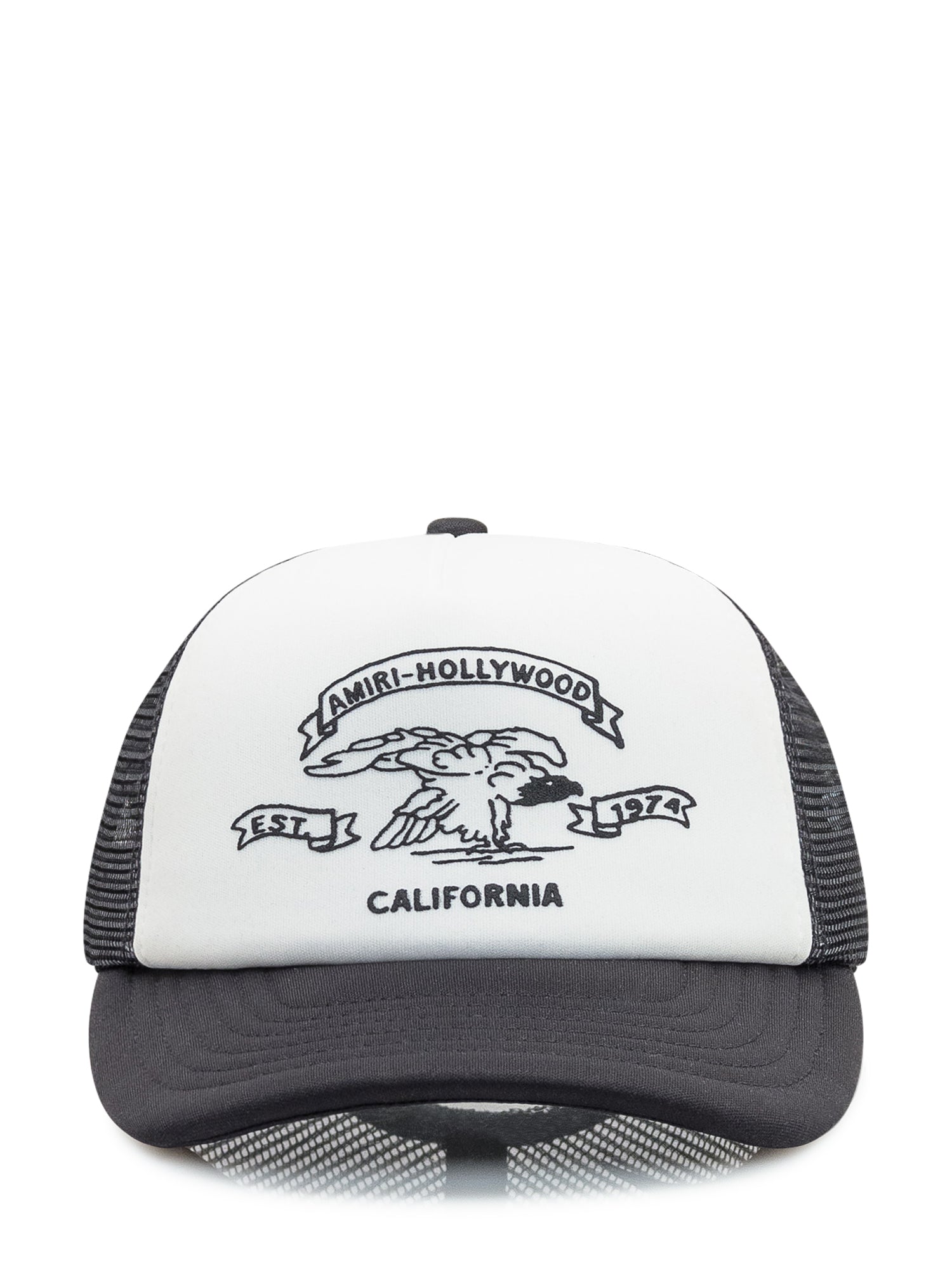 Cappellino trucker con grafica aquila e ricamo California. Modello casual con retro in mesh e chiusura regolabile.